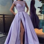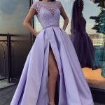 Атласное платье макси для выпускного вечера лавандового цвета с иллюзионным вырезом и высоким разрезом (стиль № GDC1103)