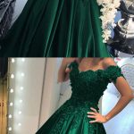 Изумрудно-зеленое бальное платье с открытыми плечами и аппликацией для выпускного вечера