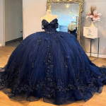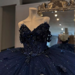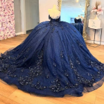 Элегантное бальное платье темно-синего цвета для quinceañera, сшитое из многослойного тюля, создающего пышный объем и грациозные движения. Пришитые вручную цветочные аппликации и расшитый бисером корсет с кристаллами придают объем и обеспечивают структурированную поддержку. Шнуровка на спине и встроенный бюстгальтер позволяют надежно и регулируемо формировать фигуру для идеальной посадки. Дизайн без рукавов и обработанный подол создают классический силуэт для торжественных мероприятий.
