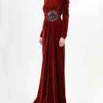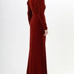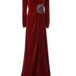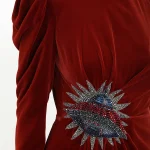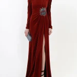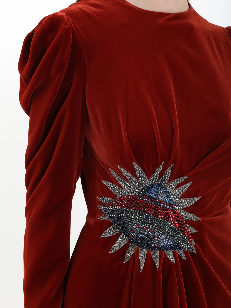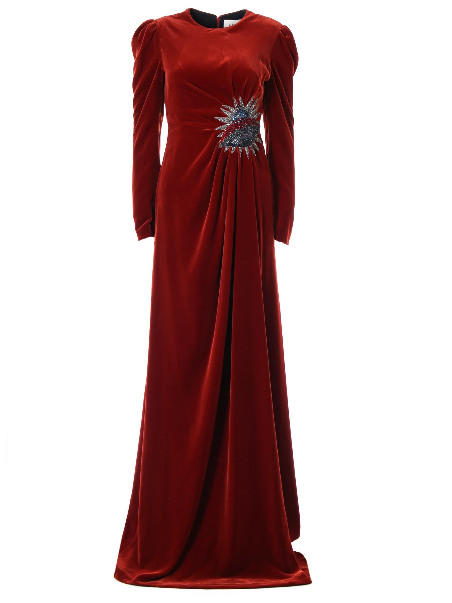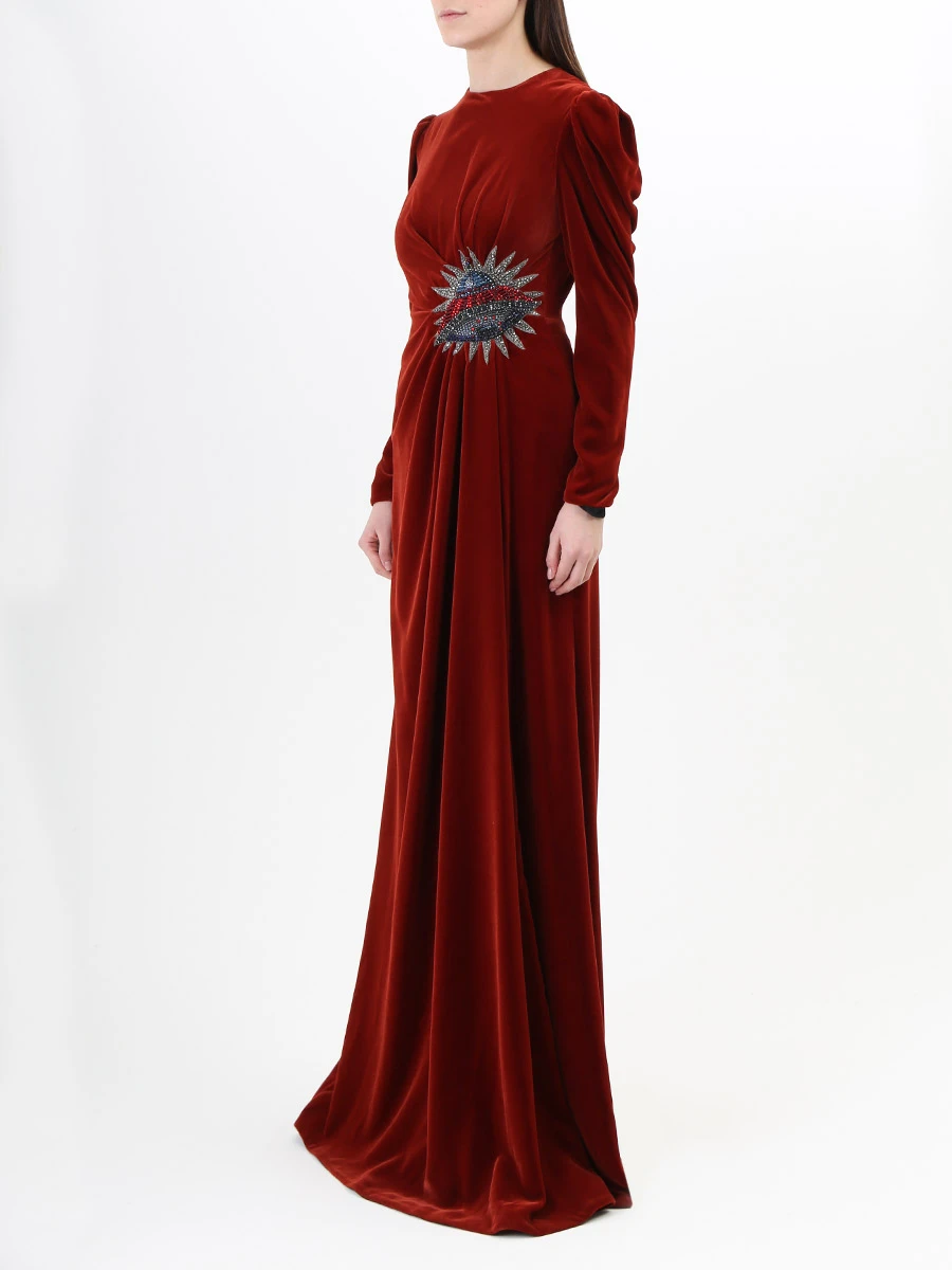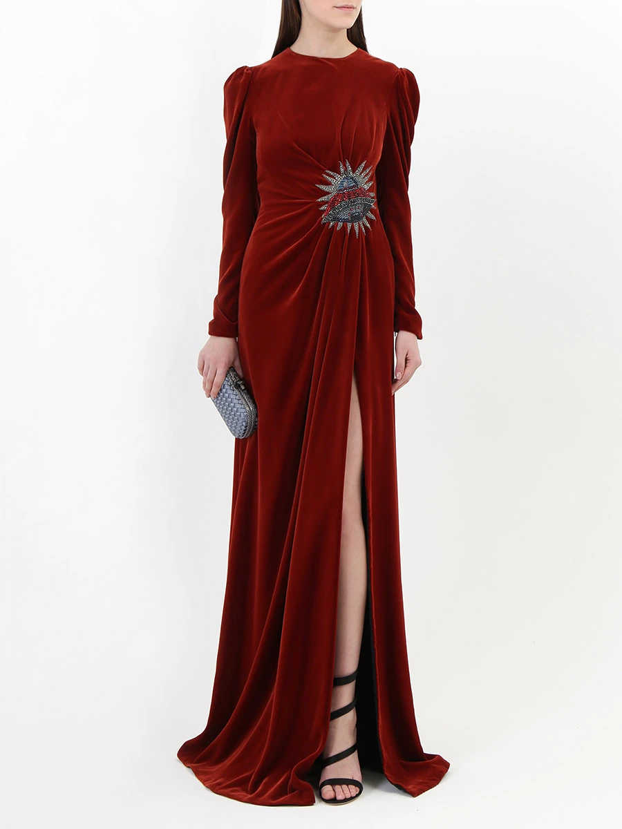 -Бархатное платье в пол с высоким разрезом от GUCCI. -Круглый вырез горловины, длинные рукава, изящные драпировки, отделка нашивкой со сверкающими стразами и бисером, застежка — молния.