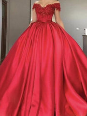 Атласное красное бальное платье с кружевными аппликациями и открытыми плечами.