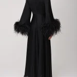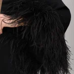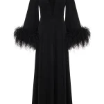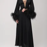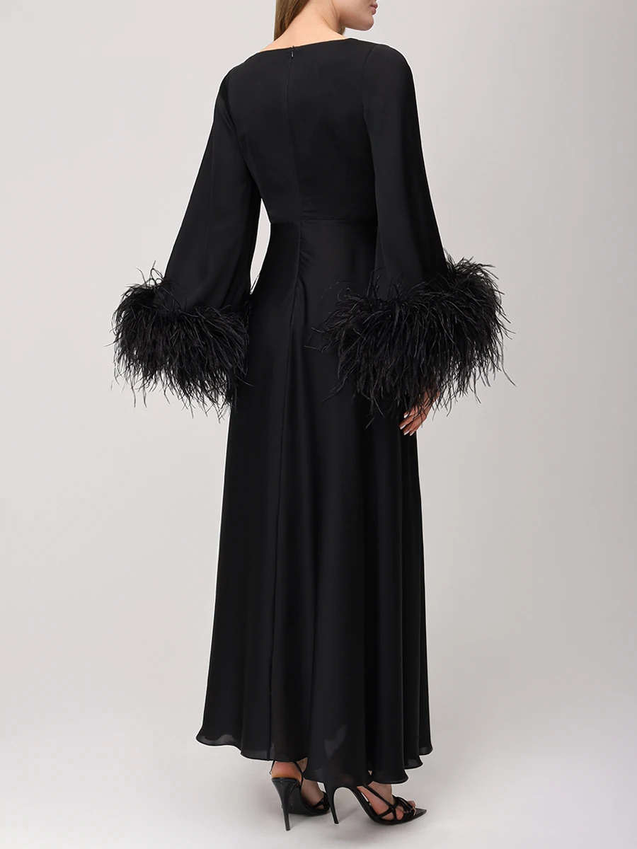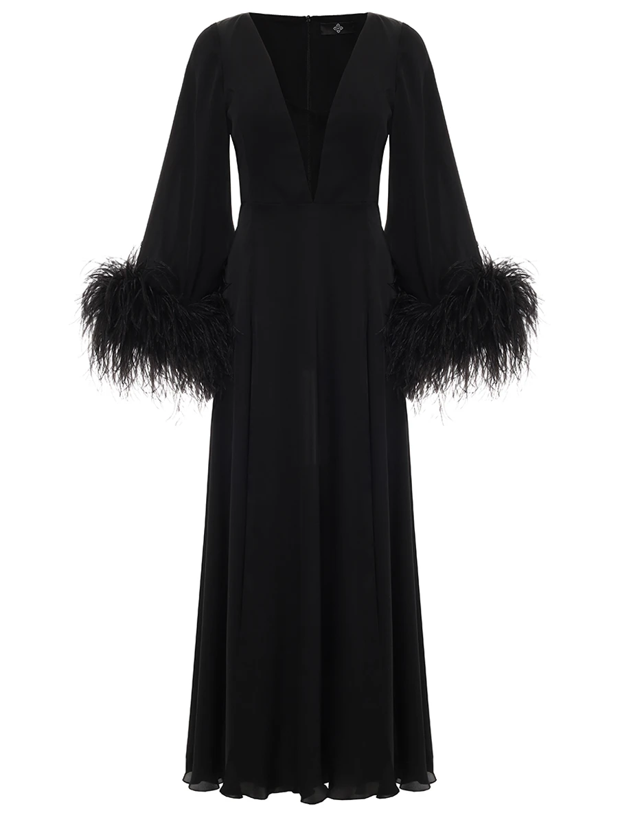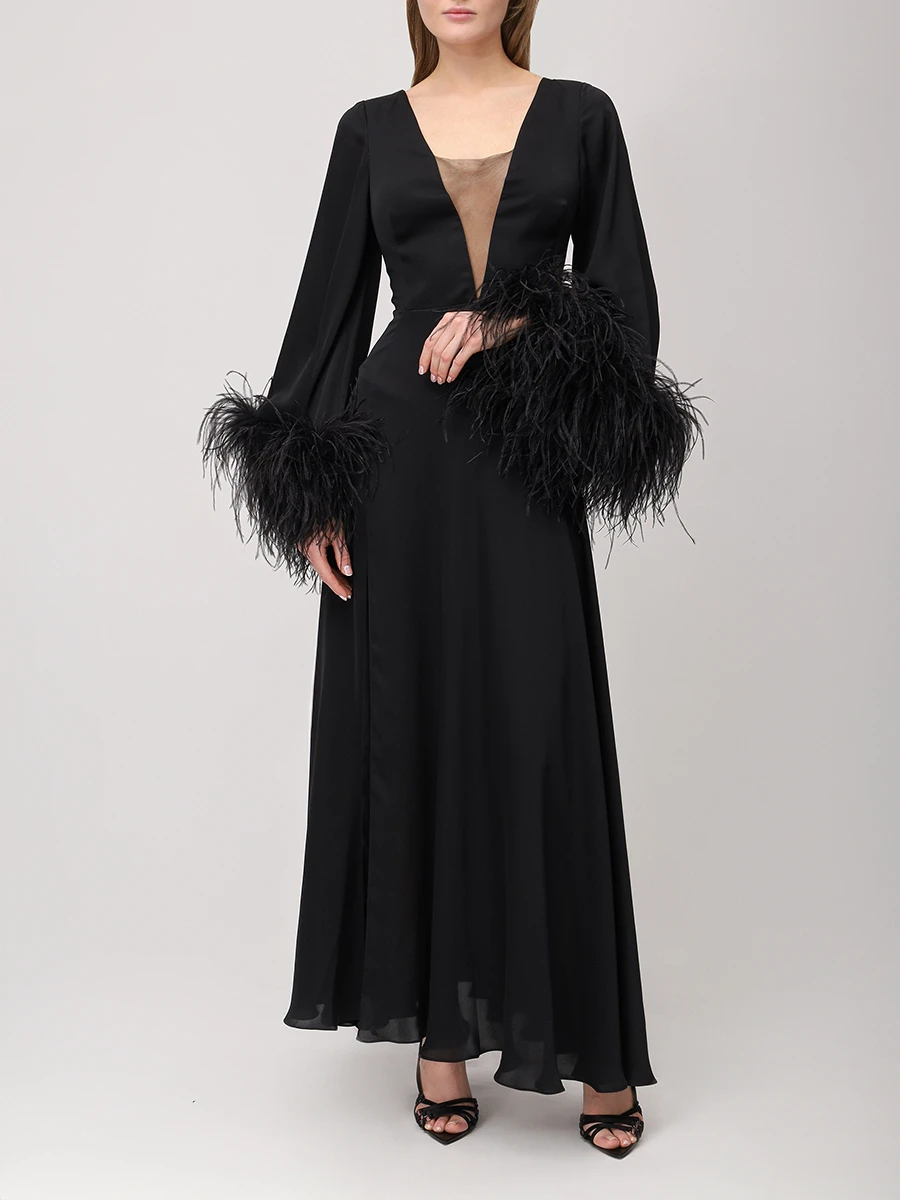 -Черное платье из нежного шелка от WHITE LILY. -Модель приталенного кроя с глубоким вырезом декольте, прикрытым полупрозрачной вставкой из сетки, длинными расклешенными рукавами с отделкой перьями страуса и застежкой на потайную молнию. -Классические линии кроя платья идеально обрисовывают женственный силуэт. Доставка товара осуществляется при условии предварительной оплаты картой на сайте (кроме заказов на самовывоз в Москве, Казани и Санкт-Петербурге). ВАЖНО! Изделие имеет индивидуальный крой, подберите размер по Вашим объемам или обратитесь к нам, и мы поможем сделать выбор (замеры в см, ОГ — обхват груди, ОТ — обхват талии, ОБ — обхват бедер, ДР — длина рукава, ШС — ширина спины, ШГ — ширина груди). XS: ОГ 84, ОТ 66, ОБ 92, ДР 55-57, ШС 33, ШГ 32. S: ОГ 88, ОТ 70, ОБ 96, ДР 57-58, ШС 34, ШГ 32,5. М: ОГ 92, ОТ 74, ОБ 100, ДР 58-59, ШС 35, ШГ 33. L: ОГ 96, ОТ 78, ОБ 104, ДР 59-60, ШС 36, ШГ 33,5.