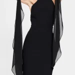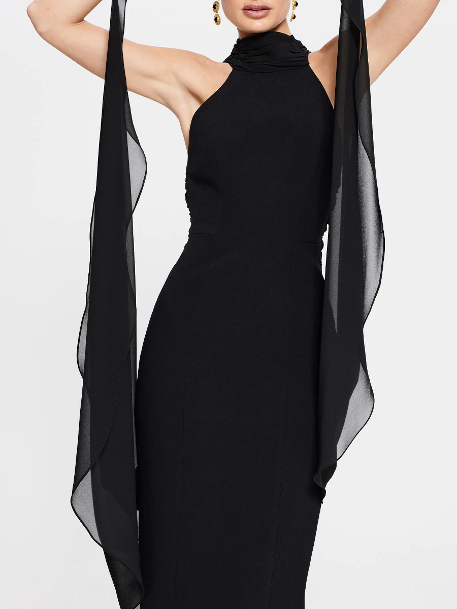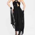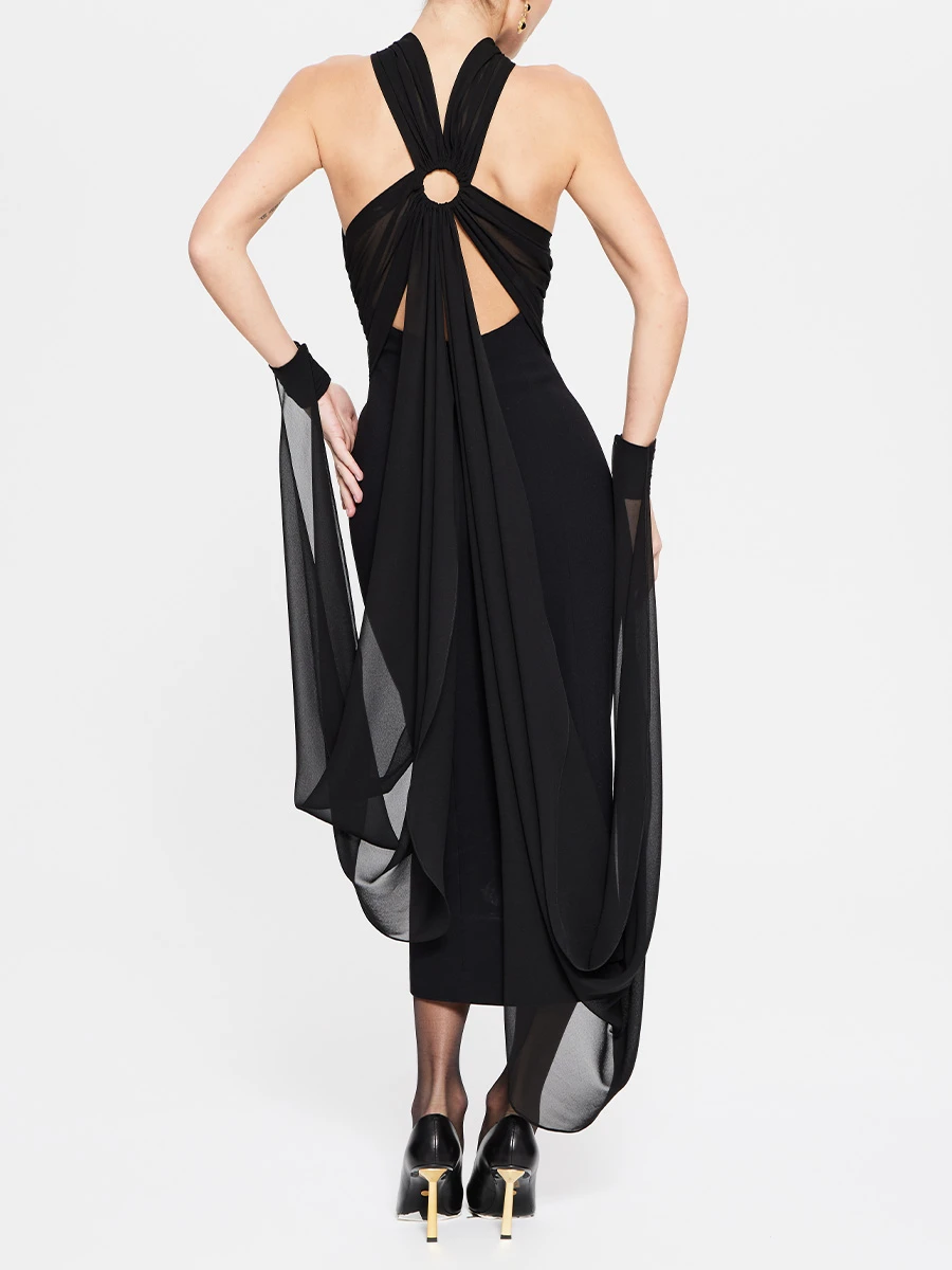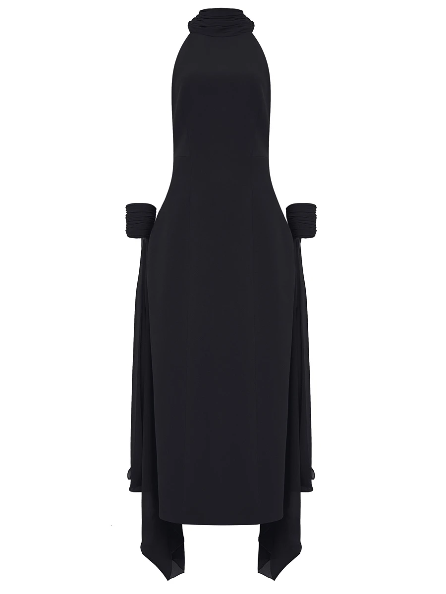 -Роскошное черное вечернее платье в длине макси из мягкого, струящегося шифона и драпирующегося креп-де-шин от SASHASKVO. -Модель облегающего силуэта с открытыми плечами и глубоким диагональным вырезом придают платью кокетливую и загадочную нотку. -Открытая спина, плавно ниспадающая в шлейфы разной длины, манжеты на воздушных петлях и пуговицах, создают эффект невесомости, а детали из драпированного шифона украшают воротник-стойку. -Рельефы элегантно подчеркивают изящество силуэта.