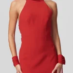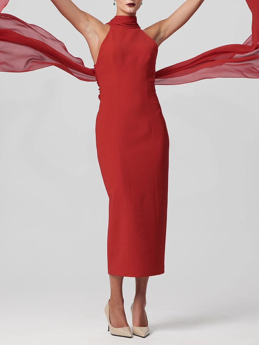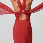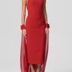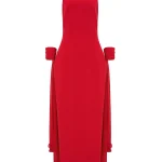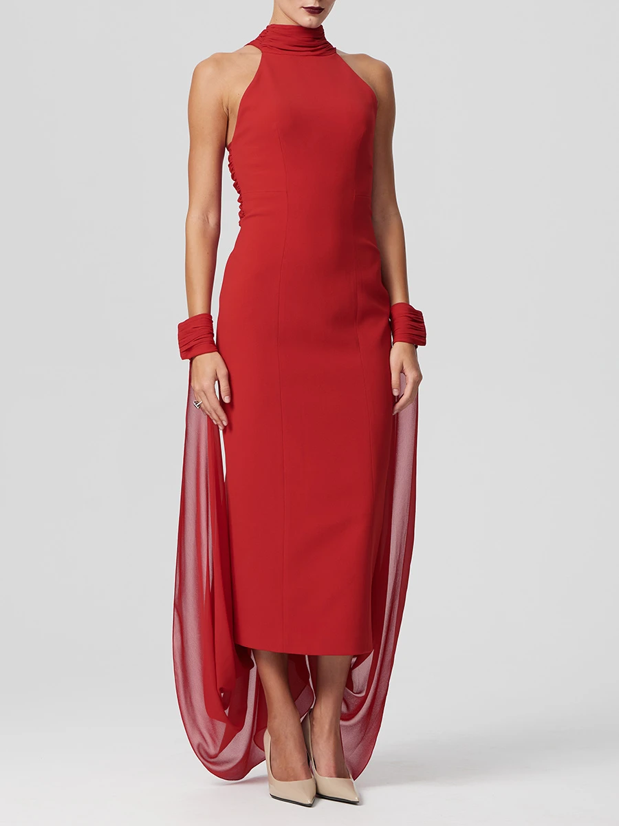 -Роскошное красное вечернее платье в длине макси из мягкого, струящегося шифона и драпирующегося креп-де-шин от SASHASKVO. -Модель облегающего силуэта с открытыми плечами и глубоким диагональным вырезом придают платью кокетливую и загадочную нотку. -Открытая спина, плавно ниспадающая в шлейфы разной длины, манжеты на воздушных петлях и пуговицах, создают эффект невесомости, а детали из драпированного шифона украшают воротник-стойку. -Рельефы элегантно подчеркивают изящество силуэта.