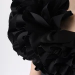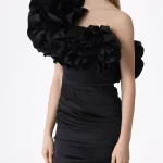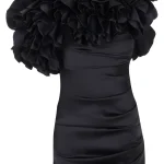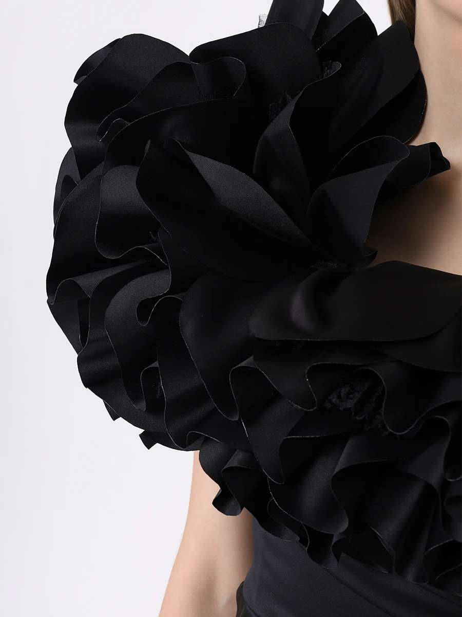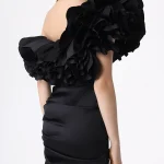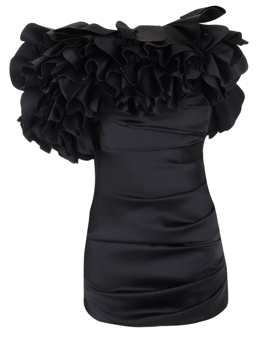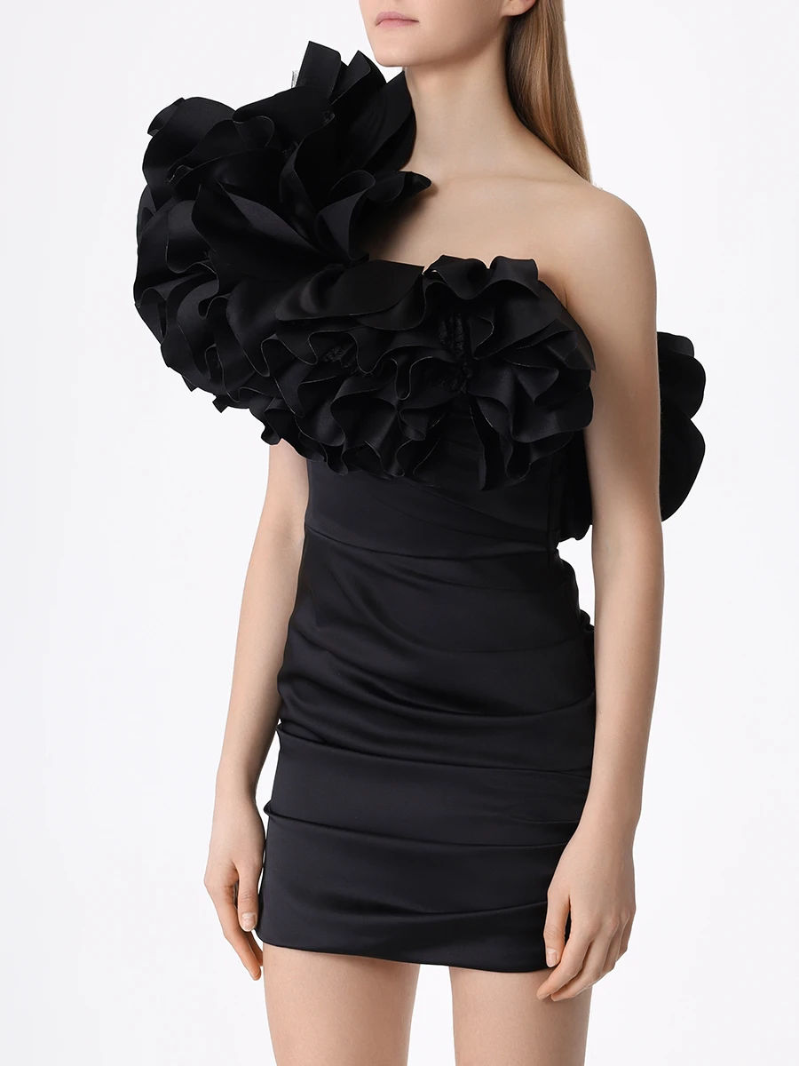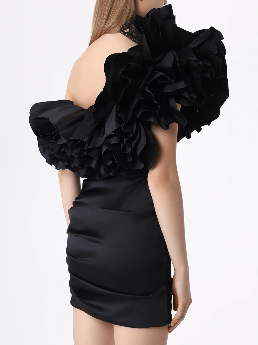 -Черное мини-платье из стрейч-атласа от DIANA GAZARYAN. -Модель облегающего кроя с драпировками, асимметричным декором на груди в виде многочисленных оборок, стилизованных под цветы.