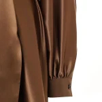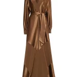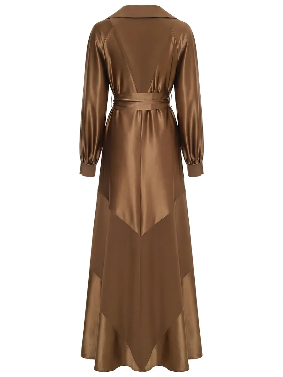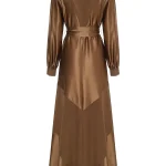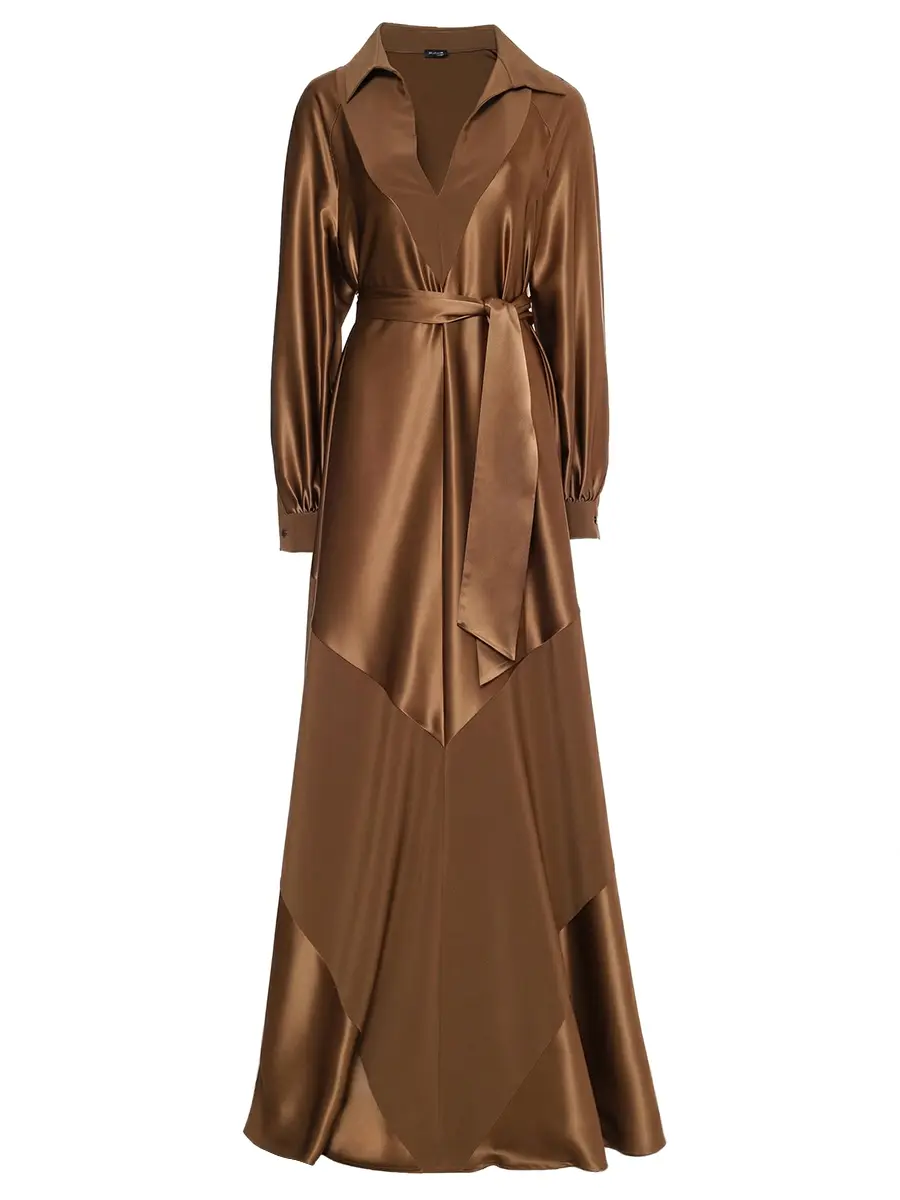 -Платье-макси купажированного состава в цвете молочного шоколада от KITON. -Модель свободного кроя с длинными рукавами, манжетами, отложным воротником, V-образным вырезом на груди, акцентным широким поясом, который подчеркивает талию и структурирует силуэт.
