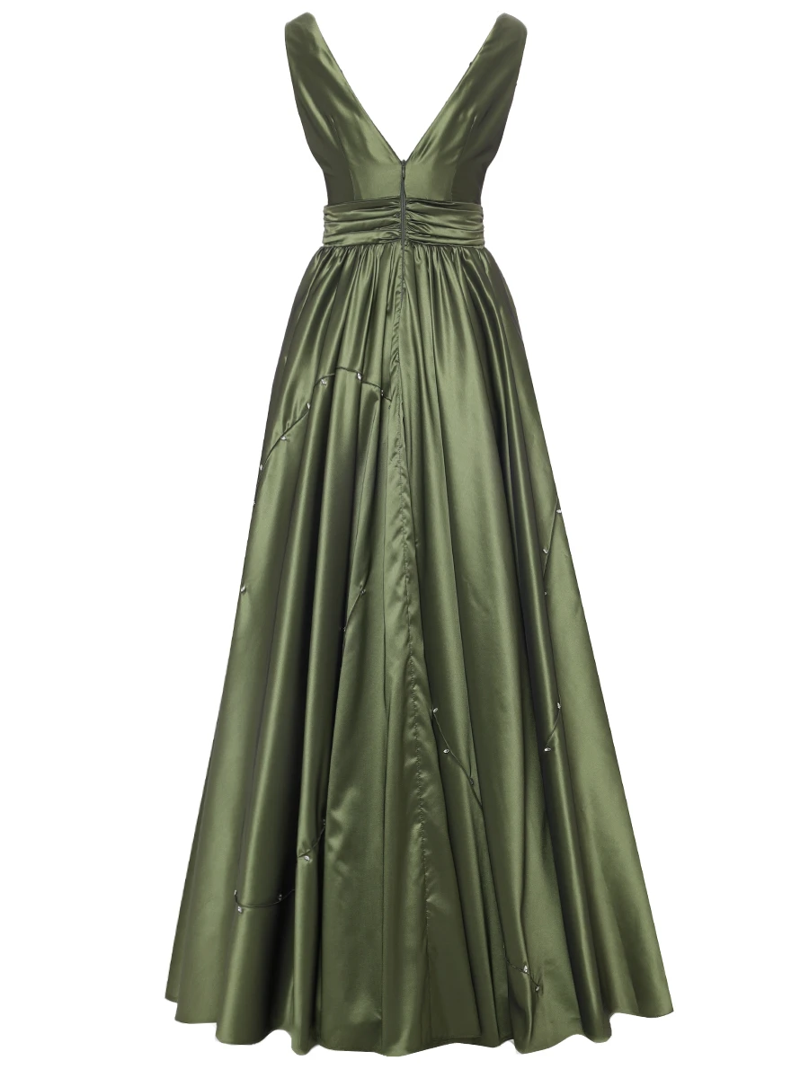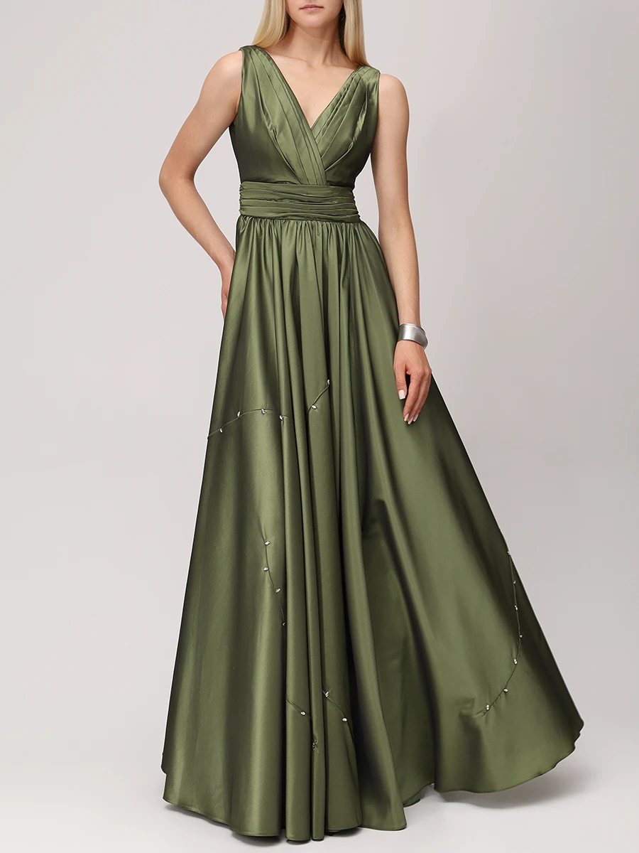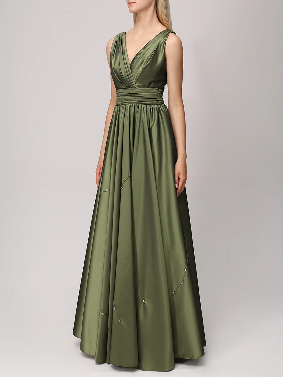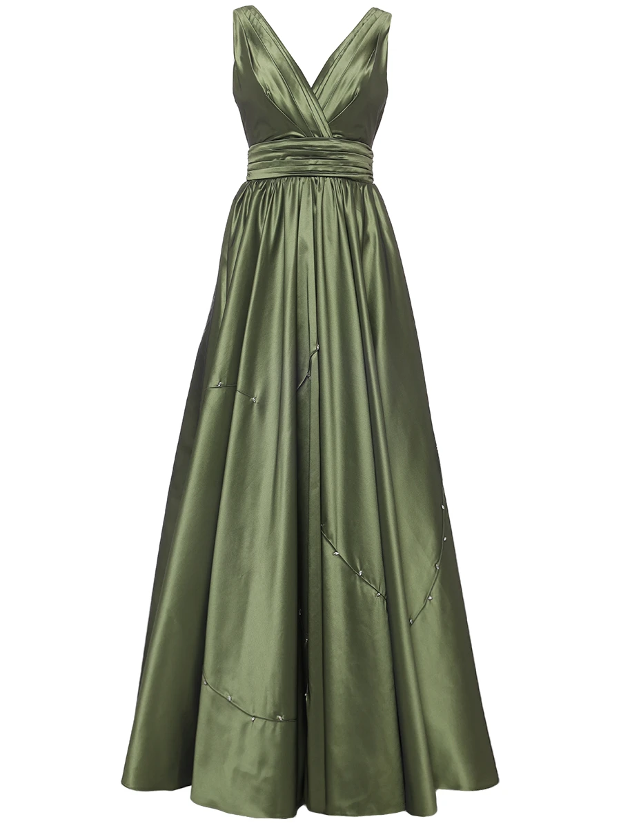 -Зеленое платье из атласа с деликатным блеском от LEI LUI. -Модель приталенного кроя с V-образным вырезом горловины, широкими бретелями, драпировками, пышной юбкой, застежкой на молнию и ручной отделкой кристаллами холодной фиксации. -Вечерний образ дополнят базовые туфли-лодочки или босоножки на высоком каблуке.