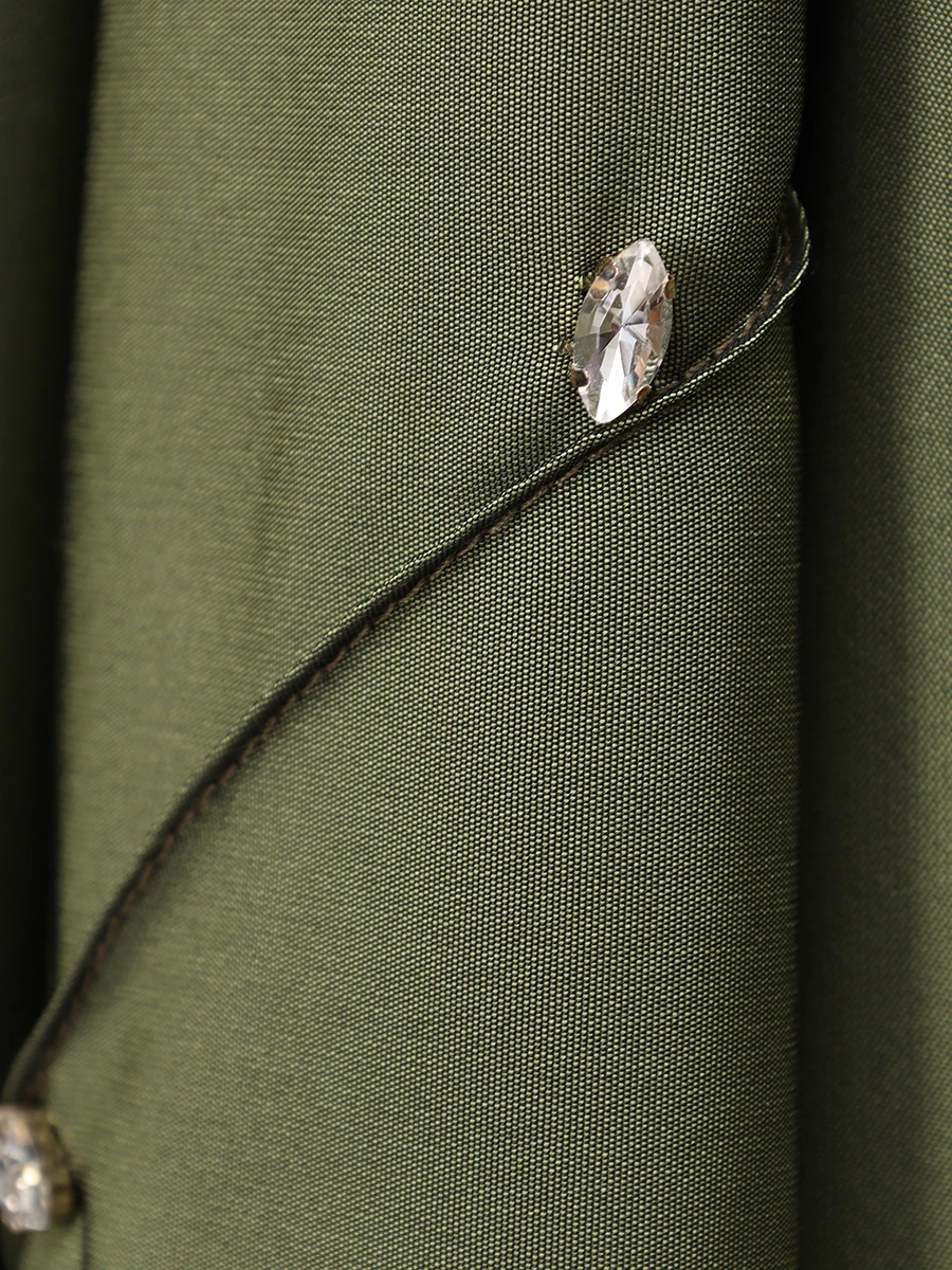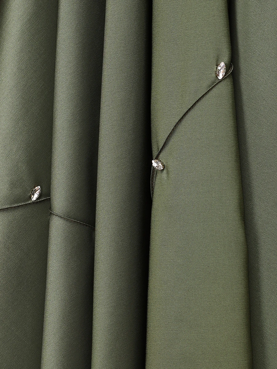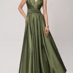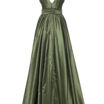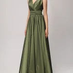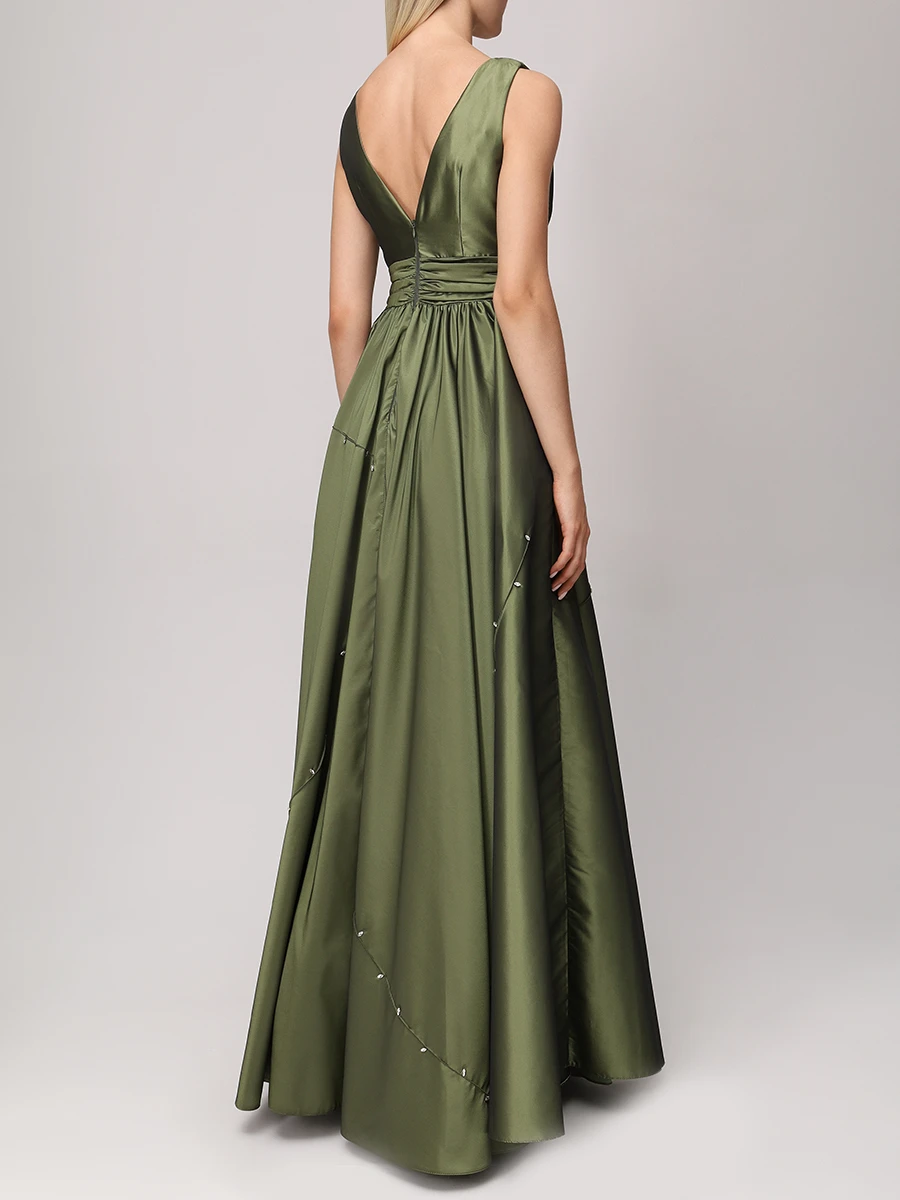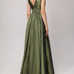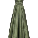 -Зеленое платье из атласа с деликатным блеском от LEI LUI. -Модель приталенного кроя с V-образным вырезом горловины, широкими бретелями, драпировками, пышной юбкой, застежкой на молнию и ручной отделкой кристаллами холодной фиксации. -Вечерний образ дополнят базовые туфли-лодочки или босоножки на высоком каблуке.