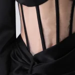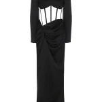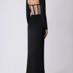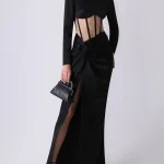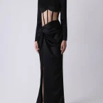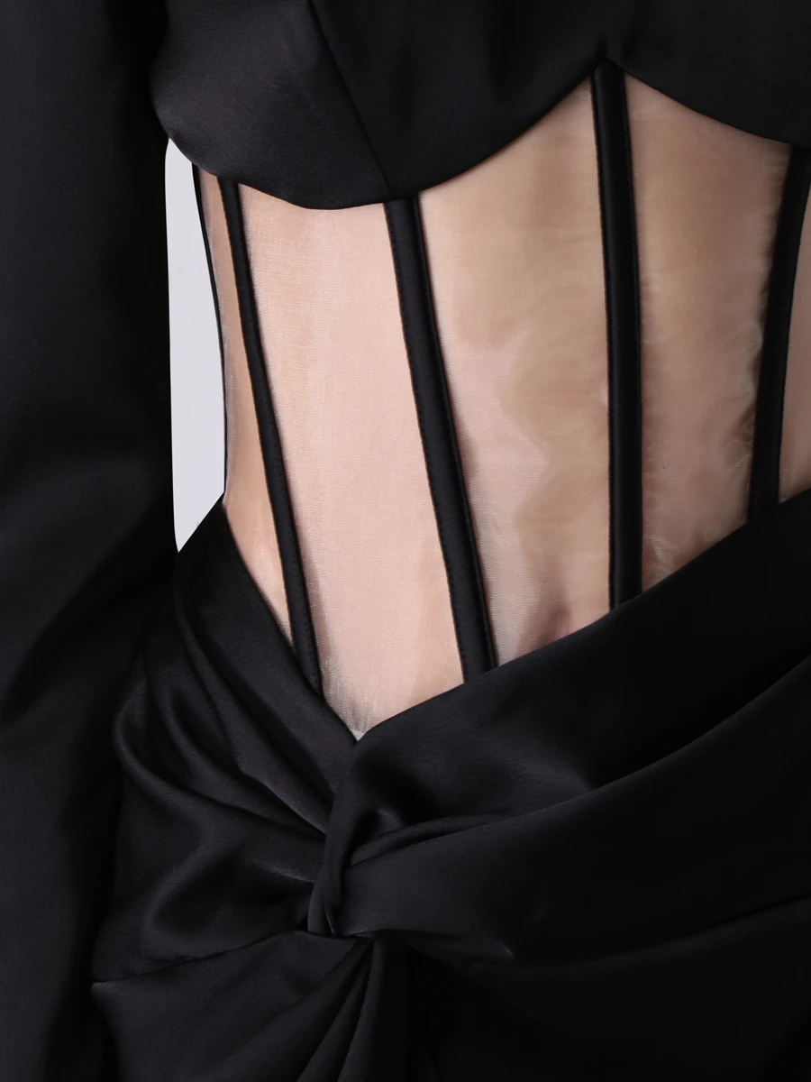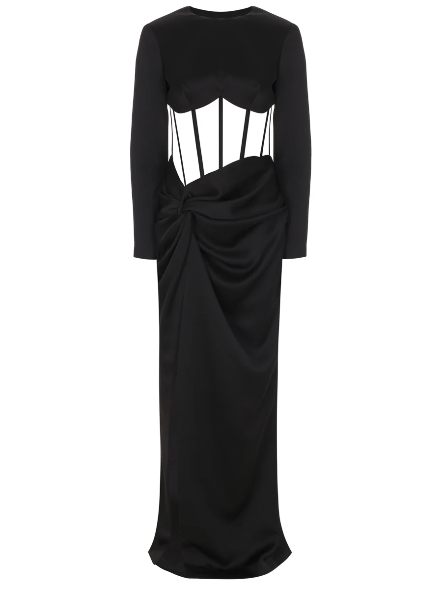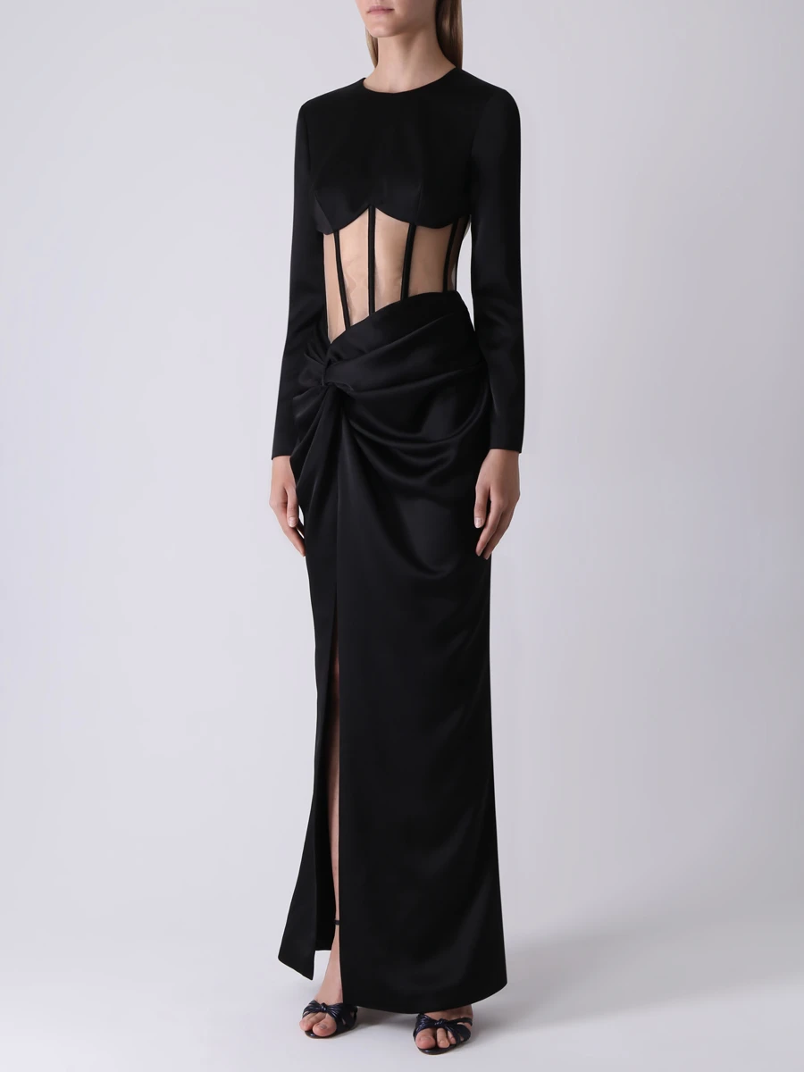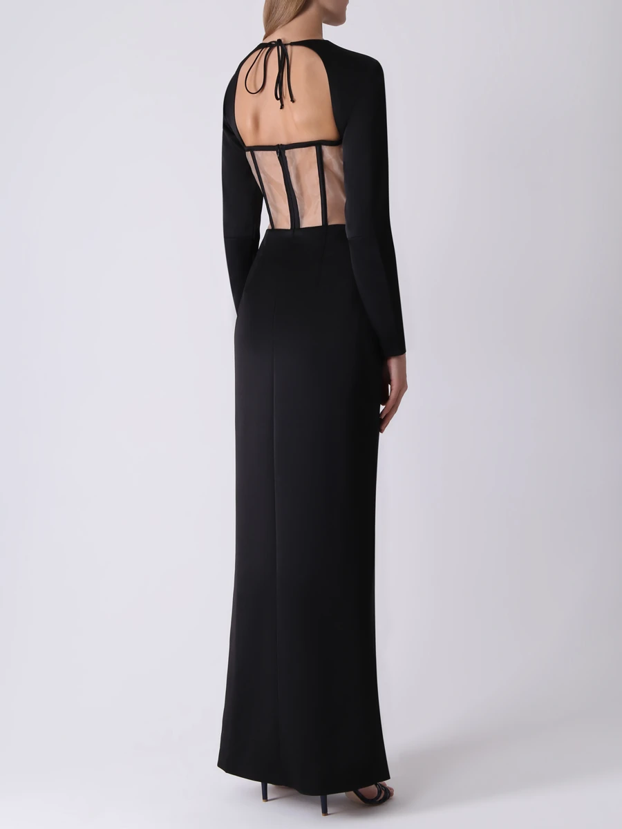 -Черное вечернее платье в пол из атласа от RASARIO. -Модель с корсетной вставкой и отделкой из прозрачной сетки, длинными рукавами, круглой горловиной, разрезом и активными драпировками на бедре. -Спинка открыта и дополнена лишь завязками сверху.