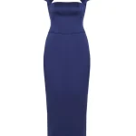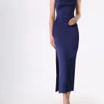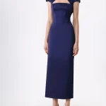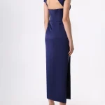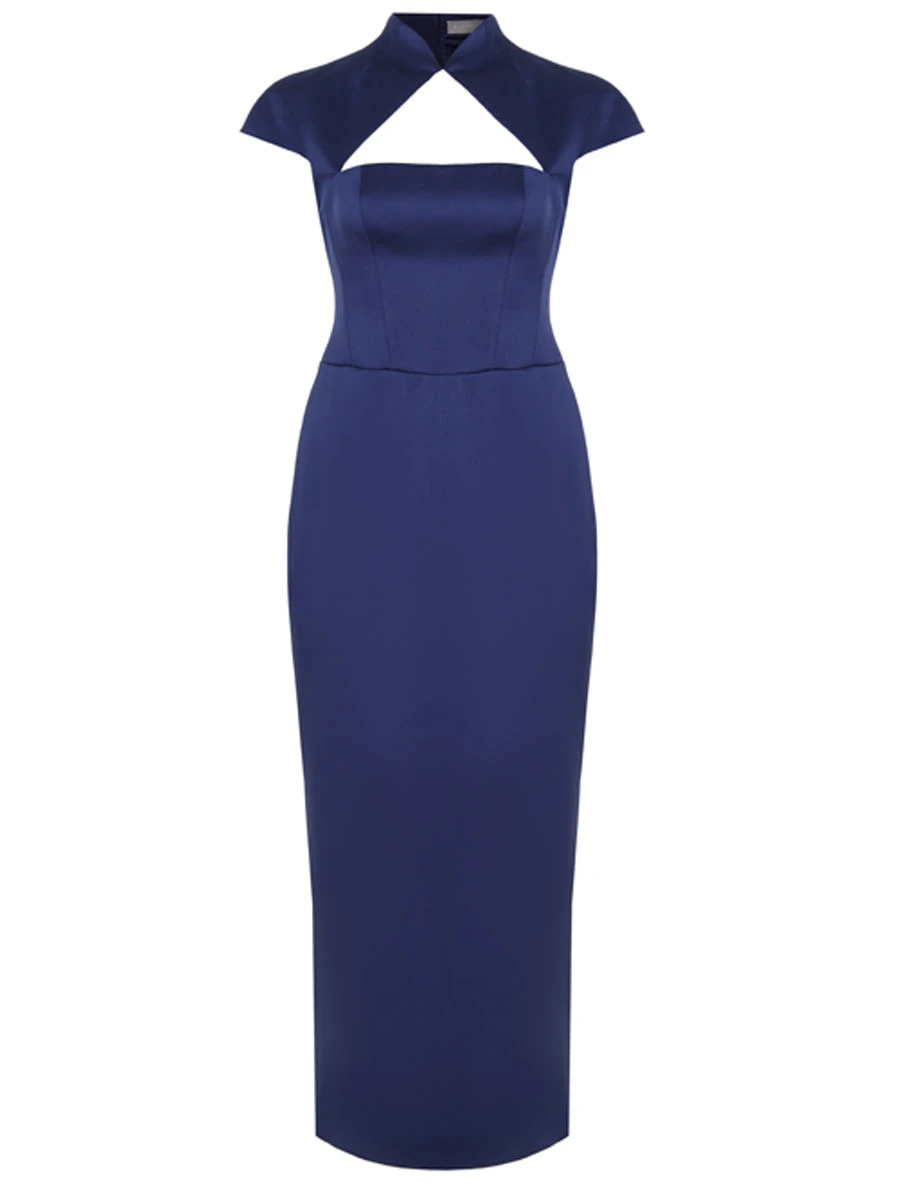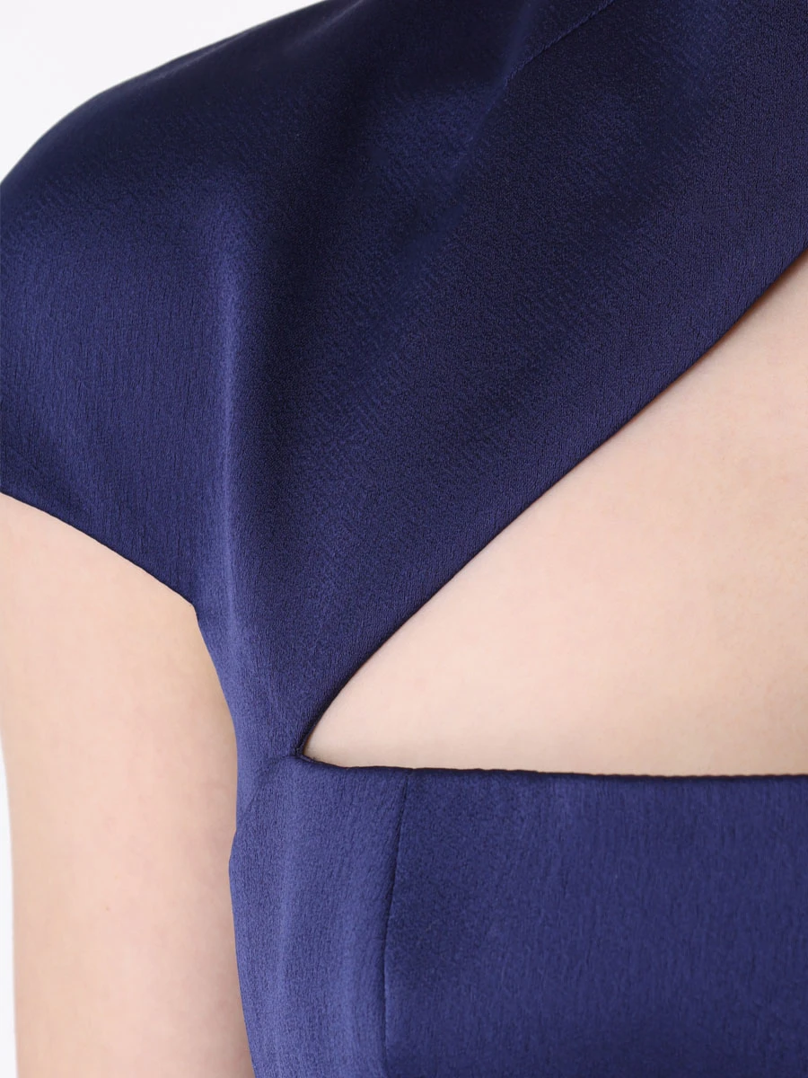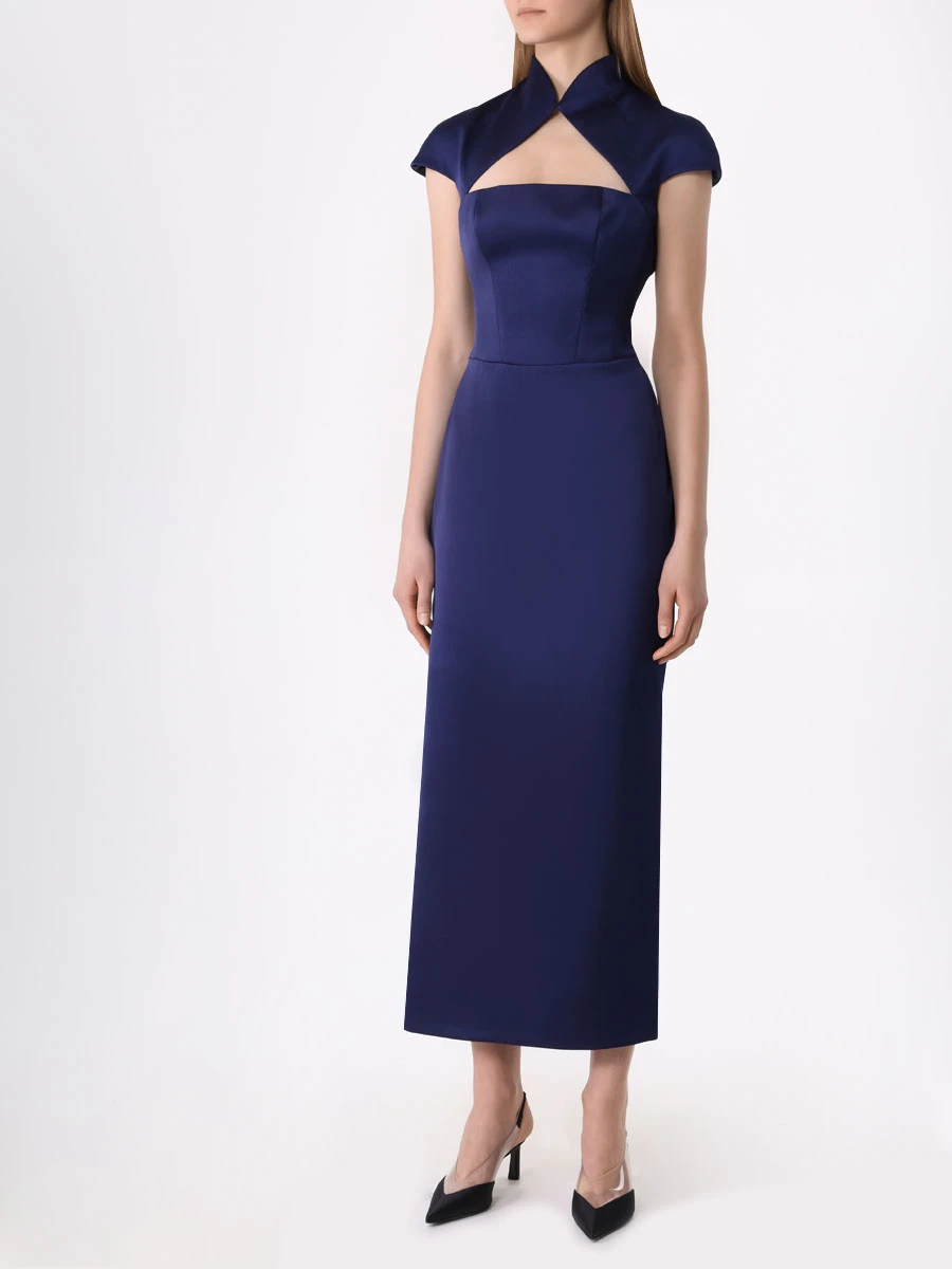-Темно-синее платье-миди из плотного атласа от RASARIO. -Модель приталенного кроя эффектно выделяет талию и бедра, юбка прямого к низу кроя визуально вытягивает силуэт, аккуратные короткие рукава и застежка на потайную молнию завершают конструкцию. -Вечерний тон платью задают высокий разрез на бедре, открытая спина и треугольный вырез на груди, который подчеркивает прямую линию декольте.