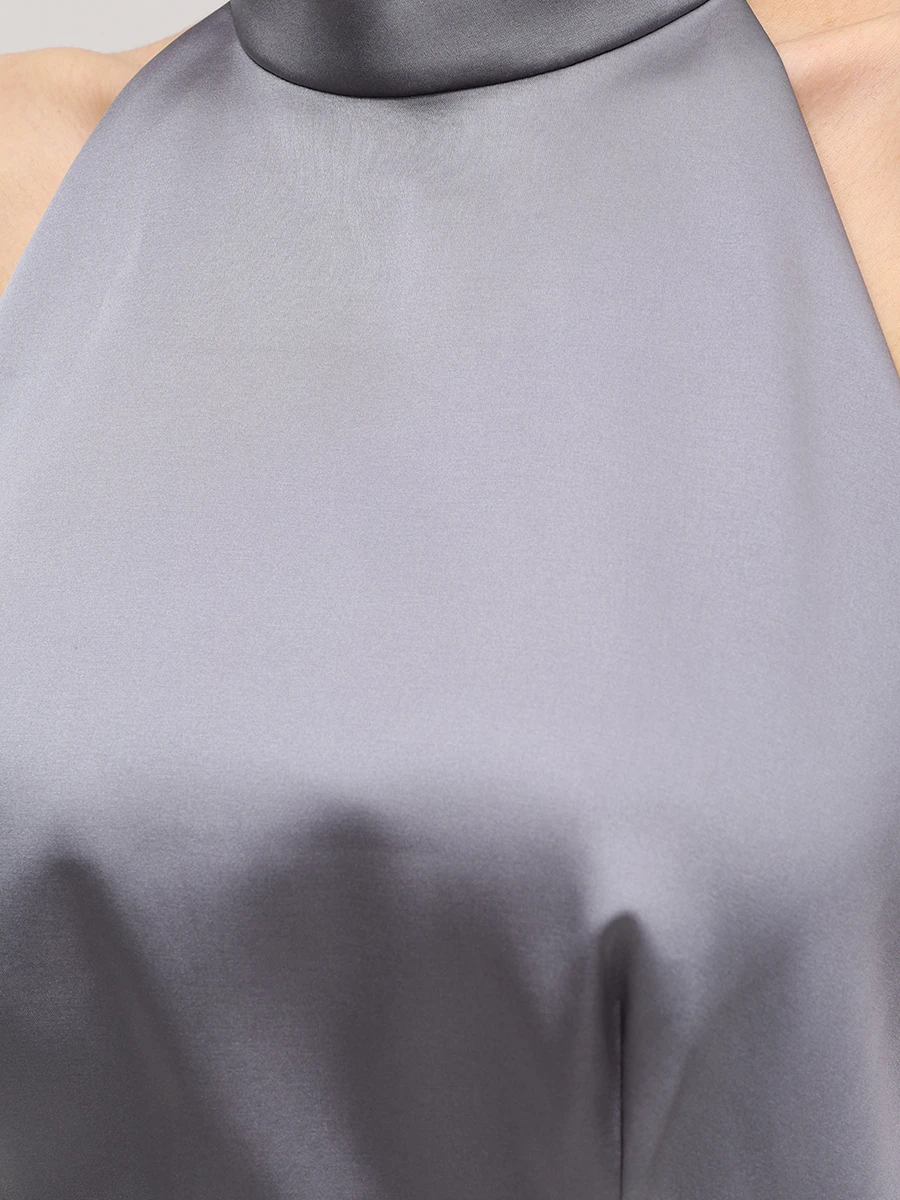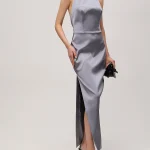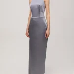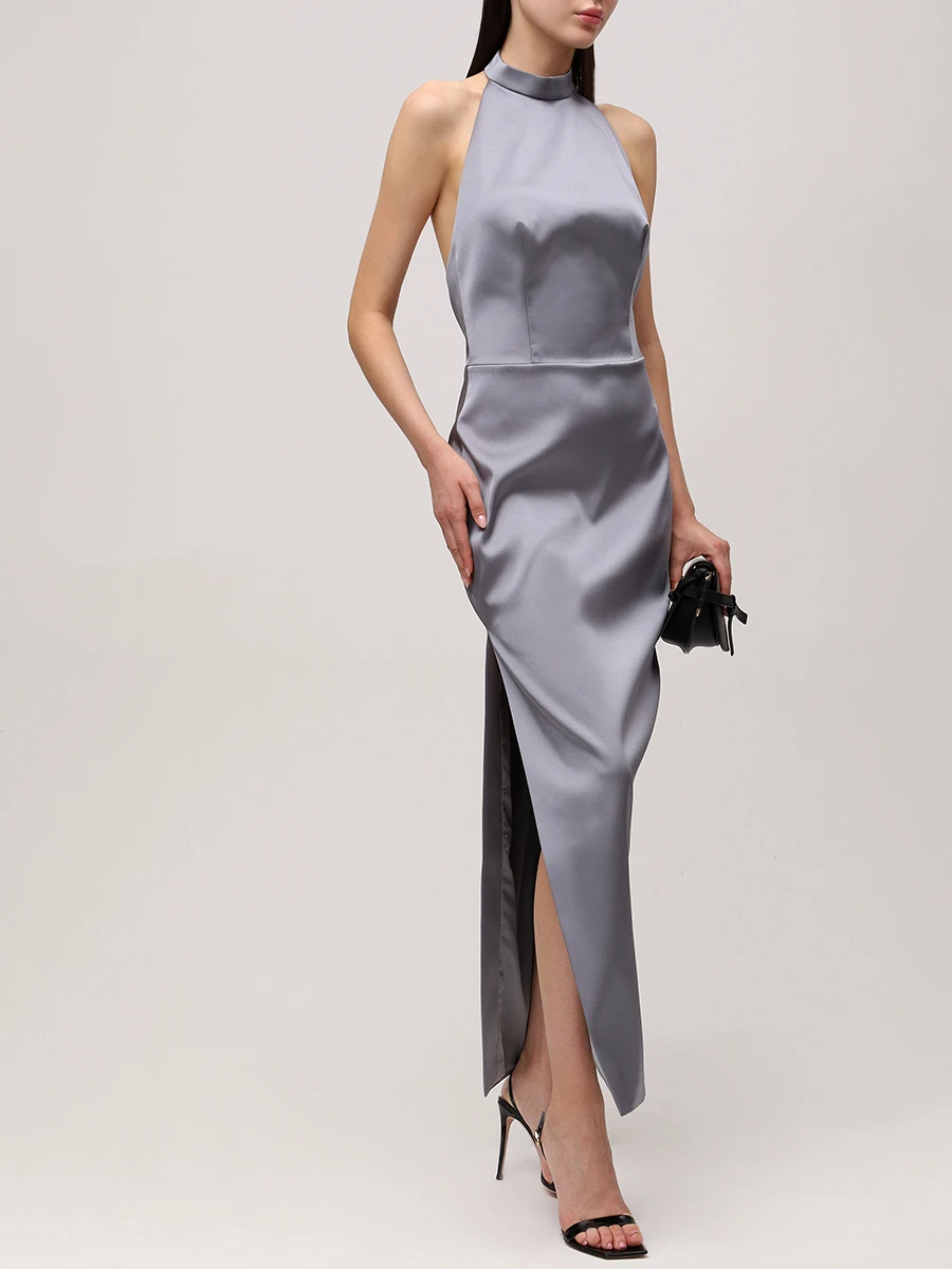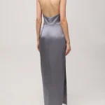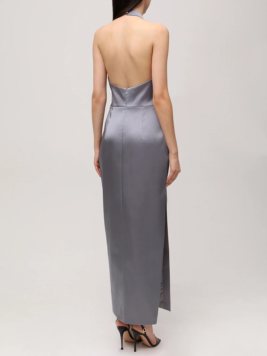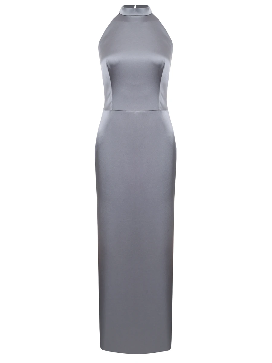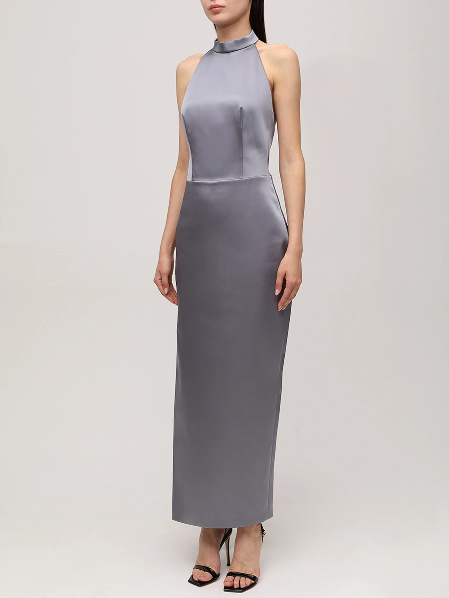 -Серое платье из атласа с деликатным блеском от RASARIO. -Модель приталенного кроя с открытой спиной, американской проймой, воротником-стойкой, застежкой на потайную молнию и высоким боковым разрезом. -Эффектное платье подчеркнет все достоинства фигуры и превратит каждый выход в незабываемое событие.