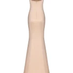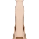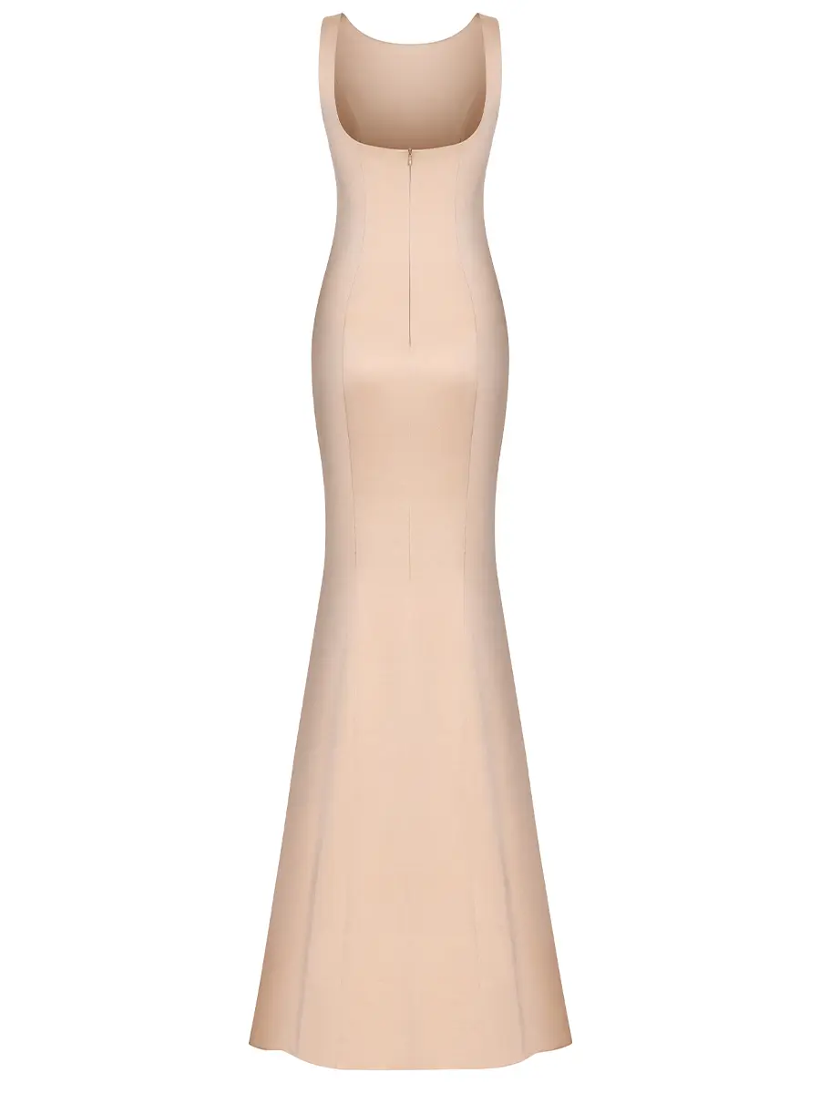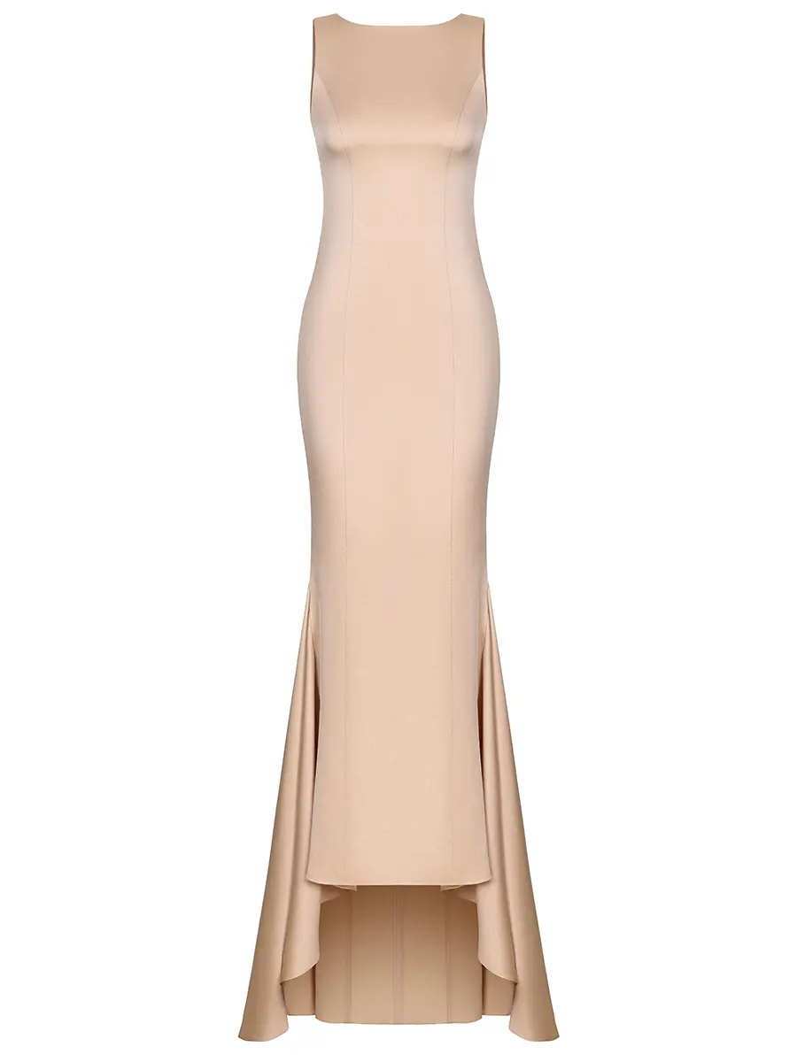 -Атласное платье купажированного состава в бежевом цвете от ST. ERME. -Модель прилегающего силуэта с круглым вырезом горловины, шлейфом, вырезом на спинке, застежкой на потайную молнию.