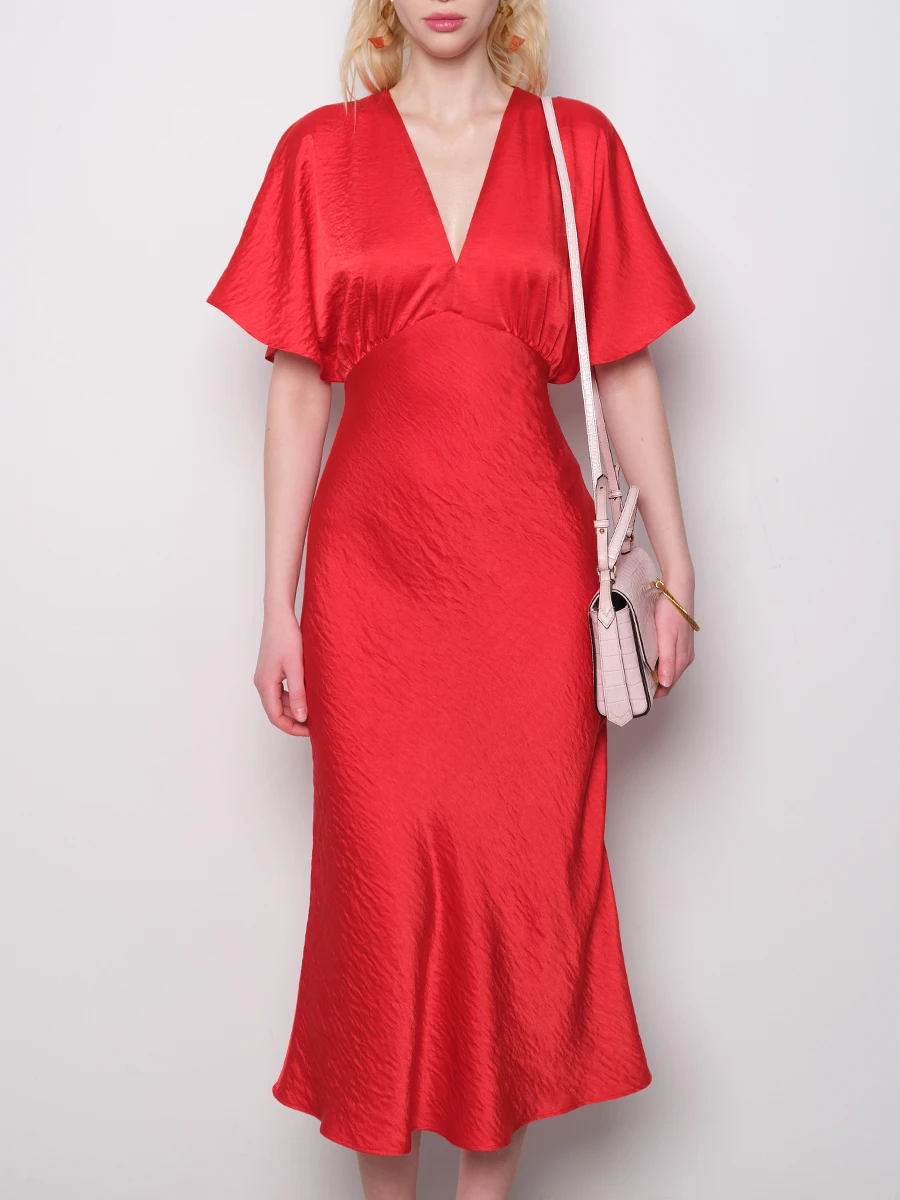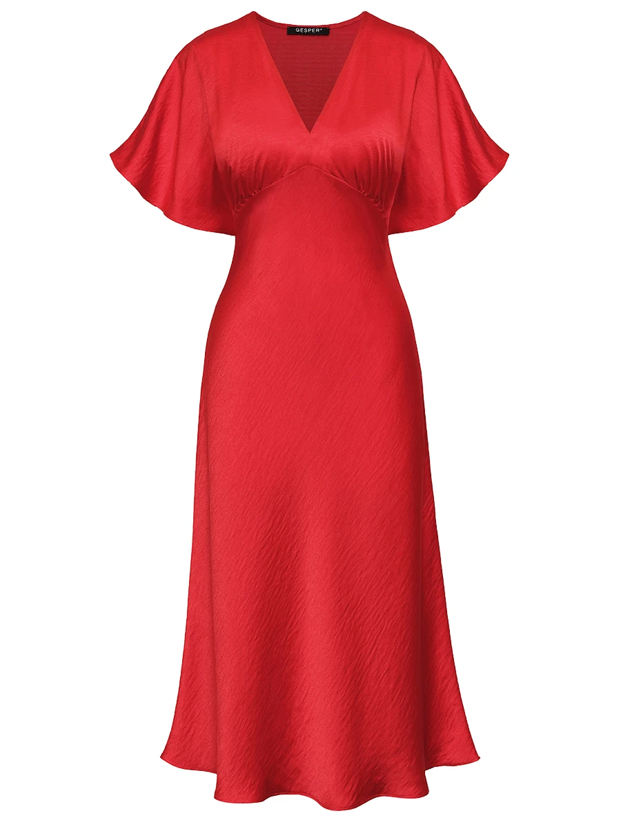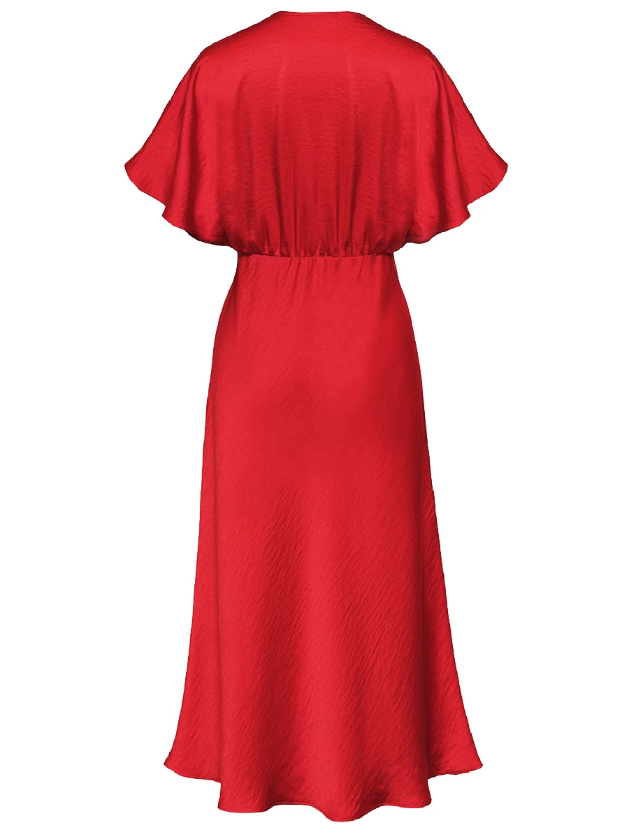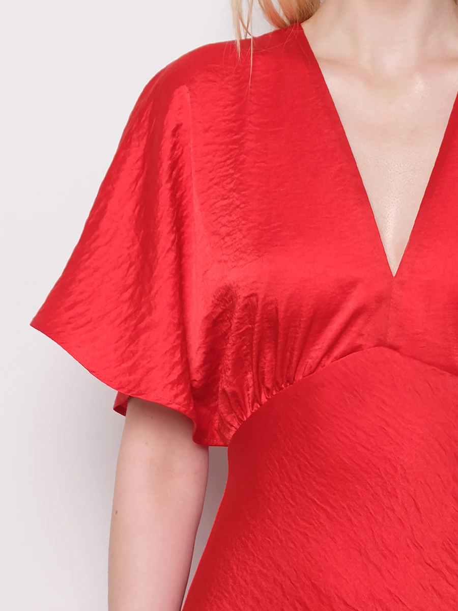 -Красное платье-миди от GESPER. -Модель с кроем по фигуре, свободными короткими рукавами и V-образным вырезом на груди. -Платье прекрасно впишется в ваш гардероб и создаст как дневной, так и вечерний образ. -Плотная ткань надежно скроет очертания нижнего белья, а конструкция с резинкой на спинке позволит свободно дышать в любой ситуации.