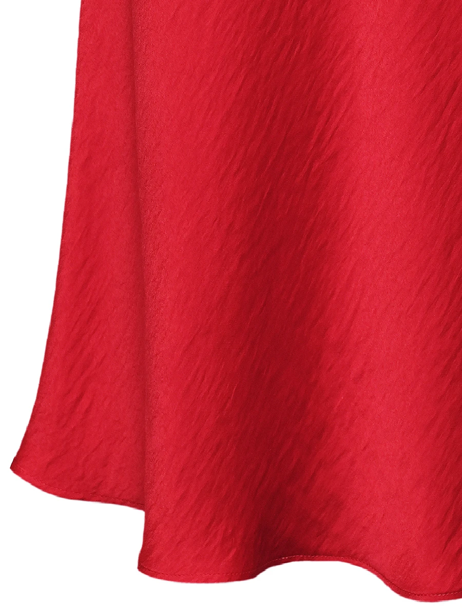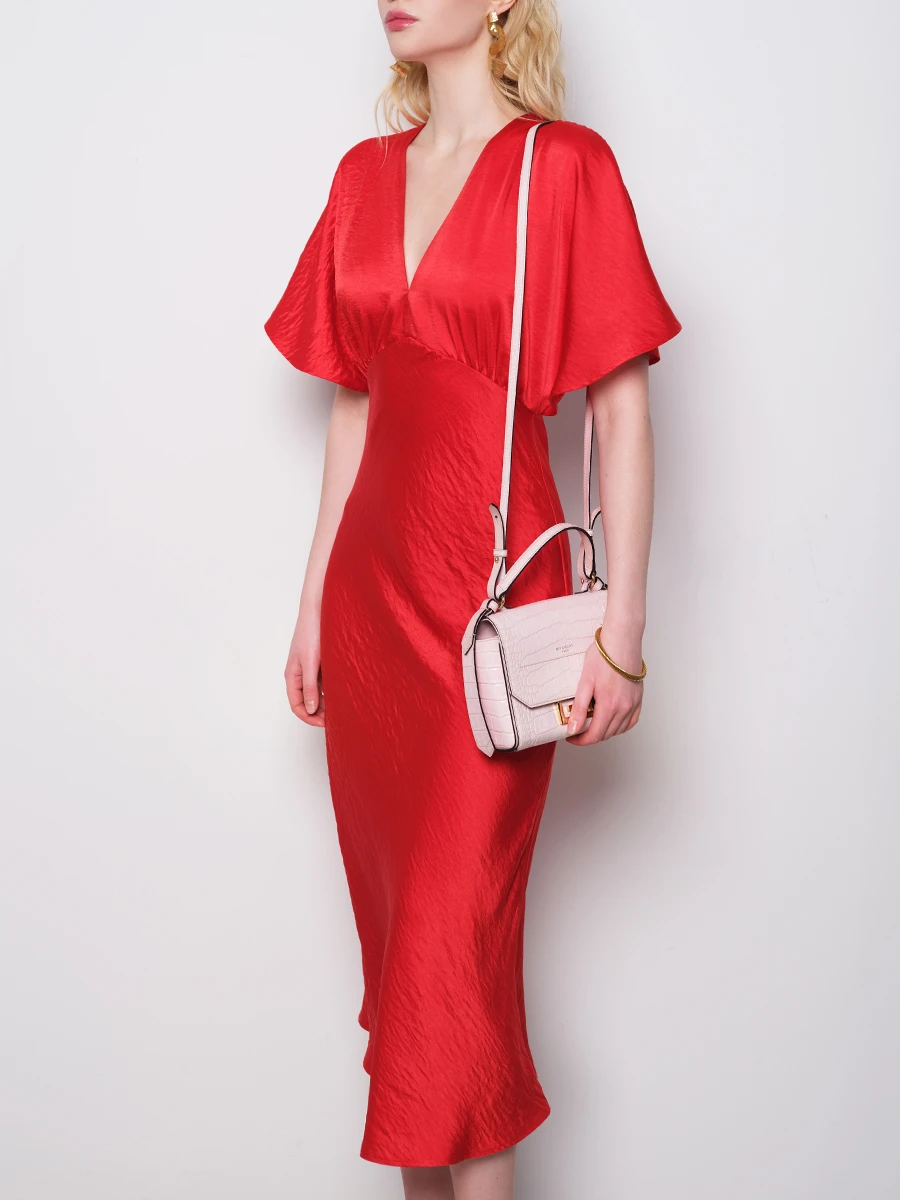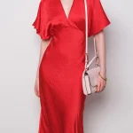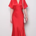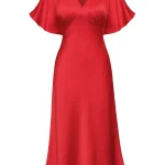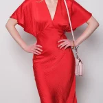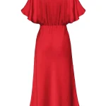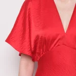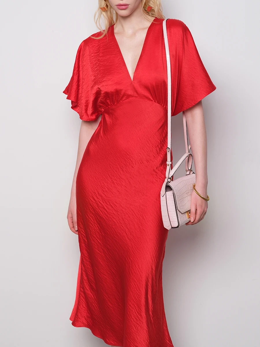 -Красное платье-миди от GESPER. -Модель с кроем по фигуре, свободными короткими рукавами и V-образным вырезом на груди. -Платье прекрасно впишется в ваш гардероб и создаст как дневной, так и вечерний образ. -Плотная ткань надежно скроет очертания нижнего белья, а конструкция с резинкой на спинке позволит свободно дышать в любой ситуации.