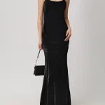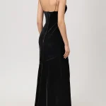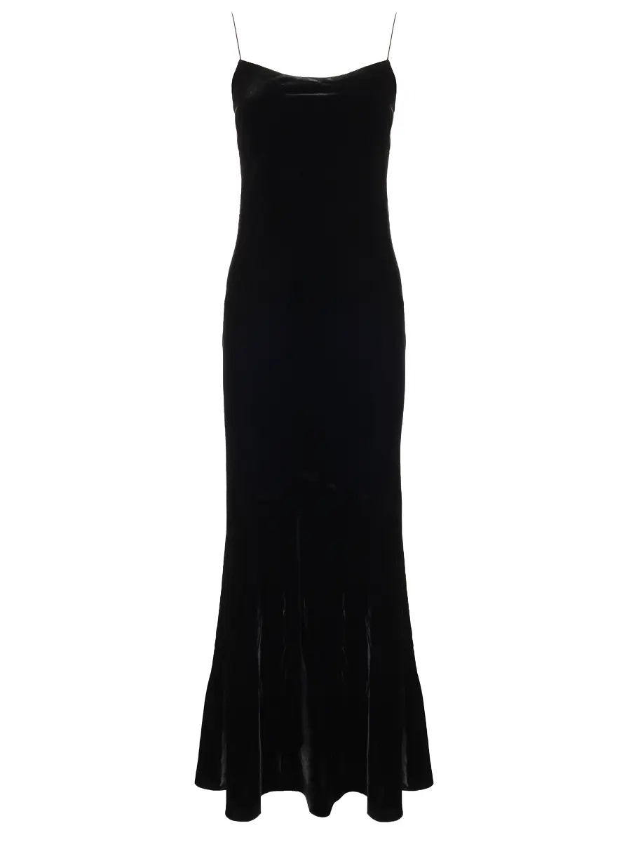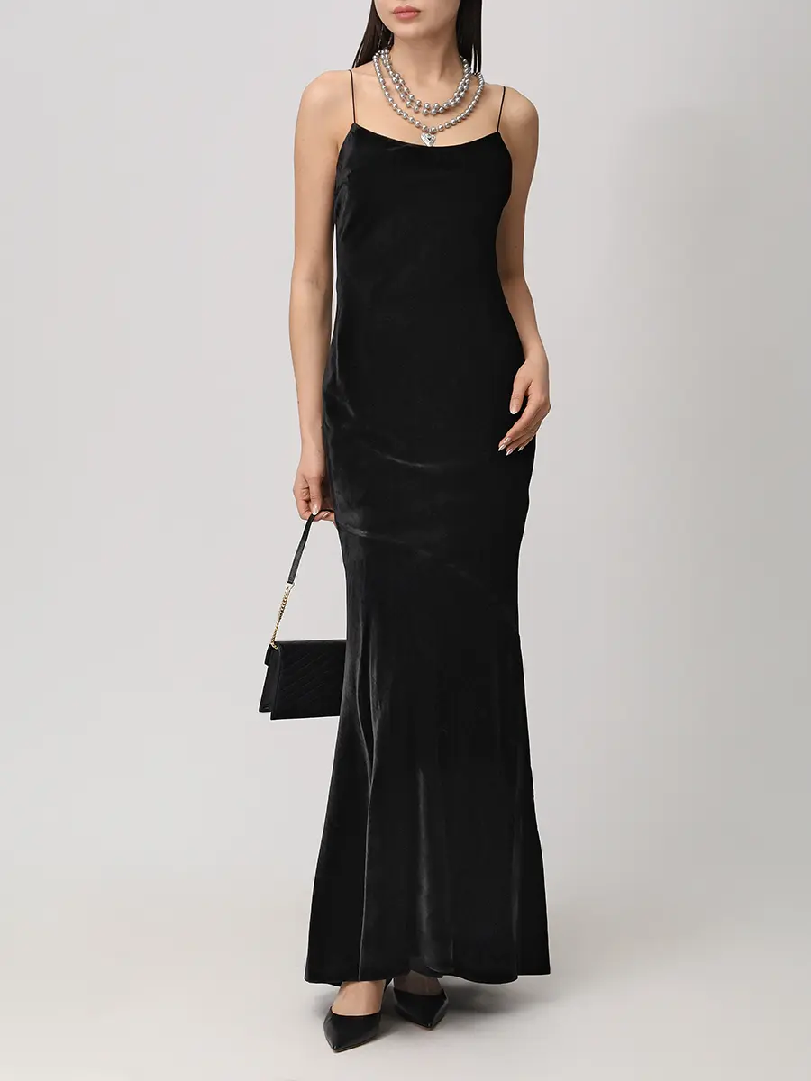-Черное платье-комбинация в длине макси из мягкого бархата от ALINE. -Мягкий деликатный блеск придаёт более элегантный и утончённый эффект. -Открытый верх изделия и облегающий крой добавляют акценты в вечерний образ. -Такое платье станет ключевым элементом Вашего гардероба. -Сочетайте платье с бархатными аксессуарами из коллекции ALINE.