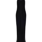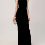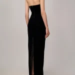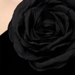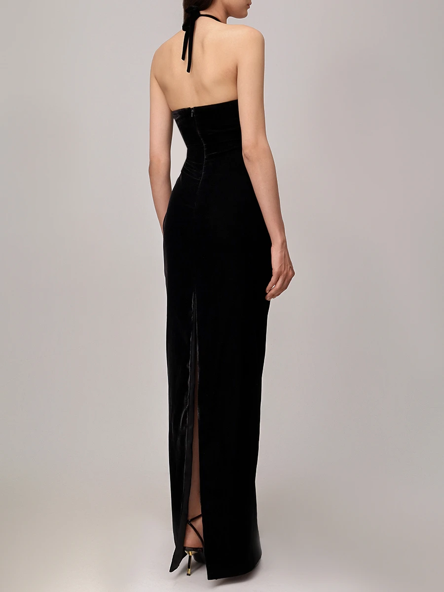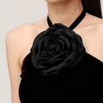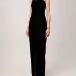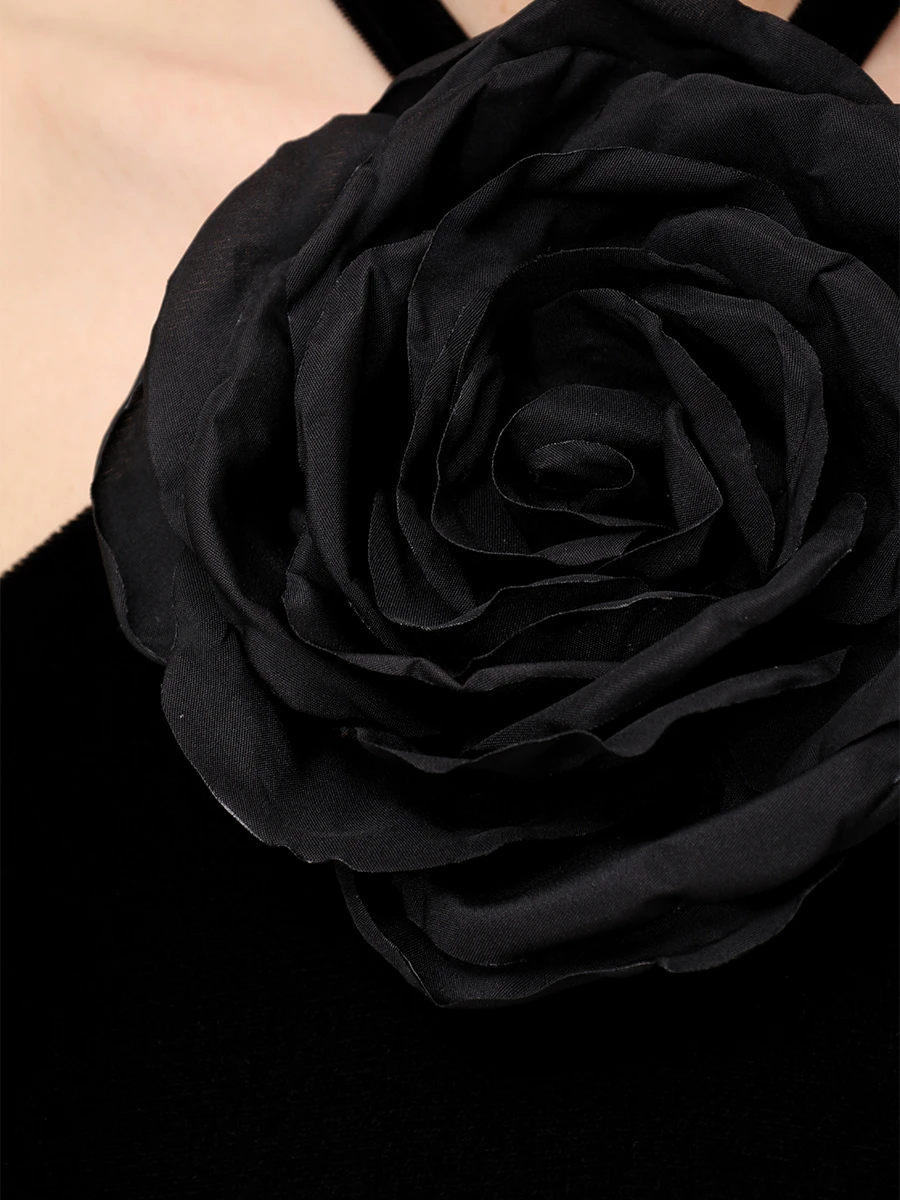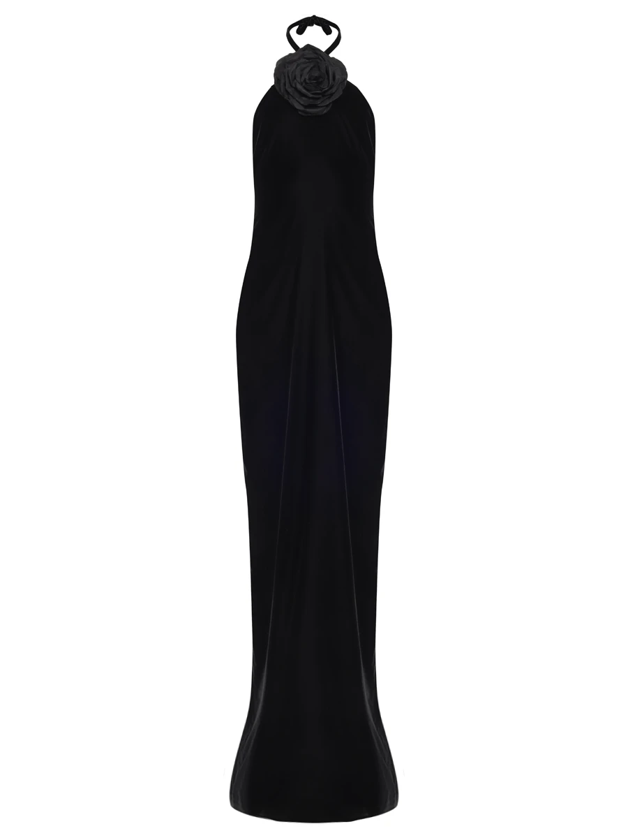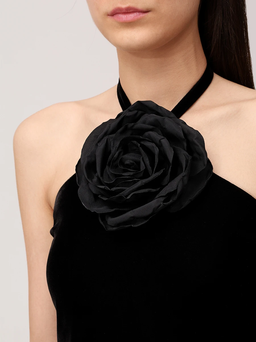 -Черное платье из бархата на основе вискозы от KAMILLA PURSHIE. -Модель облегающего кроя с бретелью-халтер, высоким разрезом сзади, застежкой на потайную молнию и текстильной розой ручной работы на груди, добавляющей образу женственности и характера. -Элегантное платье идеально подходит для вечерних мероприятий и красных дорожек.