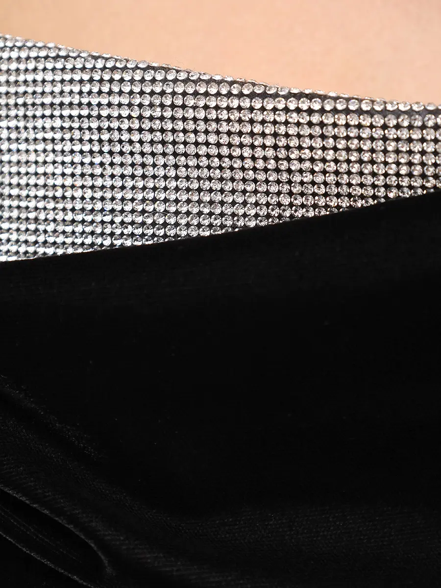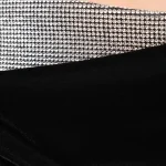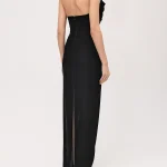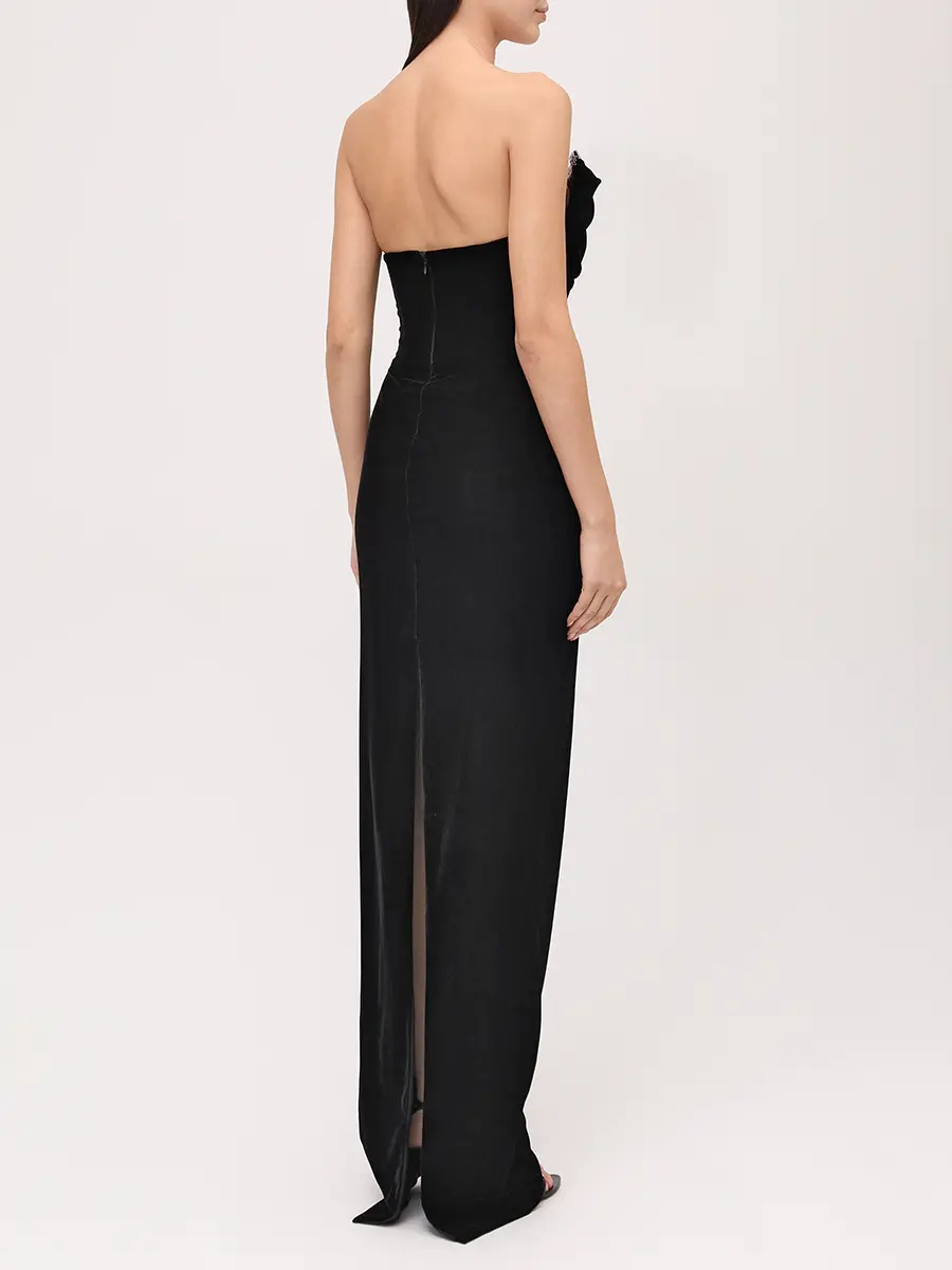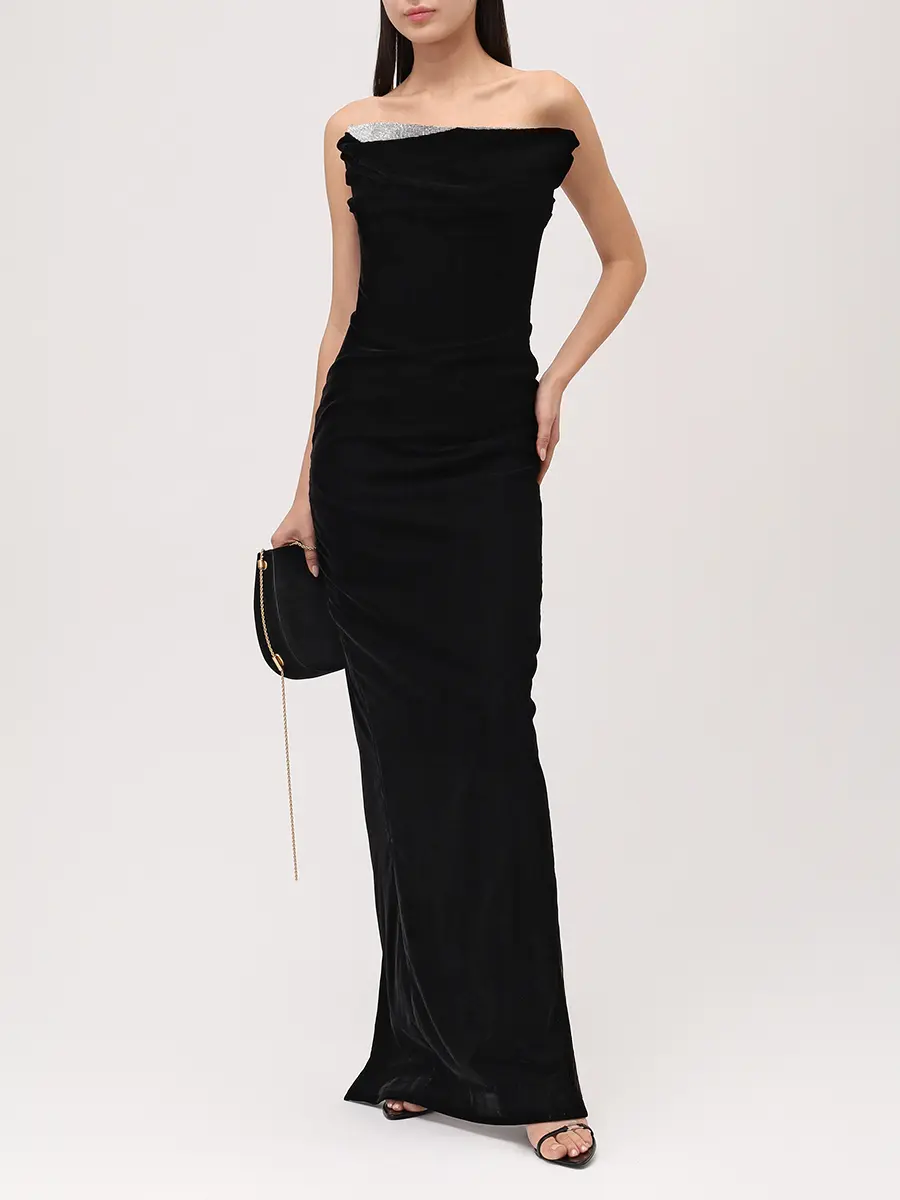 -Черное платье из фактурного бархата от KAMILLA PURSHIE. -Модель приталенного кроя, деликатно облегающего талию и бедра, с открытыми плечами и спиной, застежкой на потайную молнию, глубоким разрезом сзади, драпировками и отделкой серебристыми стразами по линии декольте. -Платье идеально подчёркивает фигуру и дарит ощущение благородной сдержанности.