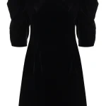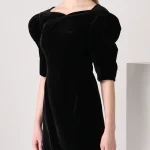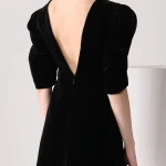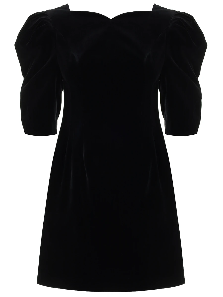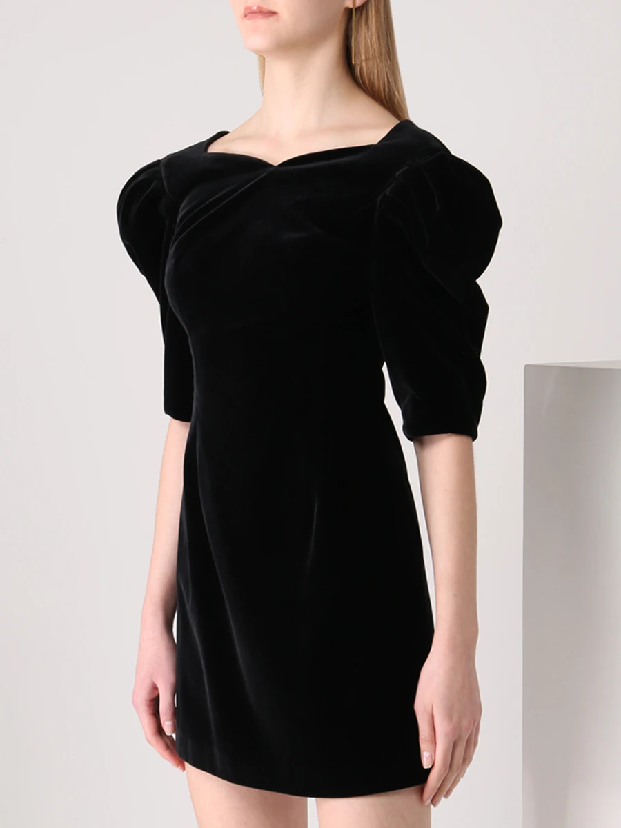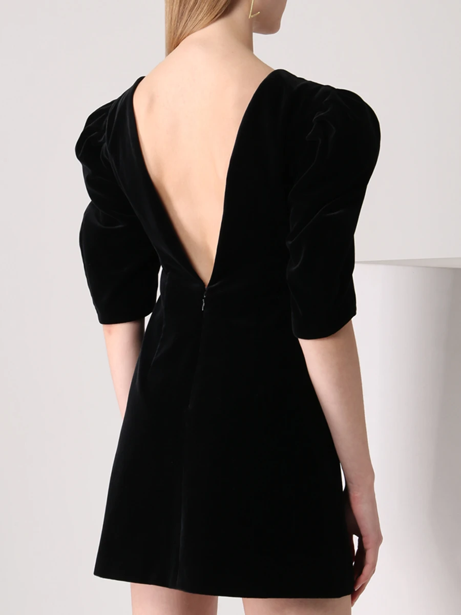 -Черное бархатное мини-платье от L’VIRA. -Модель приталенного кроя с расклешенной юбкой, объемные рукава длины 1/2, фигурный вырез на груди и глубокий V-образный на спинке с застежкой-молнией. -Платье очищено от декора, чтобы не перегружать образ, а высокие каблуки и клатч станут отличным дополнением.