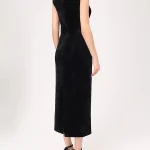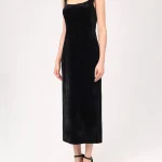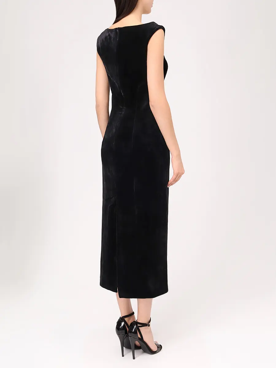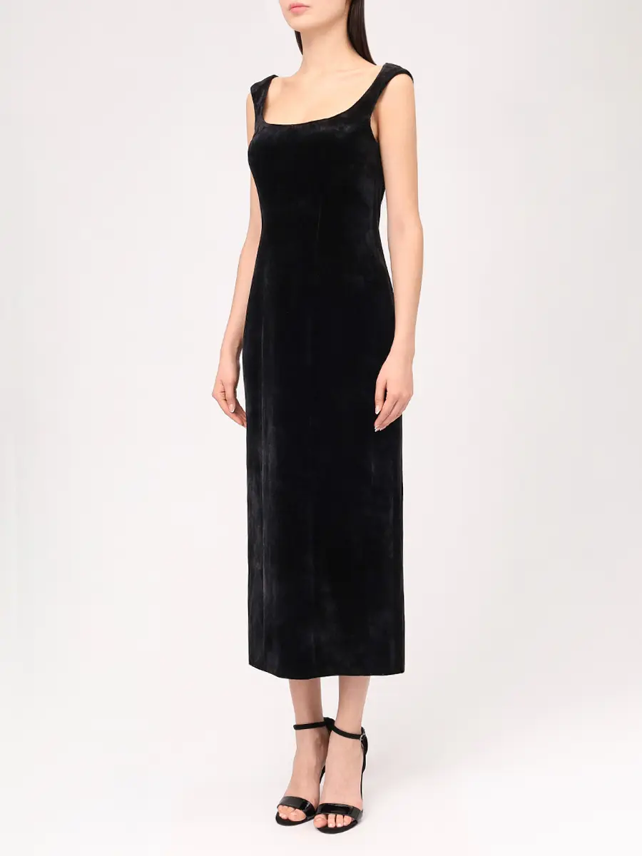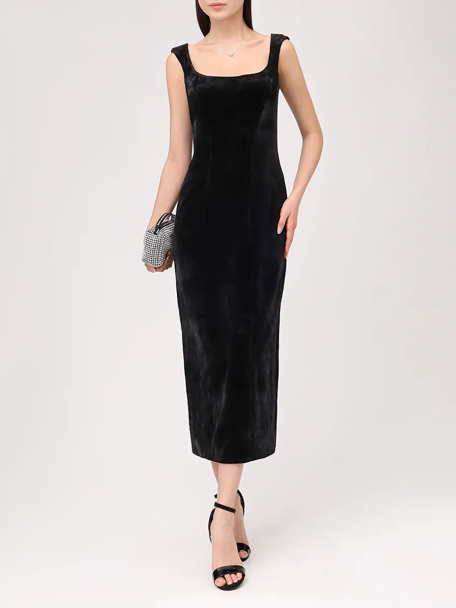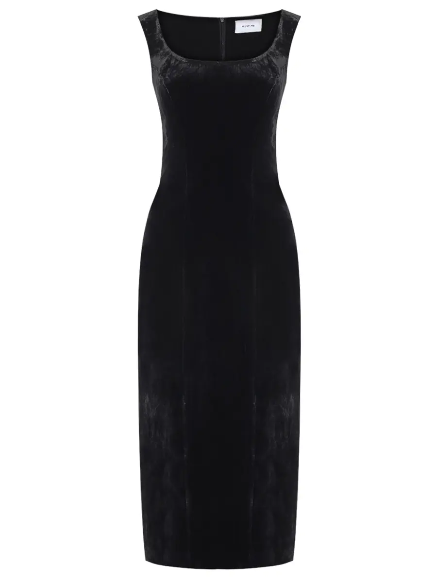 -Черное платье-миди из бархата на шифоне от MUSE ME. -Модель с акцентом кроя на талии и бедрах, прямым подолом, широкими бретелями на плечах, застежкой на потайную молнию сзади.