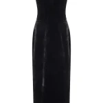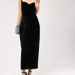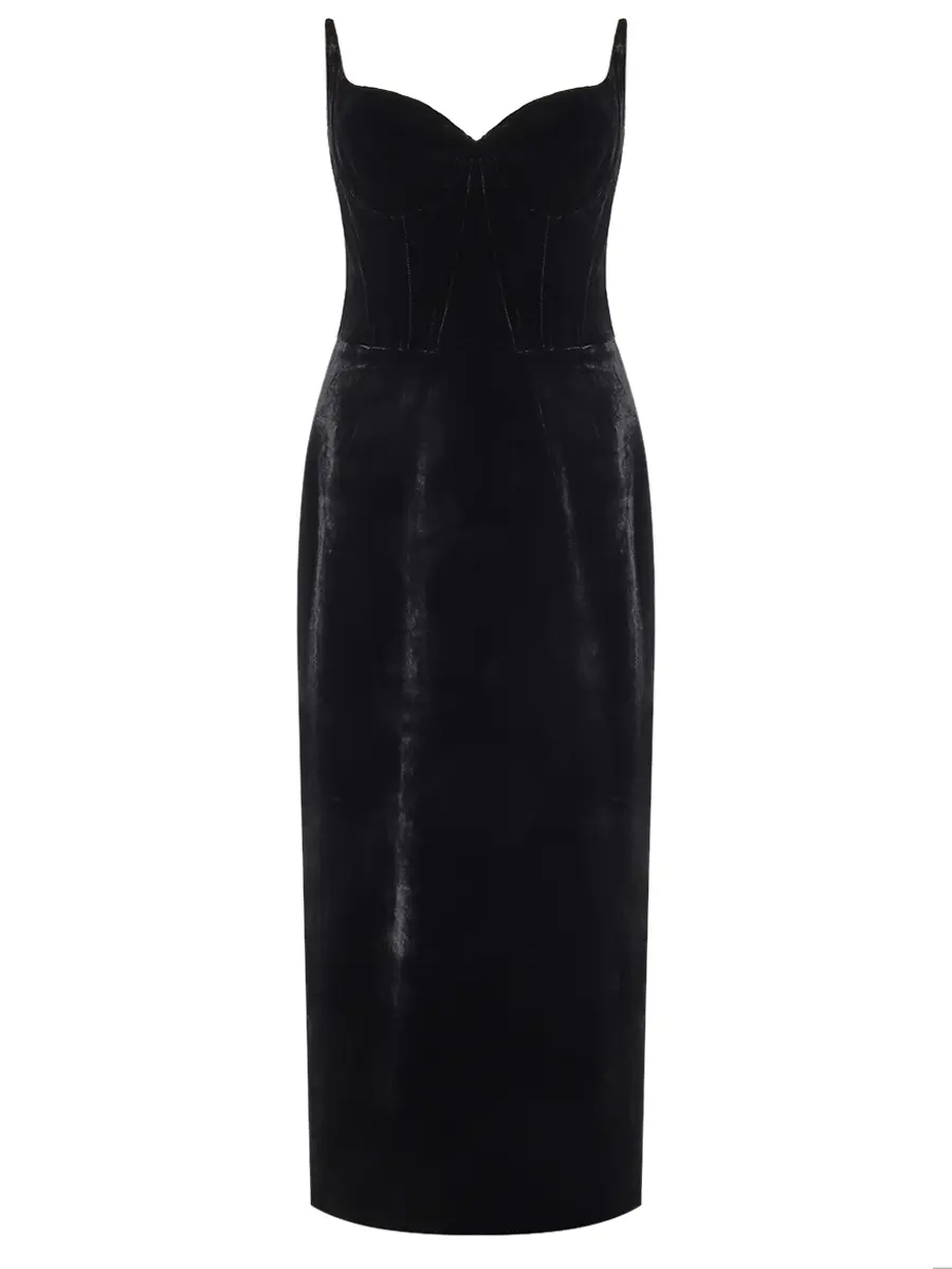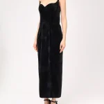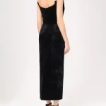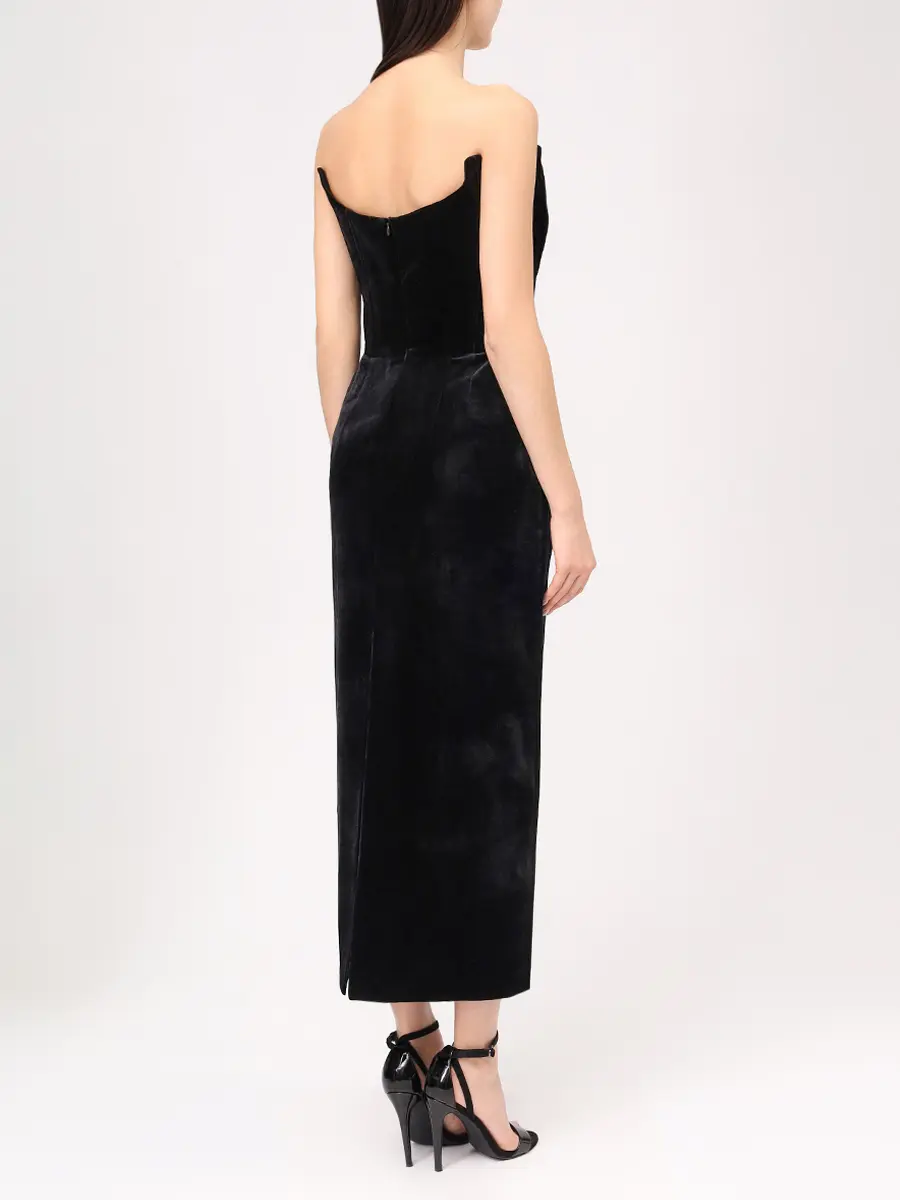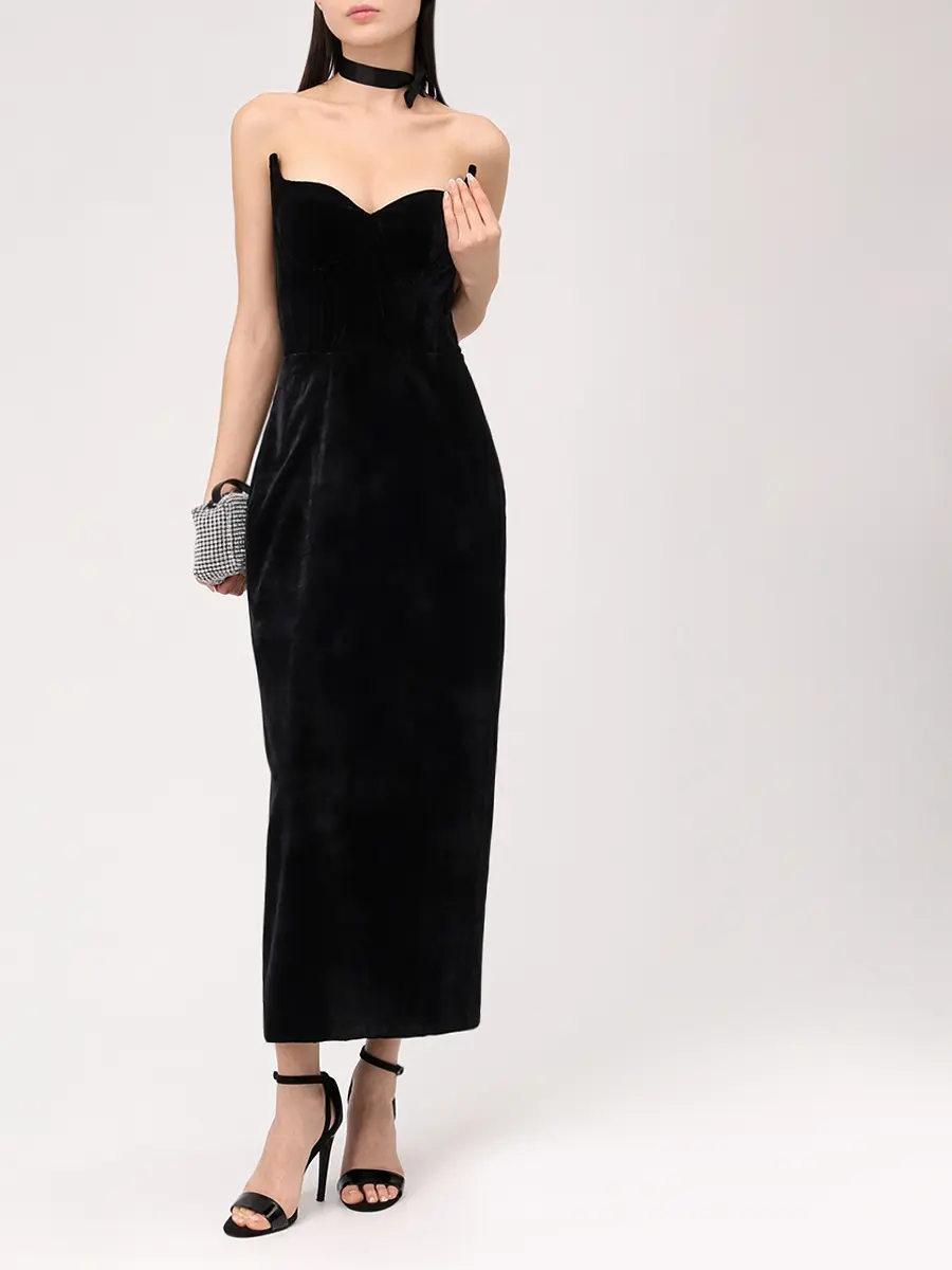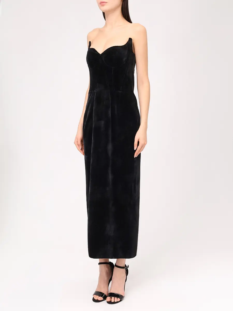 -Черное платье-макси из бархата на шифоне от MUSE ME. -Модель с корсетной основой, акцентом кроя на талии и бедрах, прямым подолом, глубоким вырезом декольте, застежкой на потайную молнию сзади.