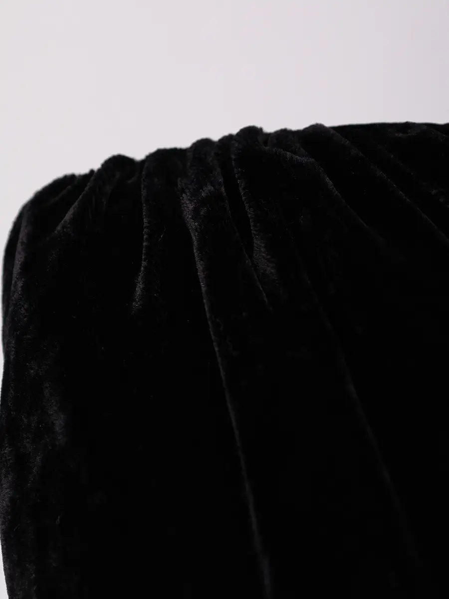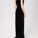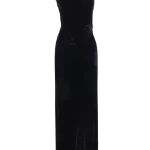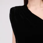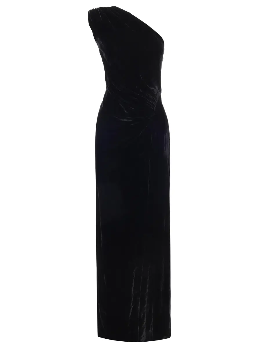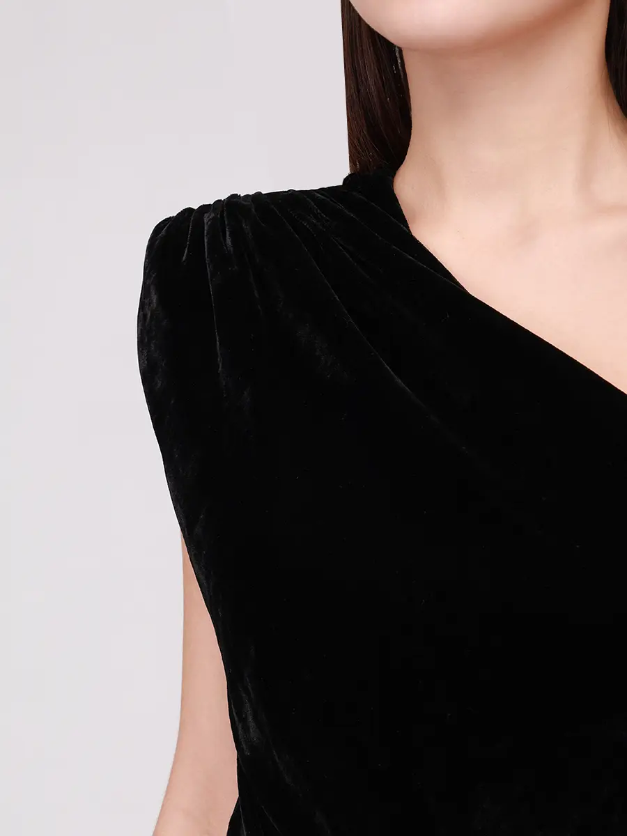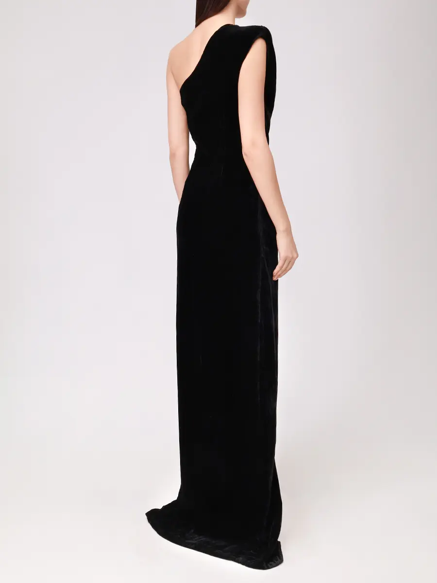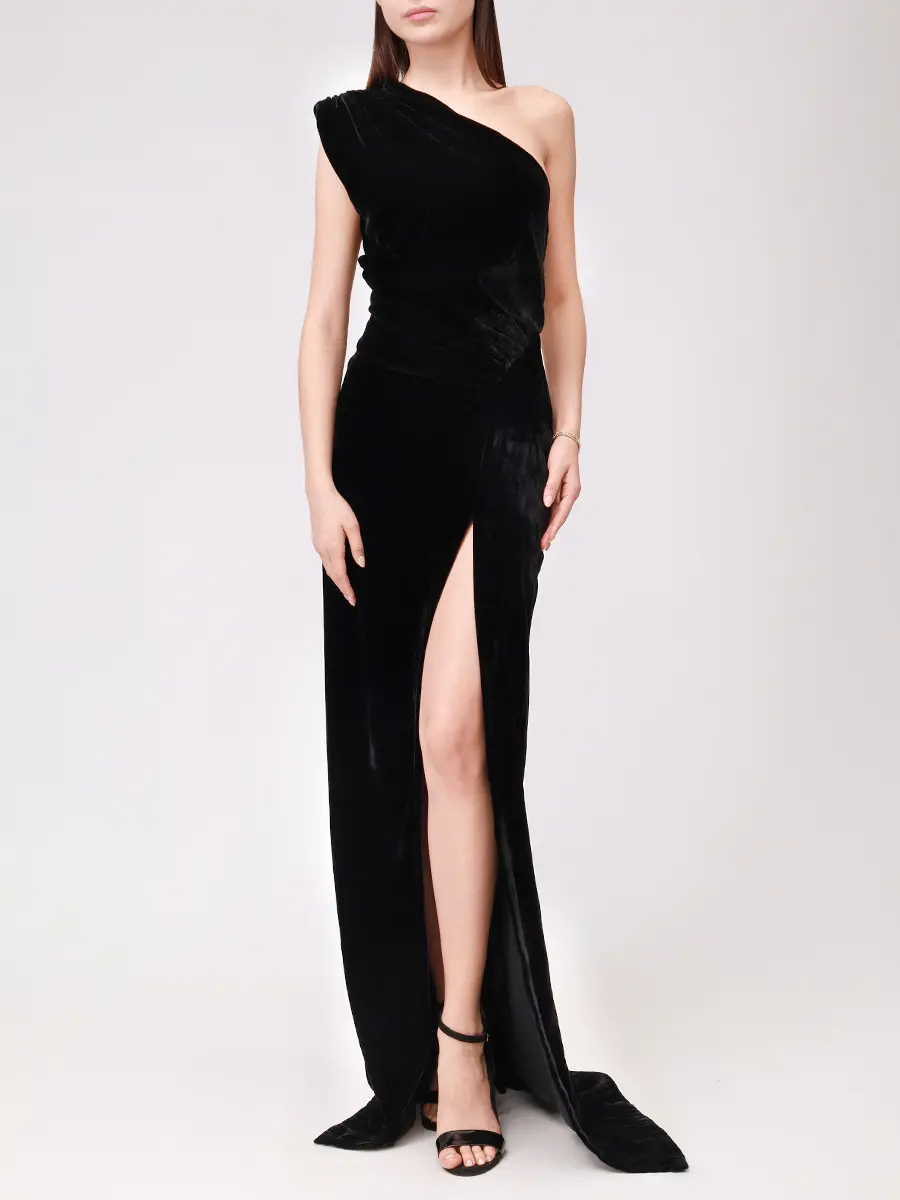-Черное бархатное платье от PHATEMM. -Модель асимметричного кроя на одно плечо с драпировками и застежкой на потайную молнию, высоким разрезом. -Элегантное платье дополнит вечерние образы.