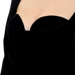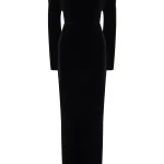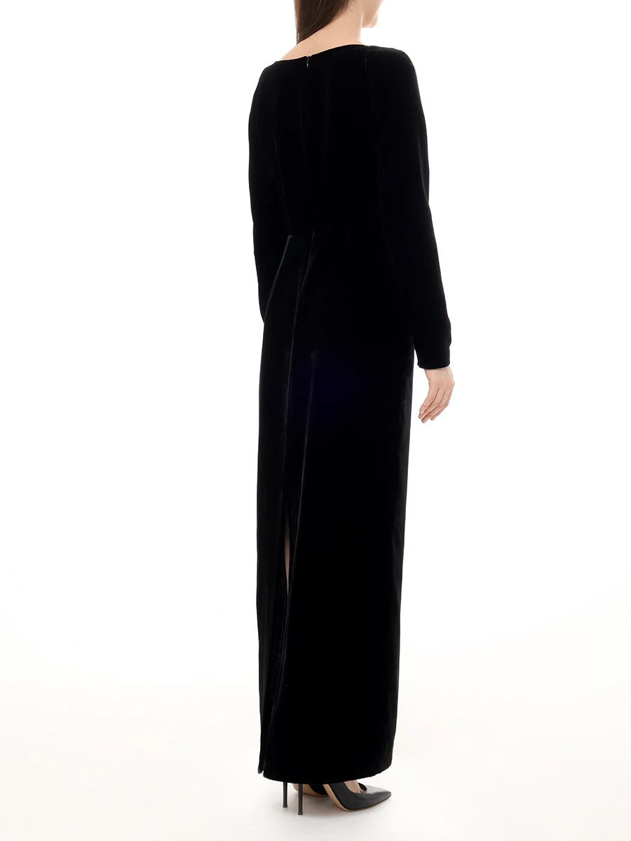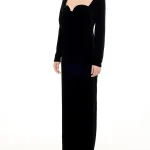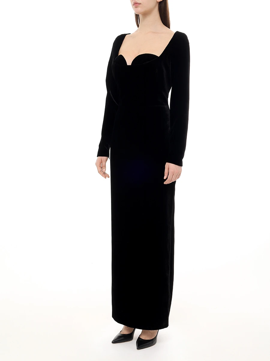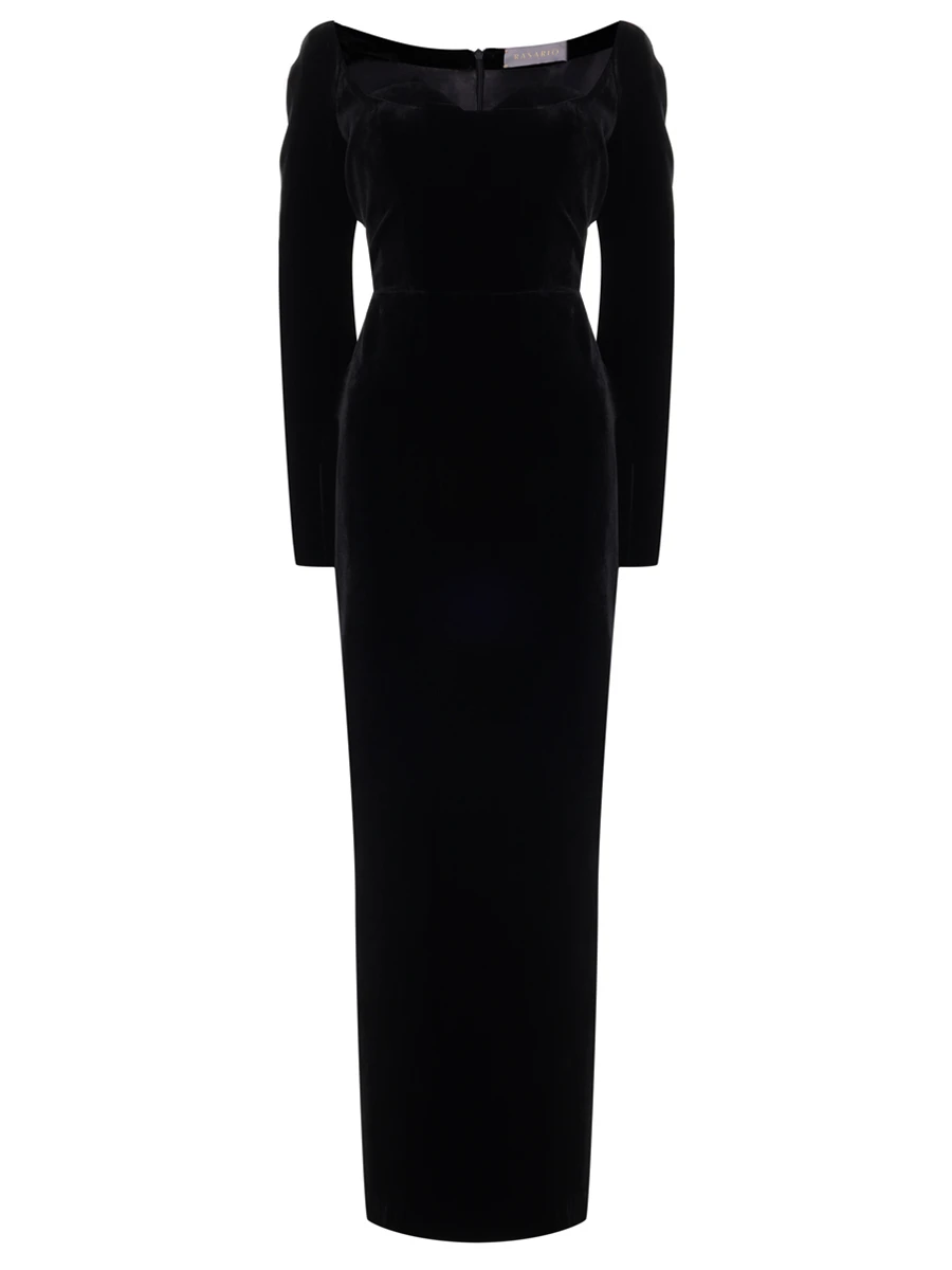 -Черное платье-макси из бархата купажированного состава от RASARIO. -Модель с акцентом кроя на талии и бедрах, длинными рукавами, чашками, которые обеспечивают комфортную посадку и хорошо поддерживают грудь, фигурным вырезом декольте. -Сзади платье дополнено застежкой на потайную молнию и высокой шлицей, которая обеспечивает комфортный шаг.