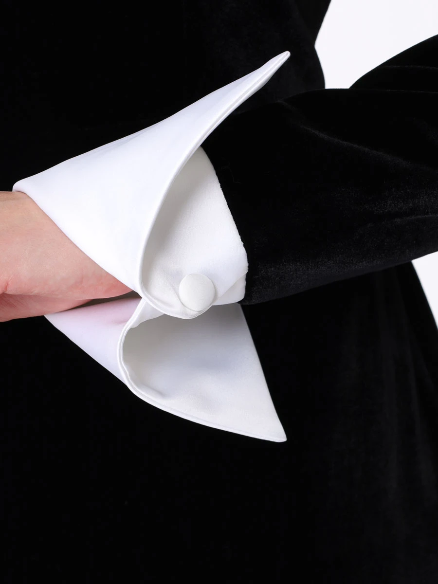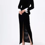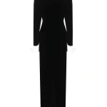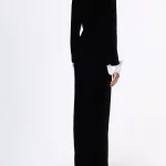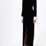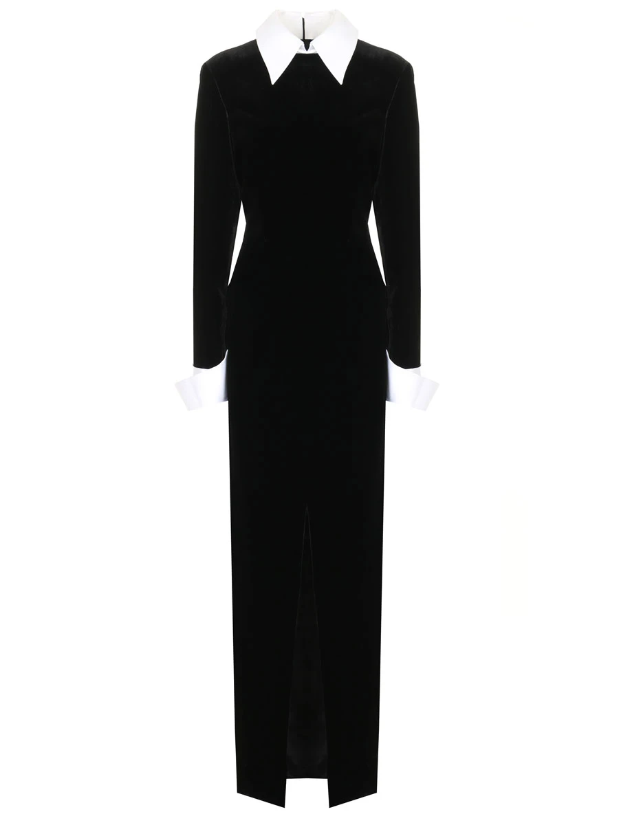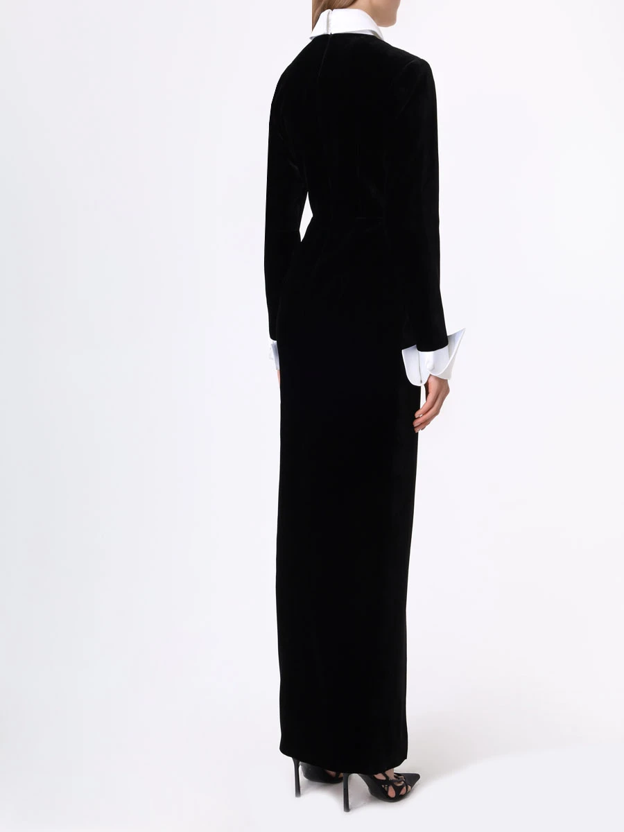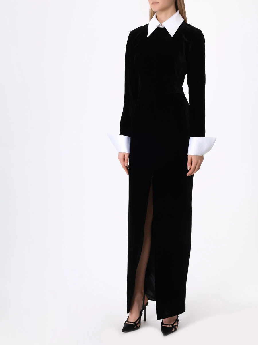 -Черное платье-макси из бархата и атласа от RASARIO. -Модель создаст эффектное впечатление на мероприятиях, благодаря крою, который подчеркивает фигуру, высокому разрезу и оригинальная игра контрастов черного и белого цветов.