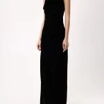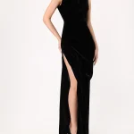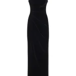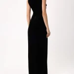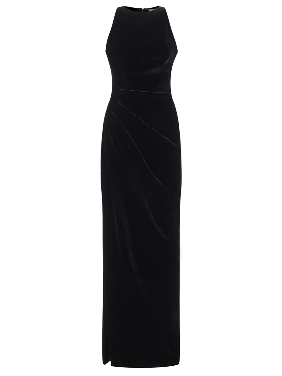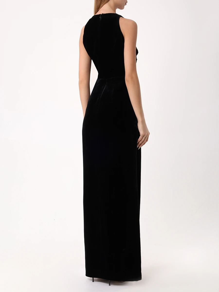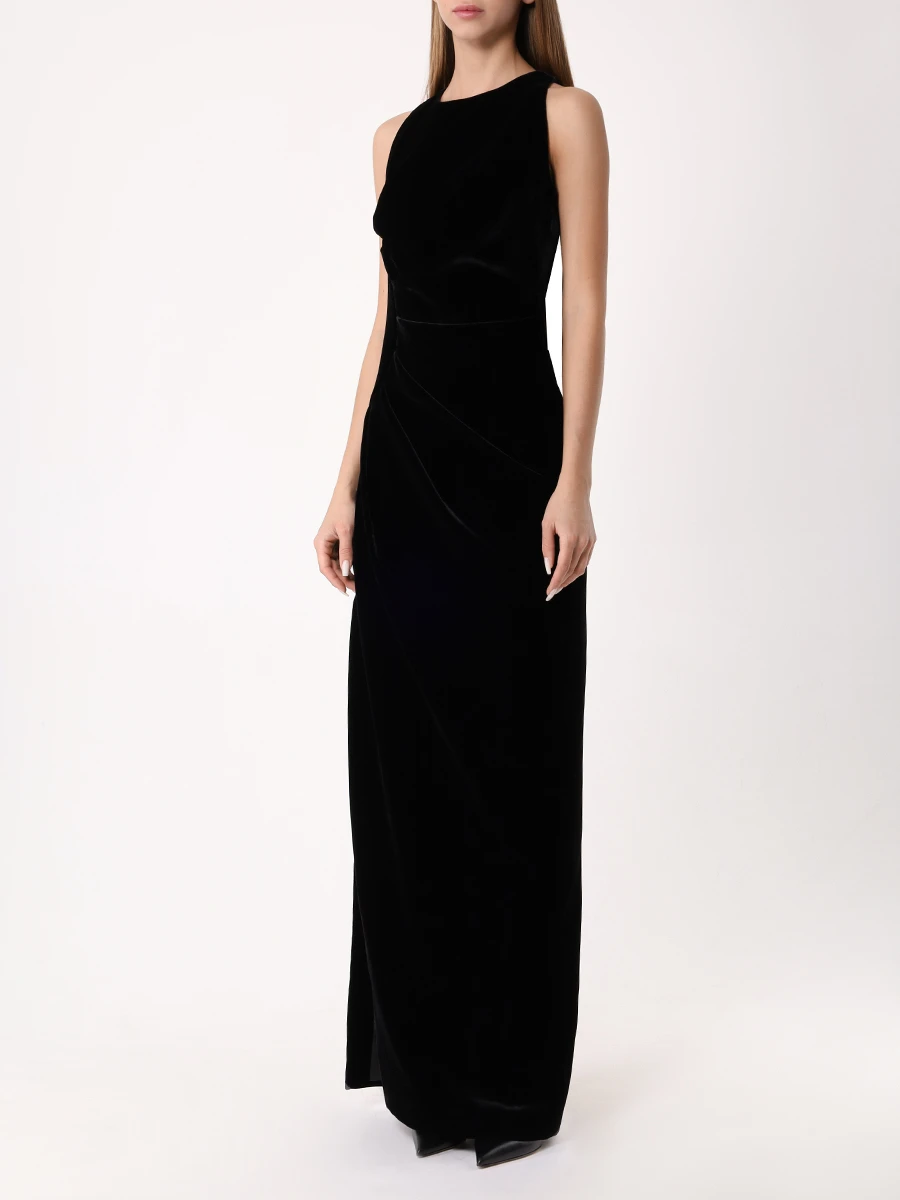 -Черное платье-макси из фактурного бархата от RASARIO. -Модель приталенного кроя с круглым вырезом горловины, драпировками на талии, высоким разрезом до бедра, застежкой на молнию сзади.