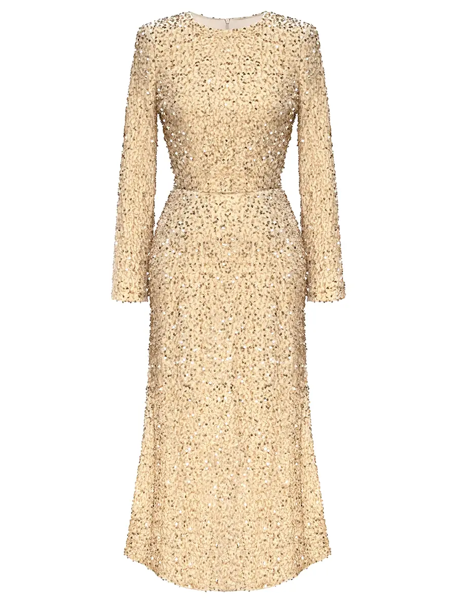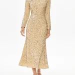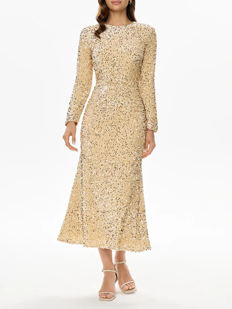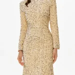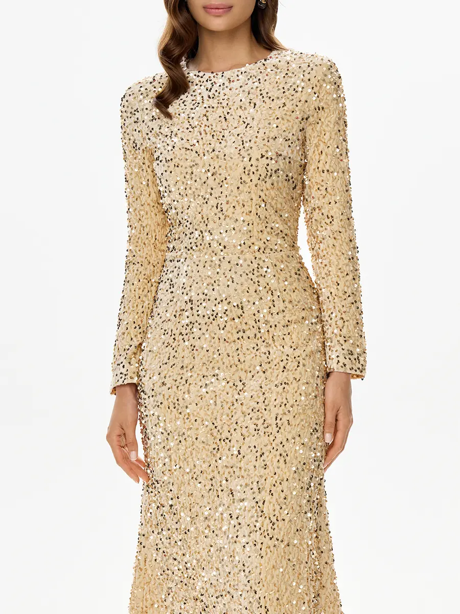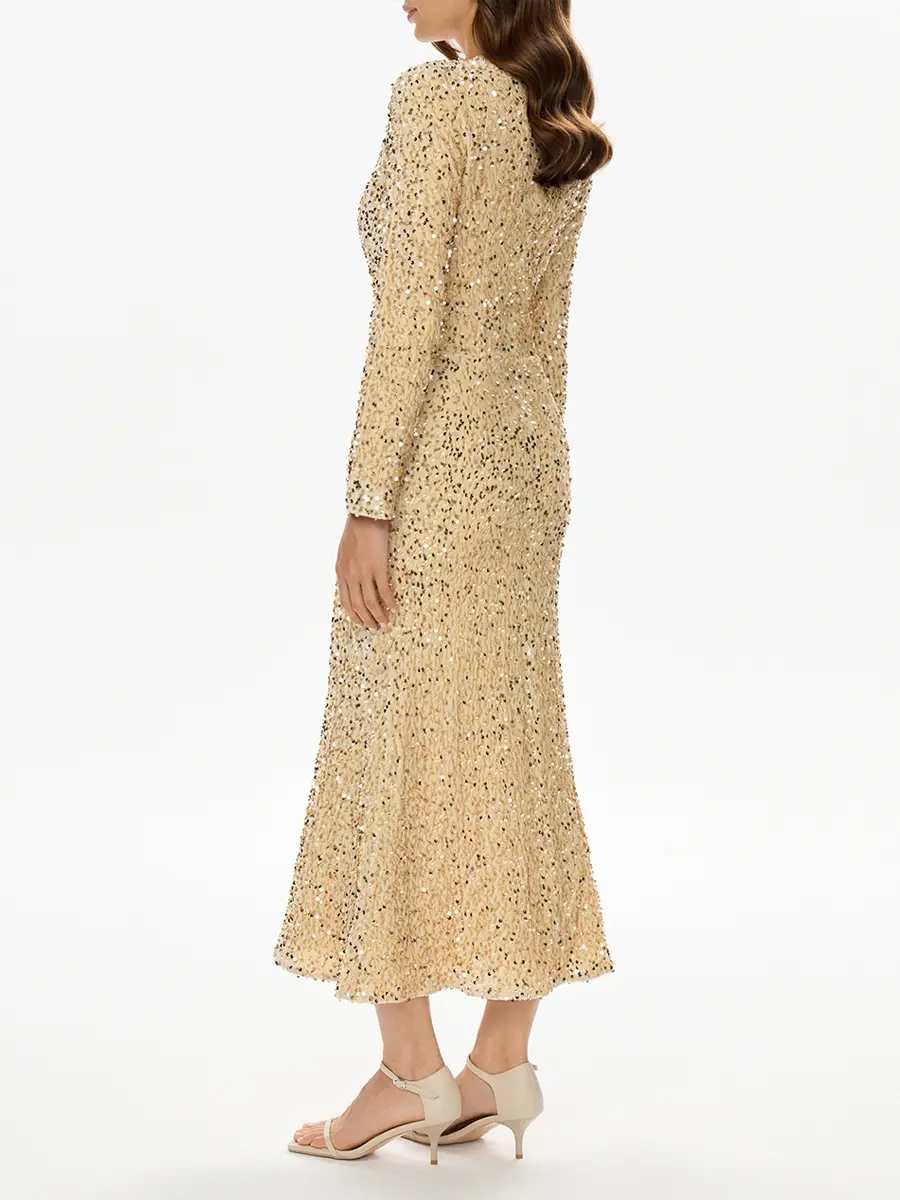 -Платье-миди в бежевом цвете от POST MERIDIEM. -Модель приталенного кроя с классической круглой горловиной, длиннымм рукавами и застежкой на молнию на спинке. -Сверкающая ткань, расшитая пайетками, выглядит эффектно и роскошно. -Изделие на подкладе. -Прекрасным дополнением станут туфли-лодочки, объемные серьги и клатч. Параметры изделия: Длина изделия от талии до низа: 90 см, длина (плечо+рукав): 69 см. Размер XS: ОГ: 82 см, ОТ: 63 см, ОБ: 88 см. Размер S: ОГ: 86 см, ОТ: 68 см, ОБ: 92см. Размер M: ОГ: 90 см, ОТ: 72 см, ОБ: 94 см. Размер L: ОГ: 92 см, ОТ: 76 см, ОБ: 100 см.