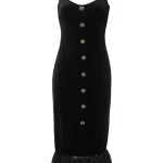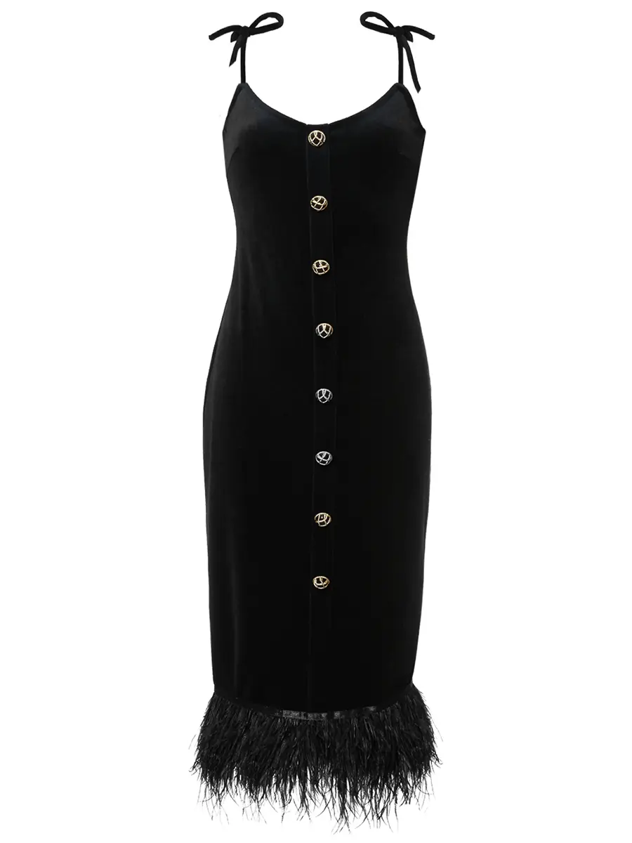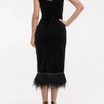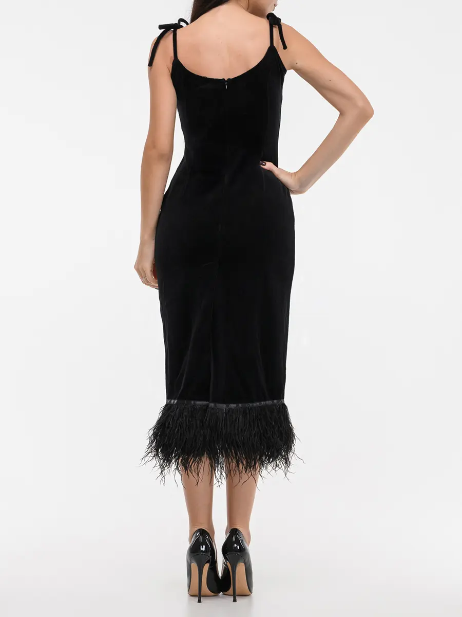 -Черное платье-миди из итальянского хлопкового бархата от ELJACKET. -Облегающий силуэт, красивая линия декольте и отделка перьями страуса создают роскошную комбинацию. -Завершающий штрих — акцентные пуговицы, благодаря которым платье не нуждается в дополнительных украшениях. -Как и всегда, команда бренда позаботилась о комфорте и индивидуальности каждой покупательницы, дополнив лиф завязками. -Благодаря им, Вы сможете регулировать посадку по своему желанию и вкусу. -Платье в длине миди — воплощение чистой элегантности и шика.