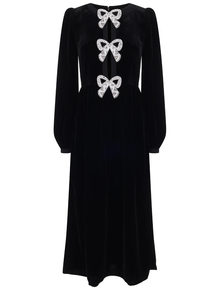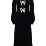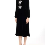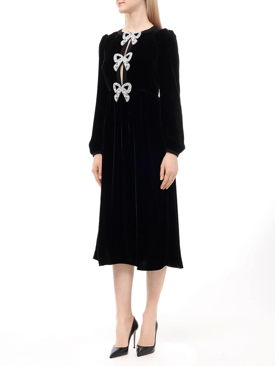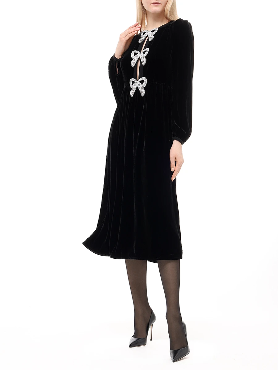 -Черное платье-миди из фактурного бархата на основе смесовой вискозы от SALONI. -Модель приталенного кроя с длинными рукавами, круглым вырезом горловины, застежкой на потайную молнию сзади, глубоким вырезом в зоне декольте. -Сдержанный блеск бархата и глубокий черный цвет подчеркивает декор жемчужными бусинами, бисером и стразами на трех бантах спереди.
