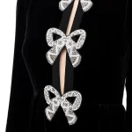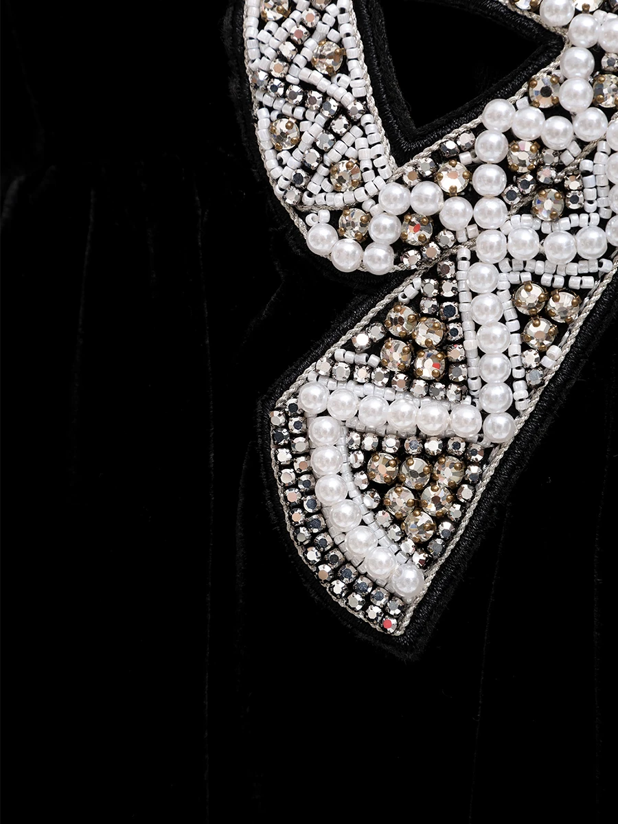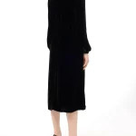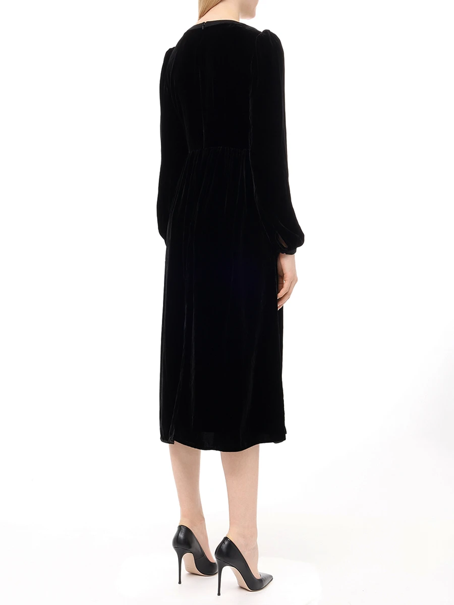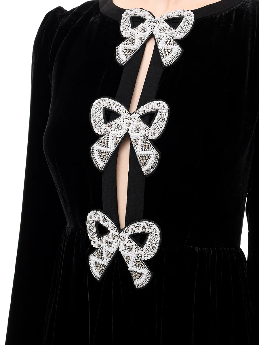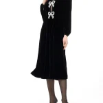 -Черное платье-миди из фактурного бархата на основе смесовой вискозы от SALONI. -Модель приталенного кроя с длинными рукавами, круглым вырезом горловины, застежкой на потайную молнию сзади, глубоким вырезом в зоне декольте. -Сдержанный блеск бархата и глубокий черный цвет подчеркивает декор жемчужными бусинами, бисером и стразами на трех бантах спереди.