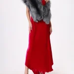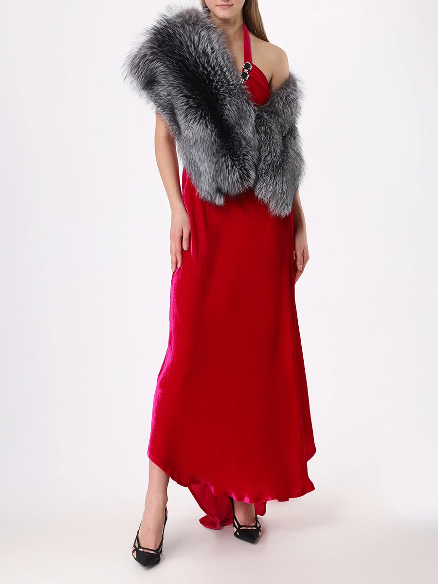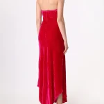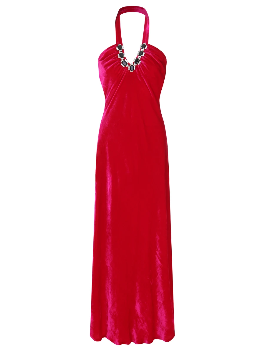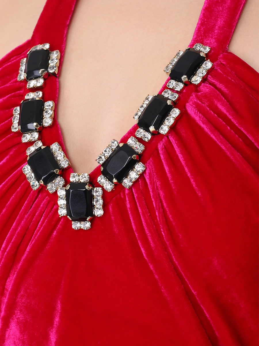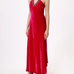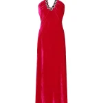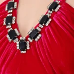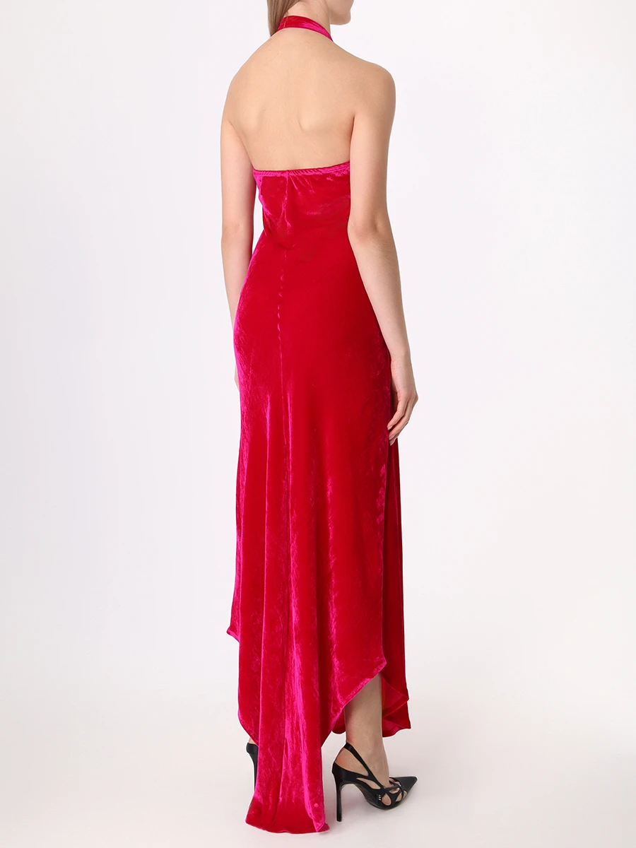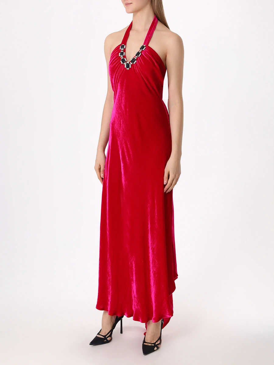 -Красное платье из бархата от TATYANA NAIDENOVA. -Асимметричная длина макси, приталенный силуэт, глубокий V-образный вырез с отделкой камнями, бретель на шее, открытая спинка.
