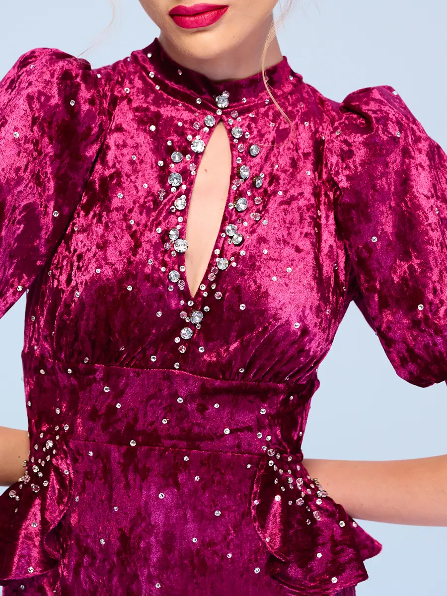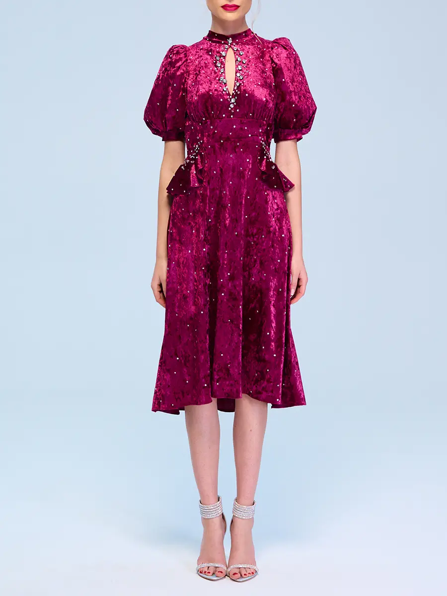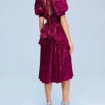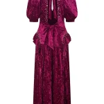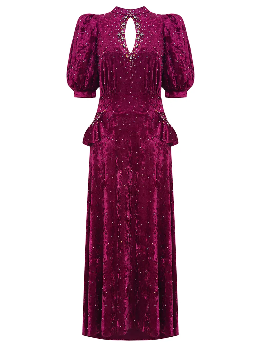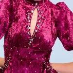 -Изысканное платье глубокого винного оттенка с кристальной отделкой от THE NAMES. -Акцентный вырез и выразительные рукава подчёркивают элегантный силуэт. -Идеальный выбор для вечерних и торжественных выходов.