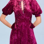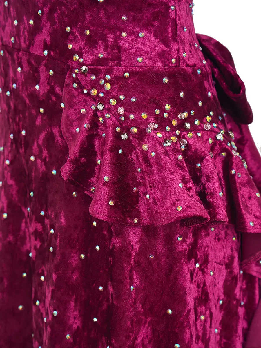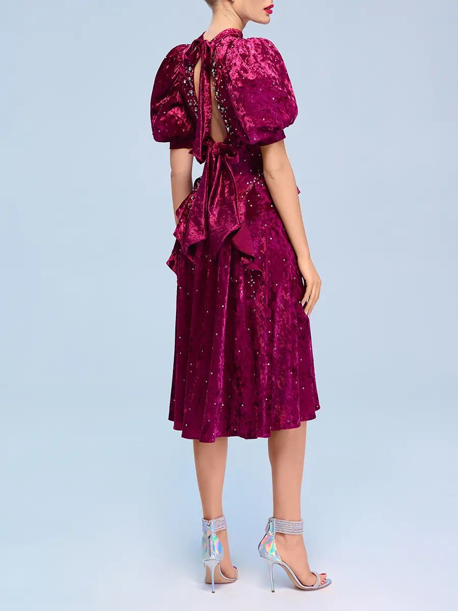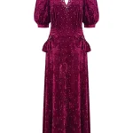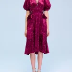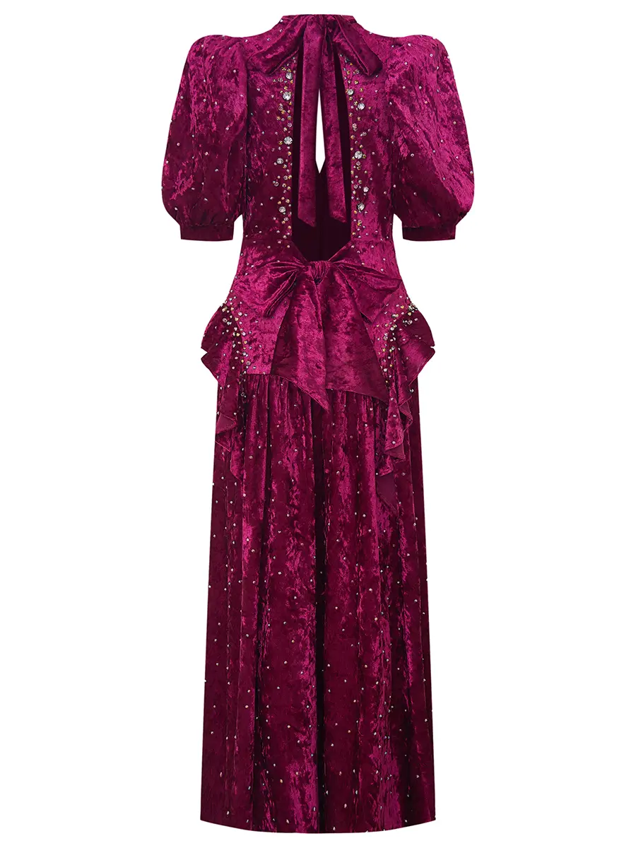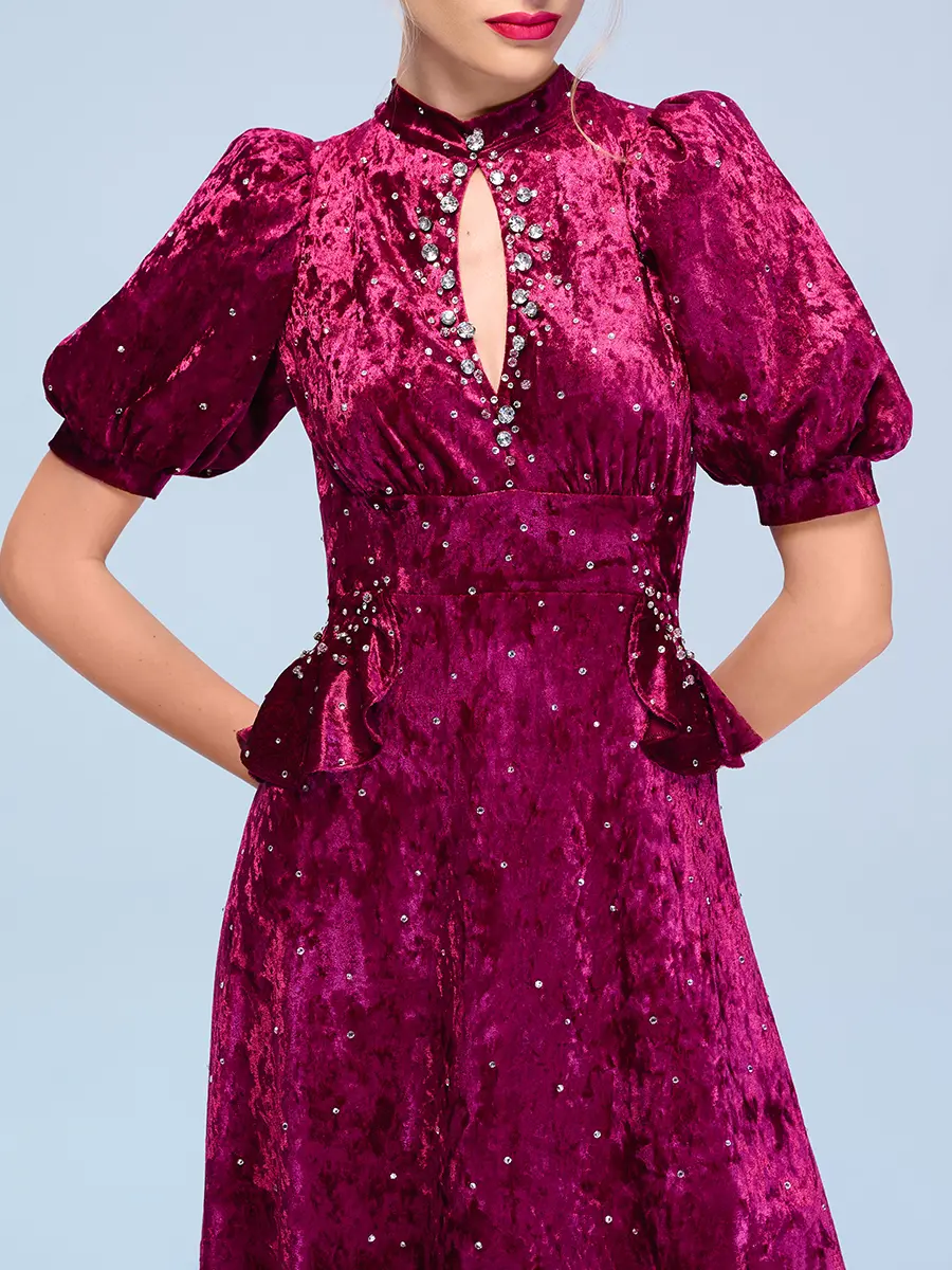 -Изысканное платье глубокого винного оттенка с кристальной отделкой от THE NAMES. -Акцентный вырез и выразительные рукава подчёркивают элегантный силуэт. -Идеальный выбор для вечерних и торжественных выходов.