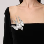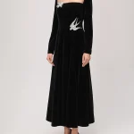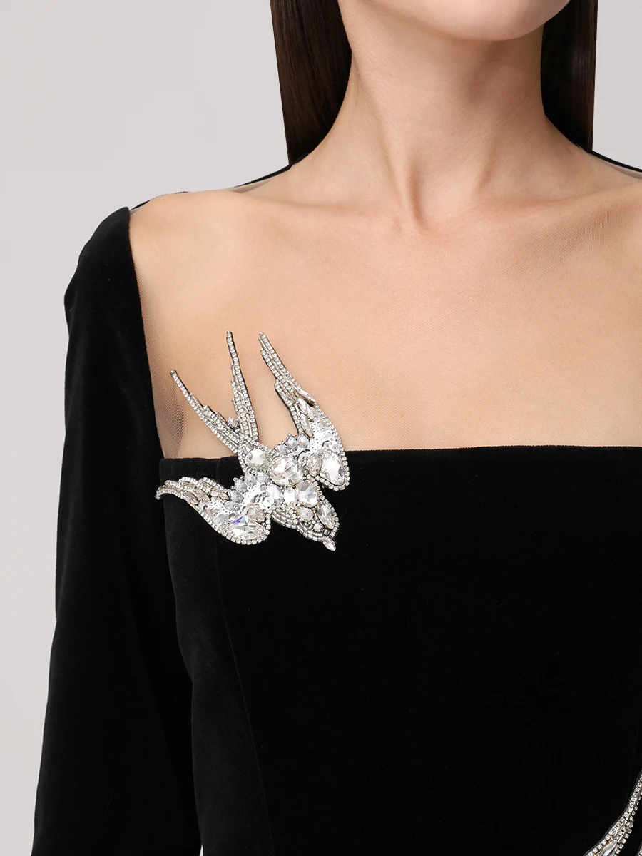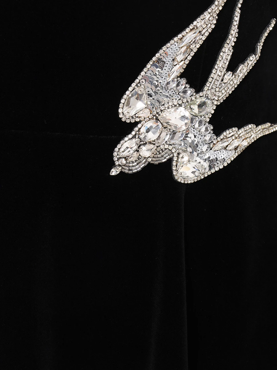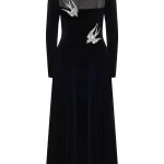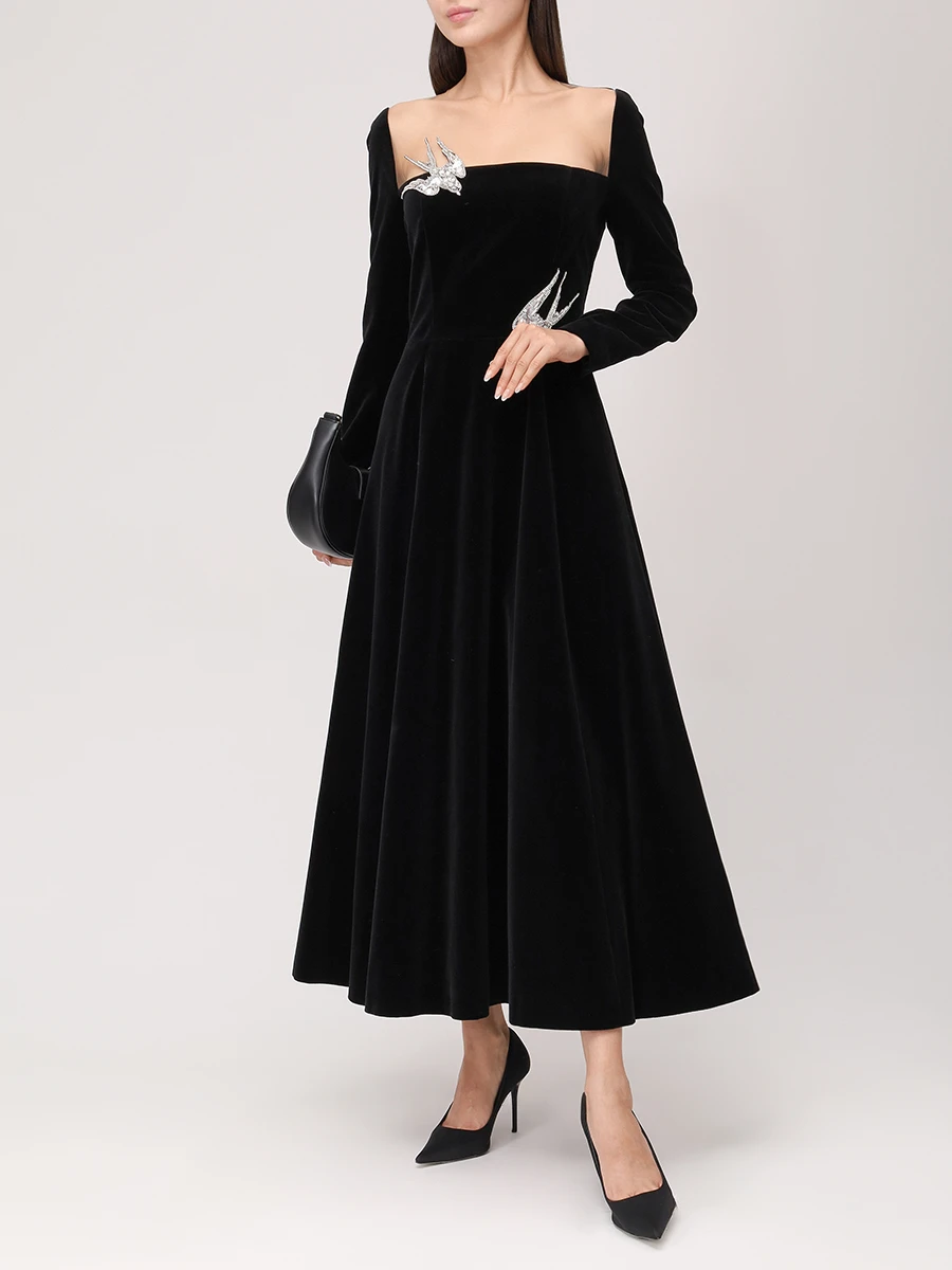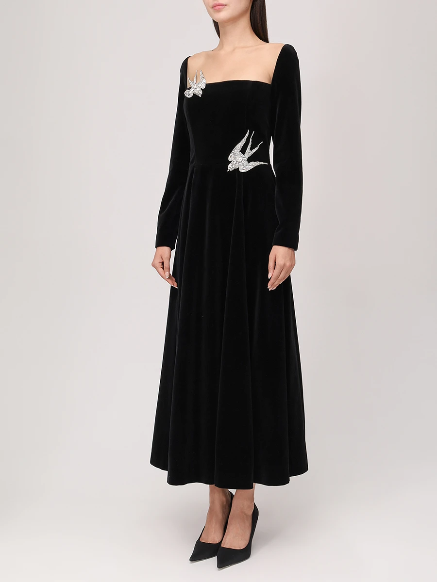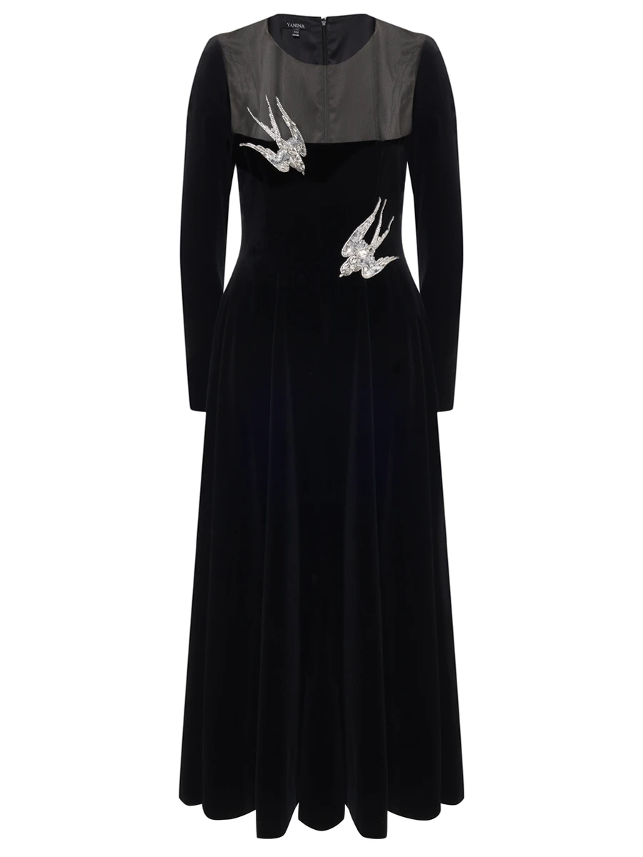 -Черное платье-макси из хлопкового стрейч-бархата от YANINA. -Модель с акцентом кроя на отрезной линии талии, длинными рукавами, отделкой нюдовой сеткой на груди и декором крупными стразами, пайетками и бисером, из которых сложены красивые птицы. -Застежка на потайную молнию сзади не отвлекает от чистоты линий кроя.