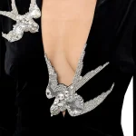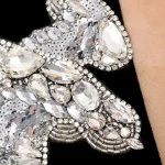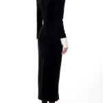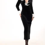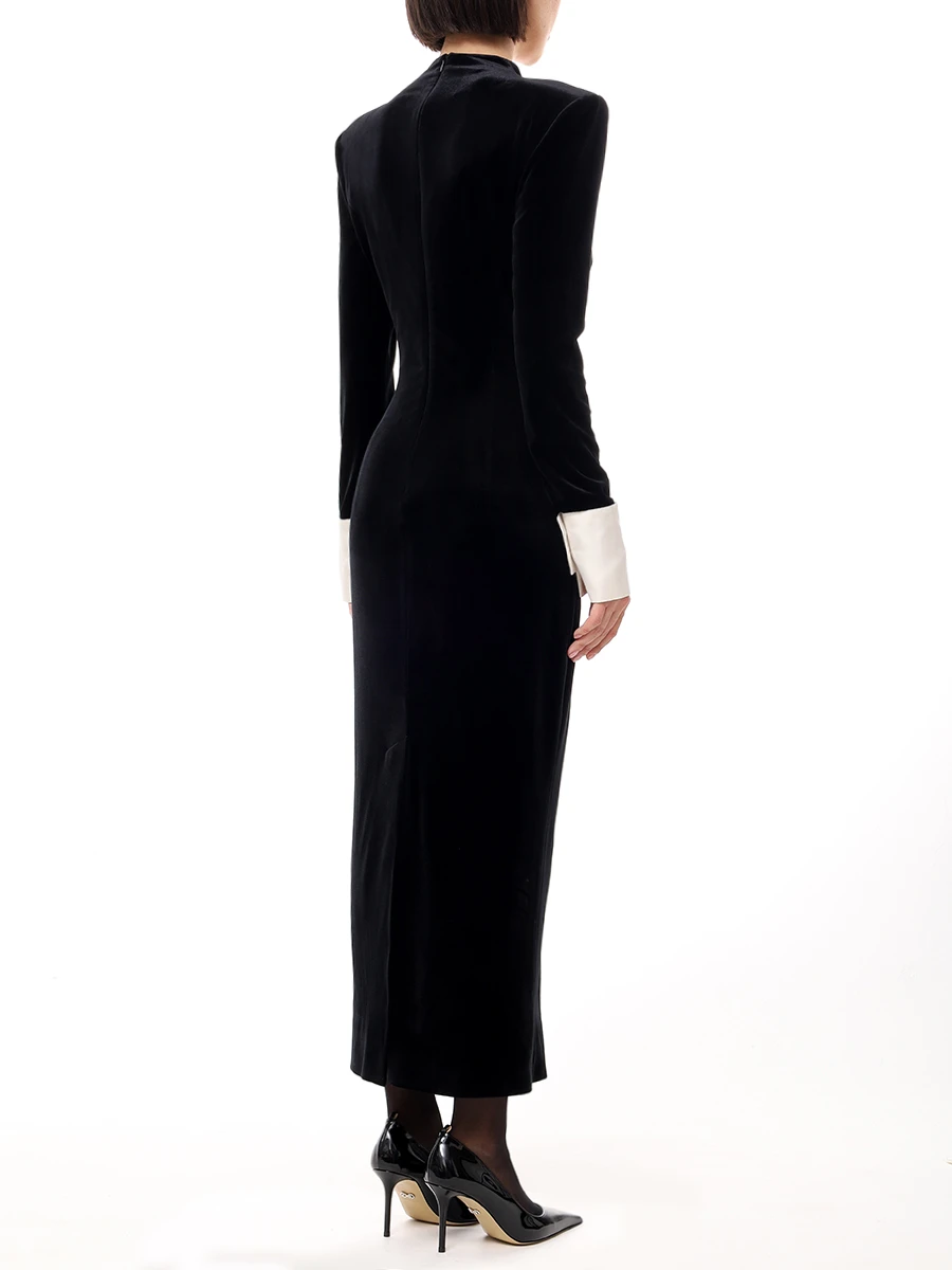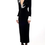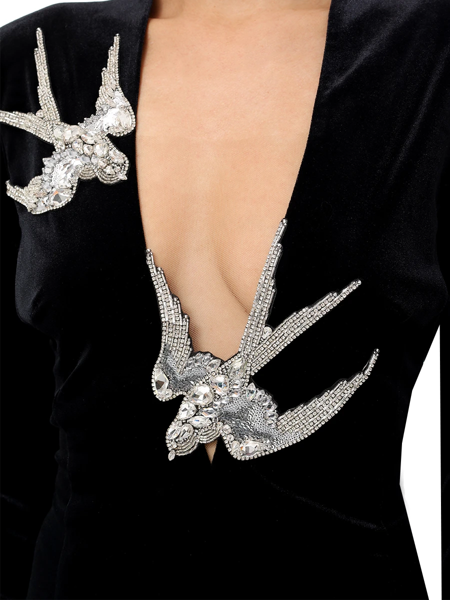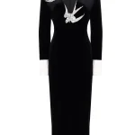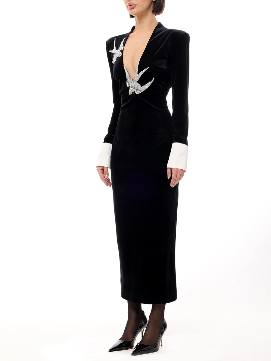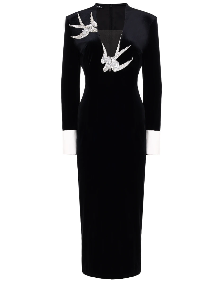 -Черное платье-миди из стрейч-бархата от YANINA. -Модель приталенного кроя с длинными рукавами, съемными белыми манжетами, глубоким вырезом декольте с нюдовой сеткой и декором в виде птиц, расшитых пайетками, застежкой на потайную молнию сзади.