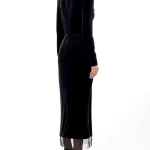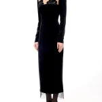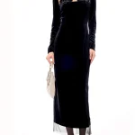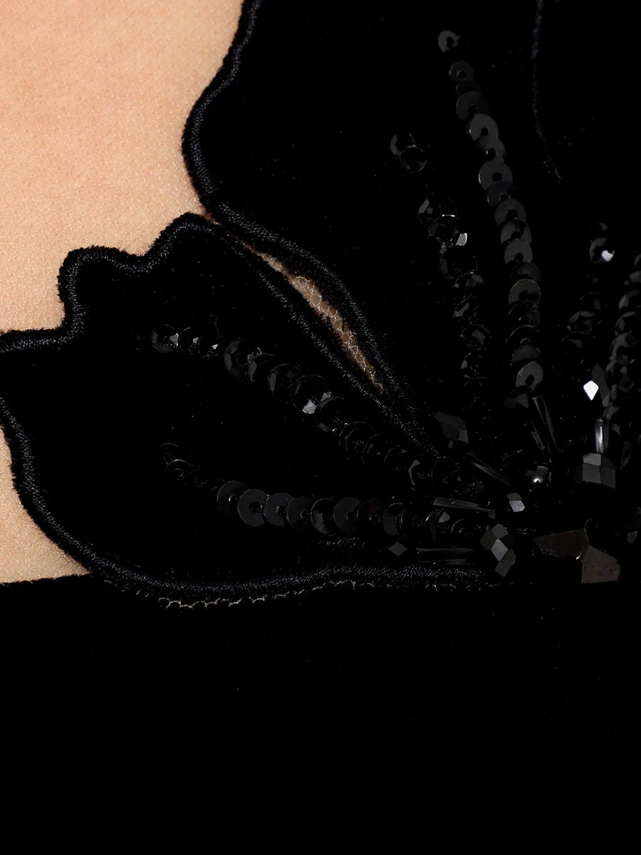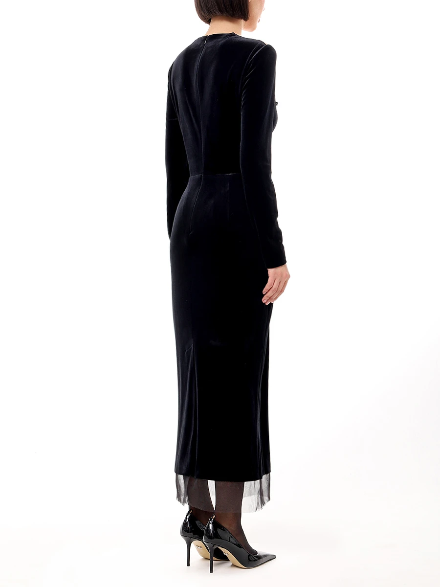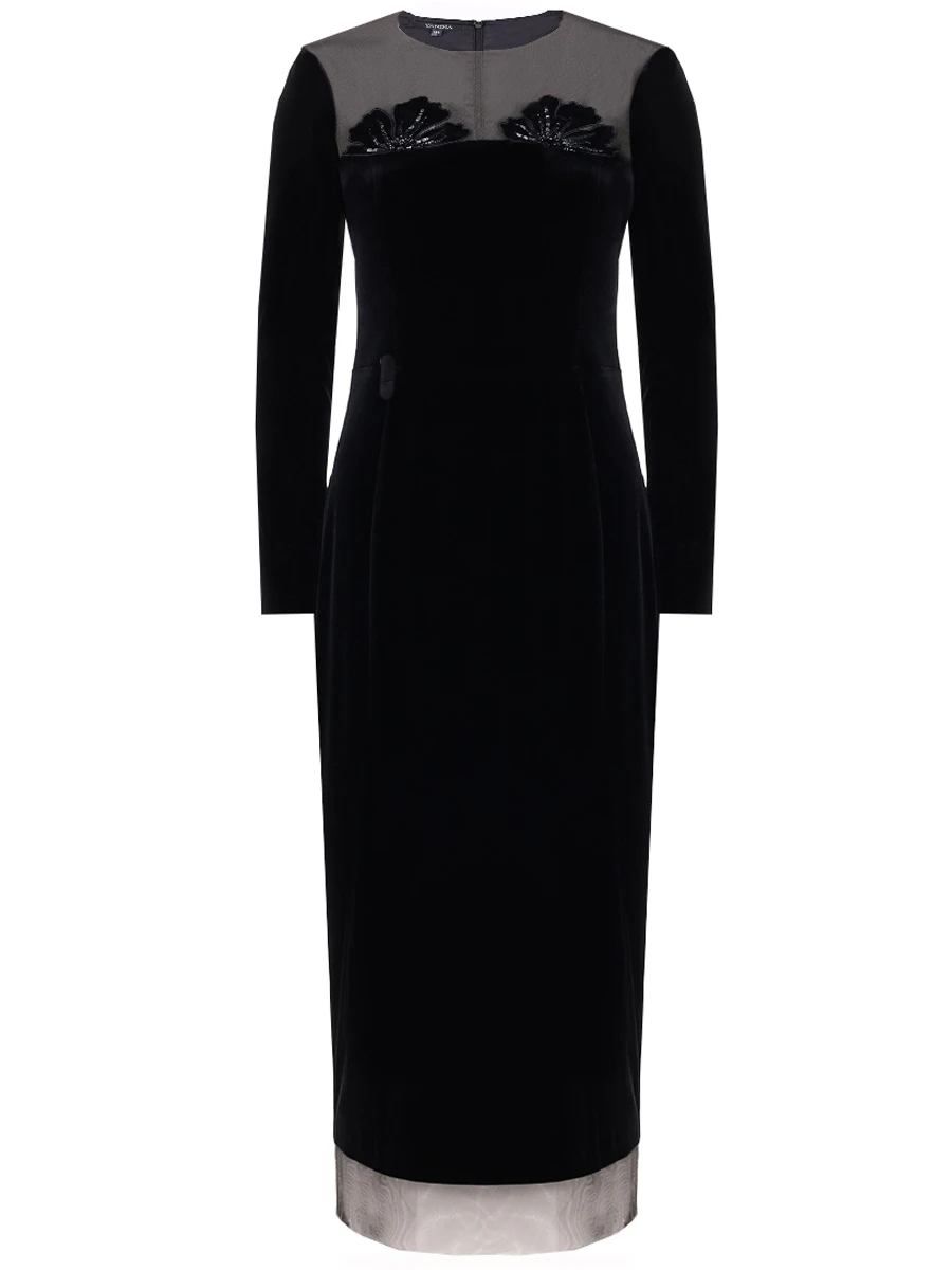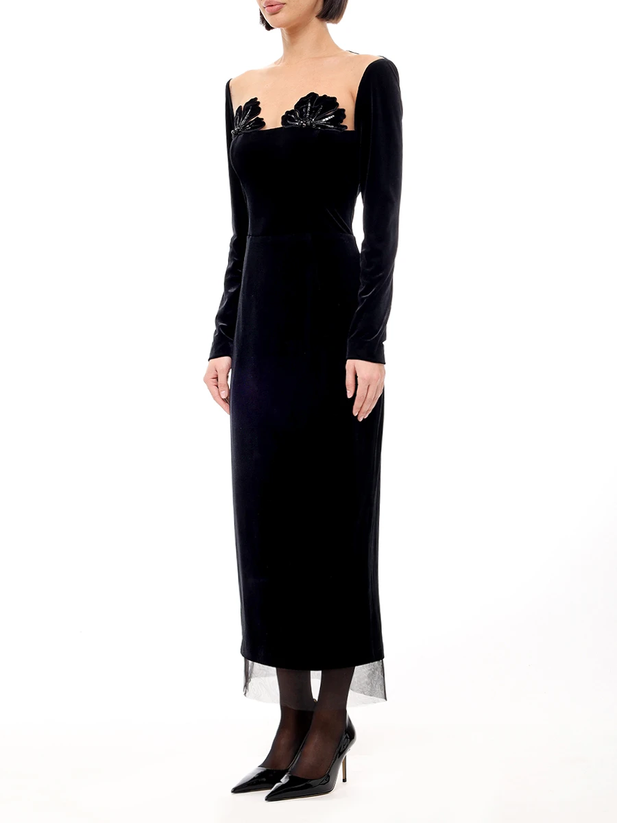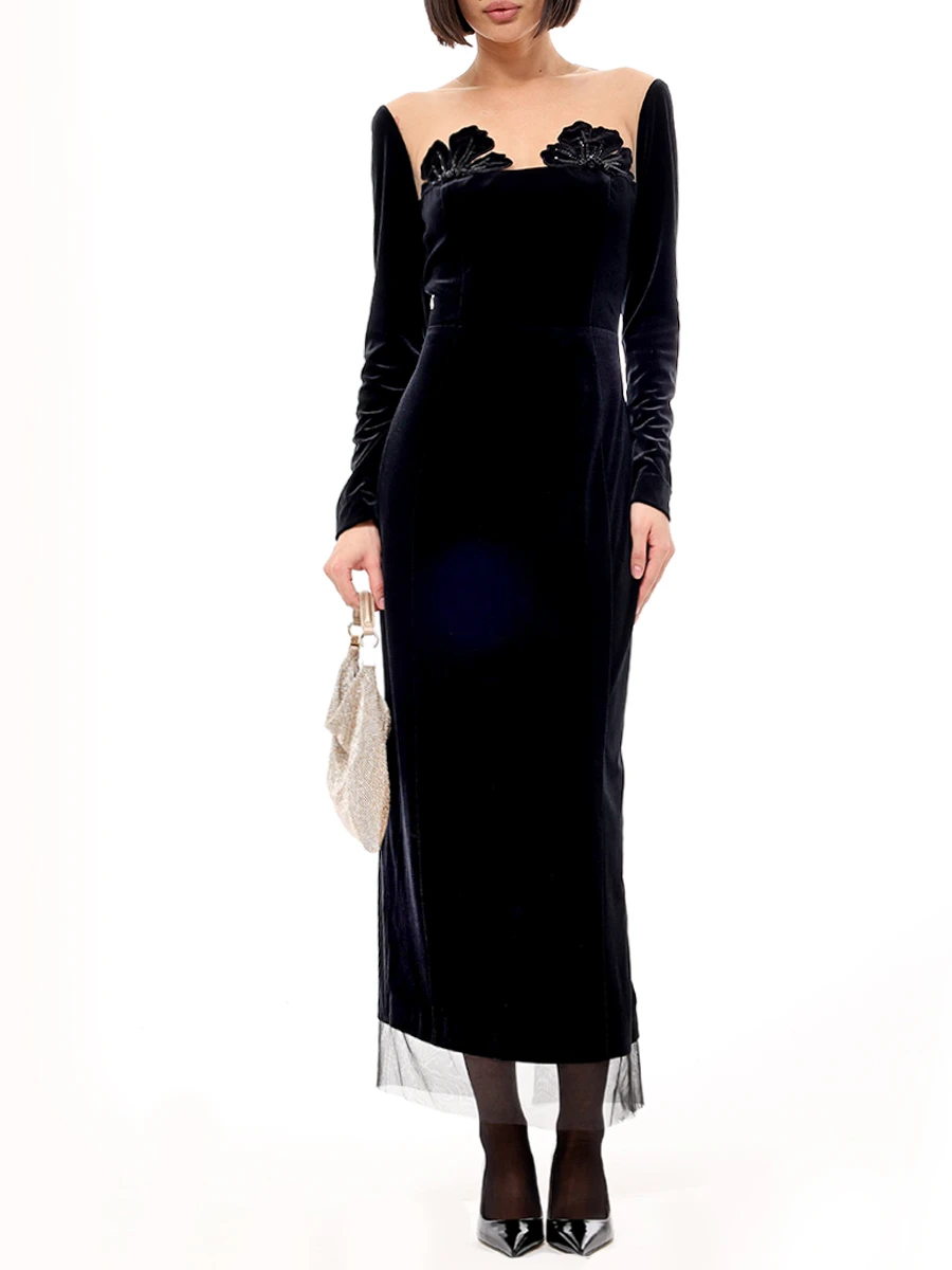 -Черное платье-миди из стрейч-бархата от YANINA. -Модель приталенного кроя с длинными рукавами, глубоким вырезом декольте с нюдовой сеткой и декором с пайетками, отделкой подола из сетки в тон, застежкой на молнию сзади.
