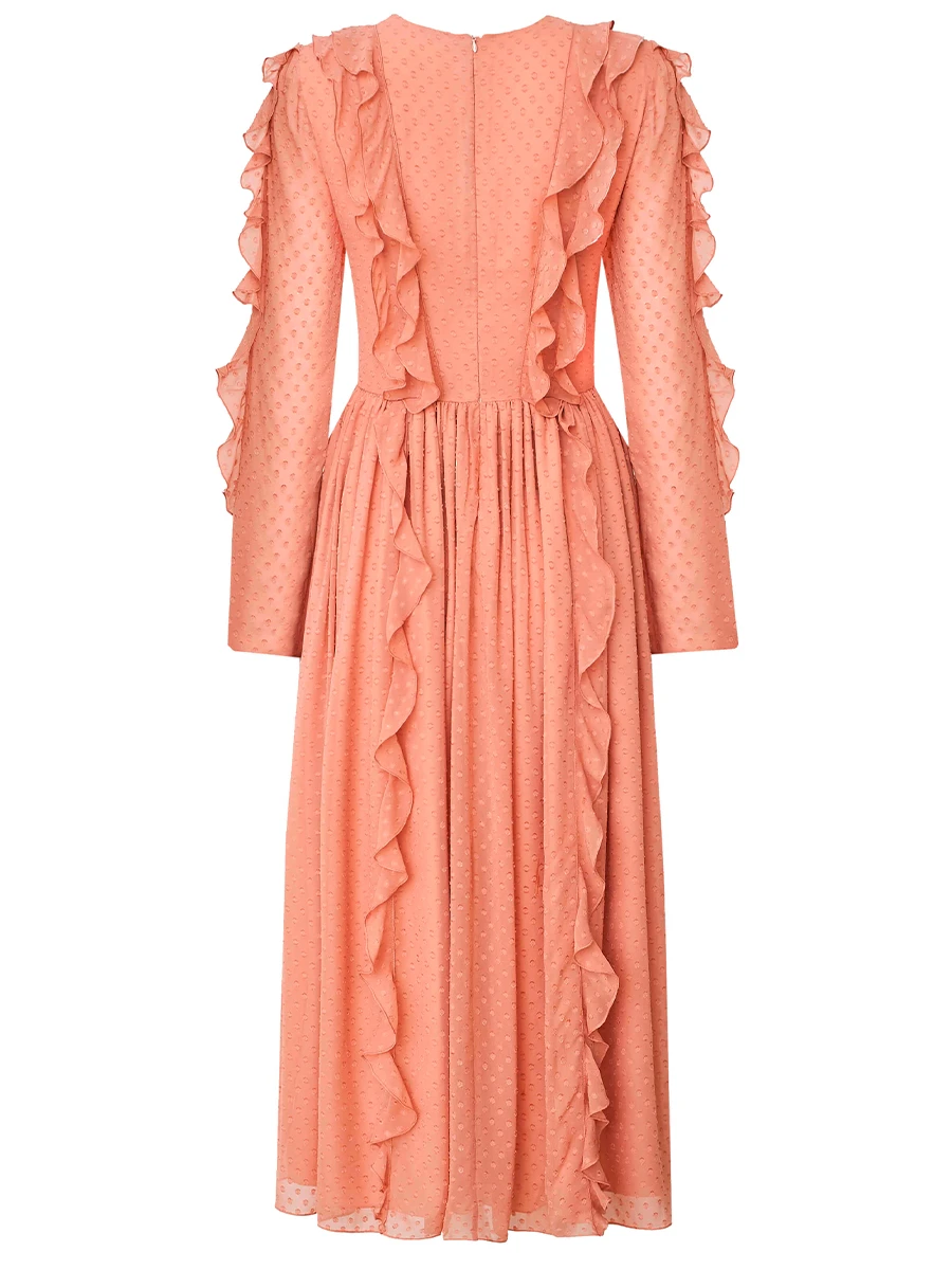 -Платье в розовом цвете от LORER. -Круглый вырез горловины, длинные рукава, застежка — молния.