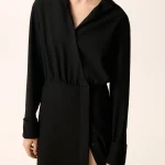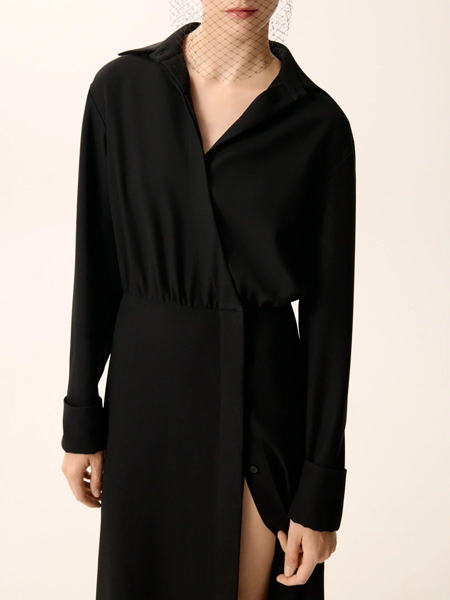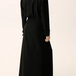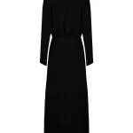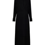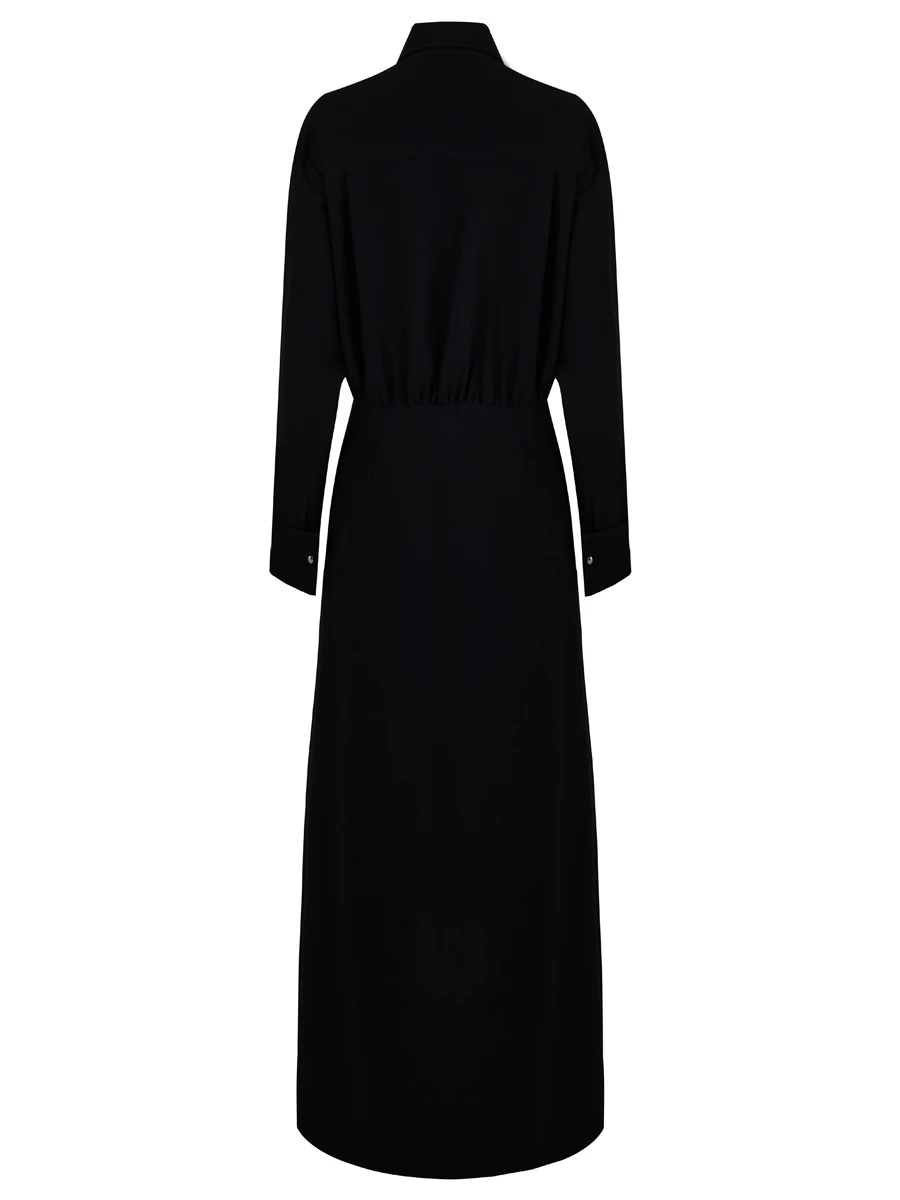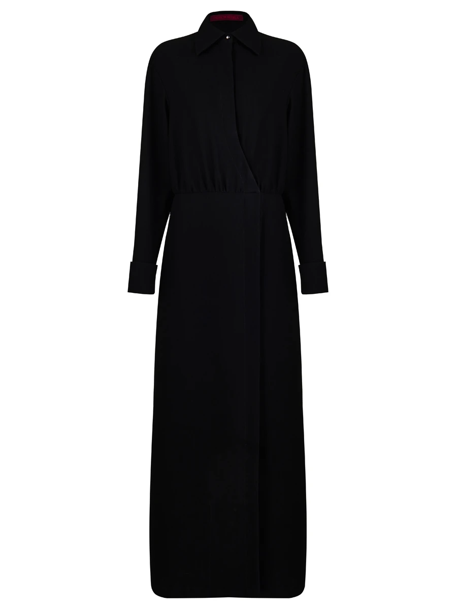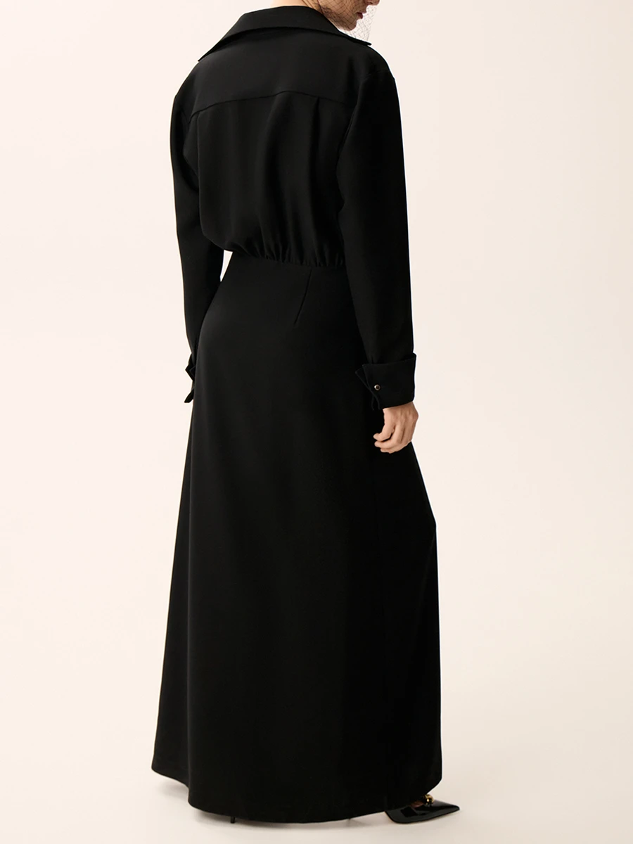 -Черное платье-макси с эффектным разрезом от FASHION REBELS. -Лаконичный сдержанный крой с длинными рукавами и длиной в пол уравновешивает разрез, откровенность которого вы можете отрегулировать с помощью пуговицы.