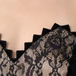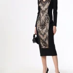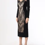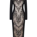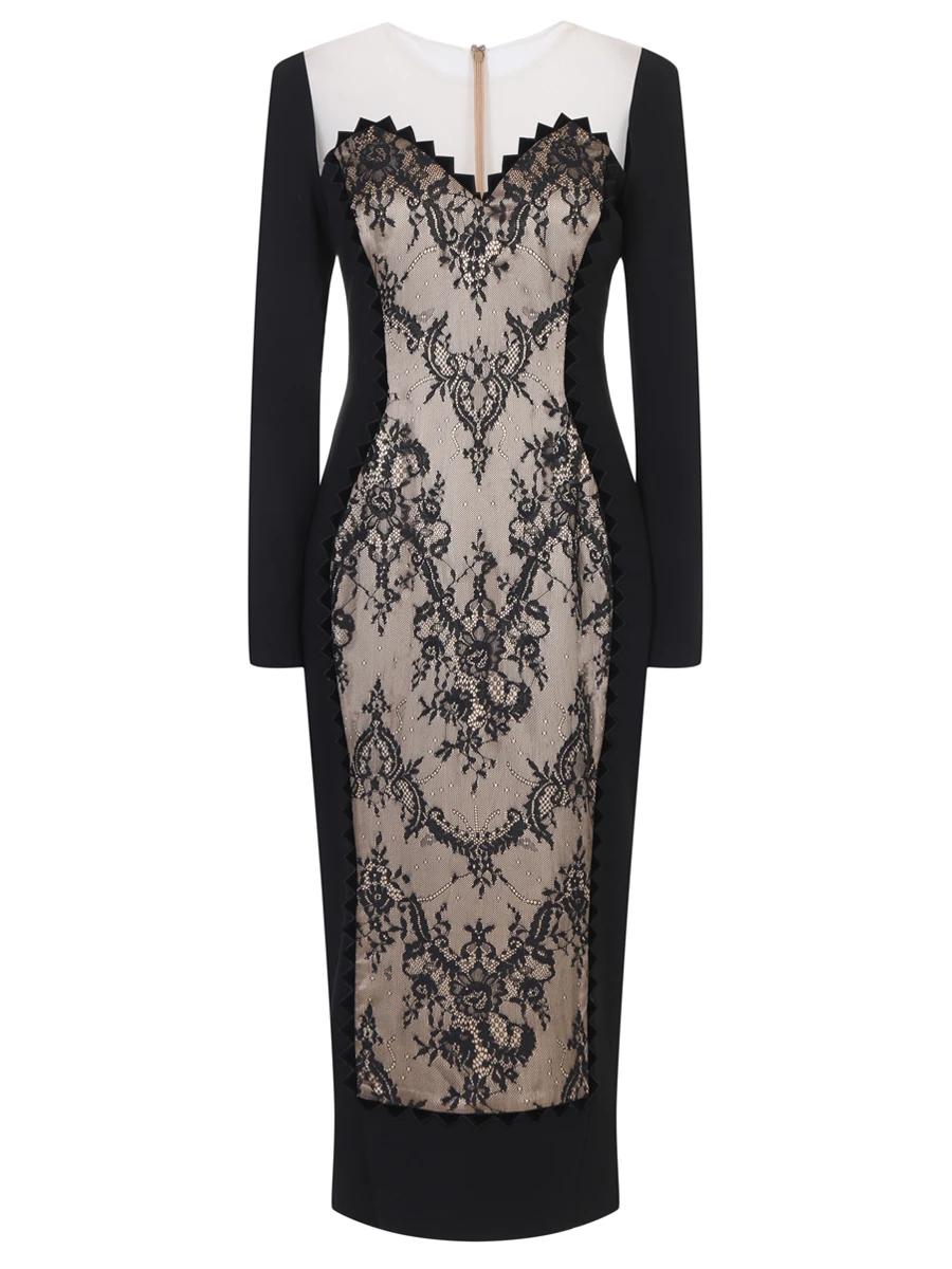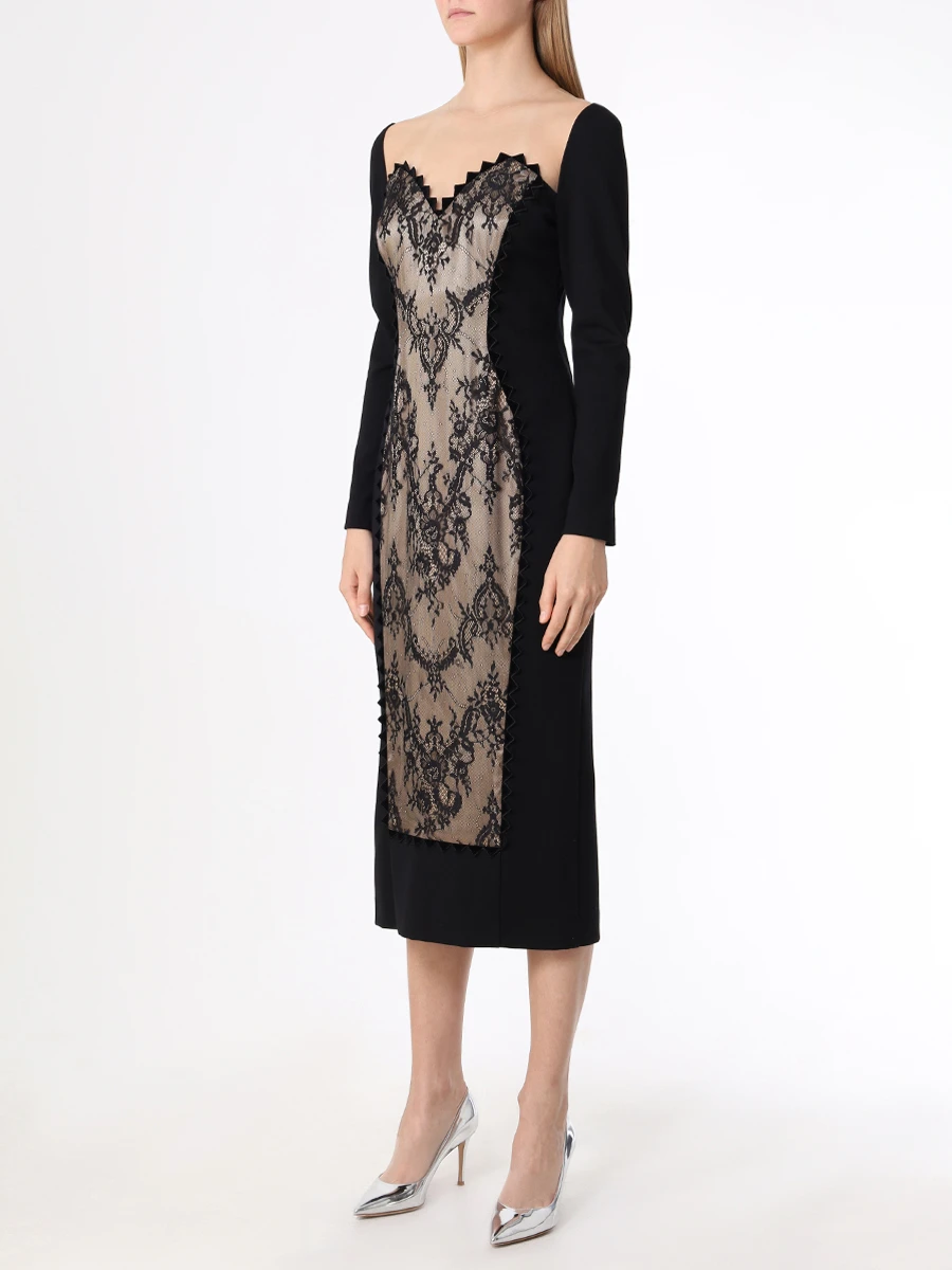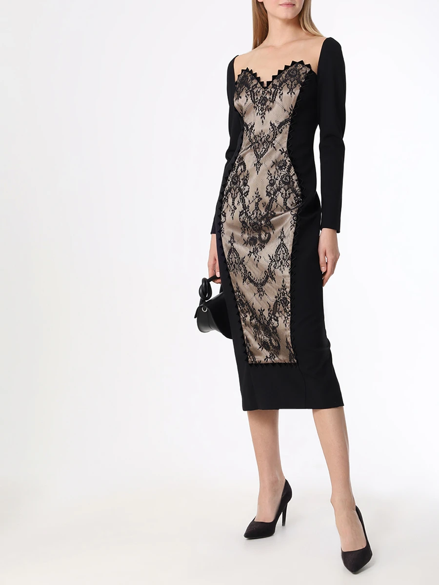 -Черное платье-миди из вискозы от YANINA. -Модель с кроем по фигуре, длинными рукавами, кружевной отделкой спереди, фигурным вырезом на груди с фестончатым декором, тонкой нюдовой сеткой на груди и спине, застежкой на молнию и шлицей сзади.