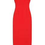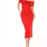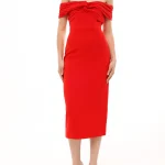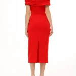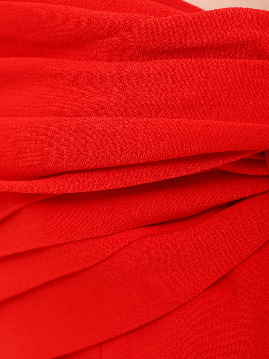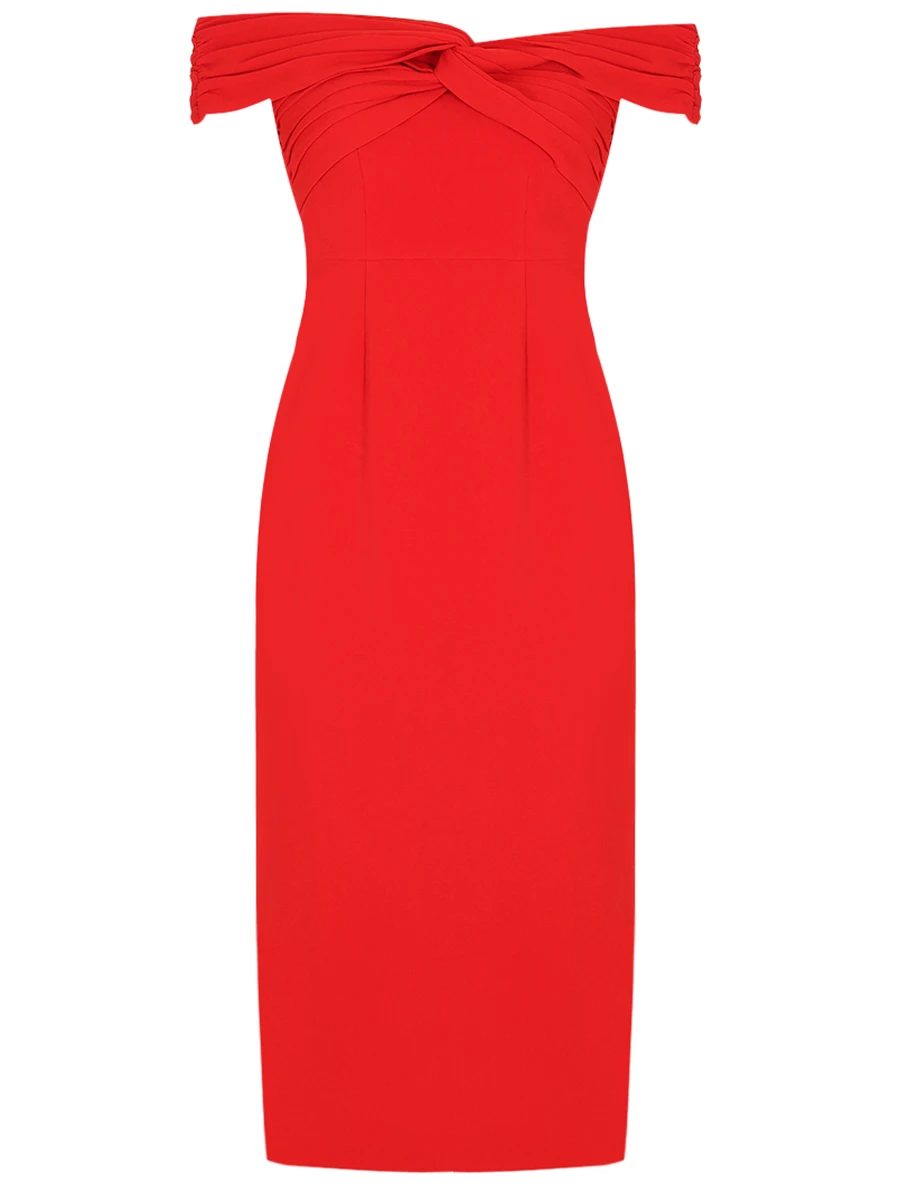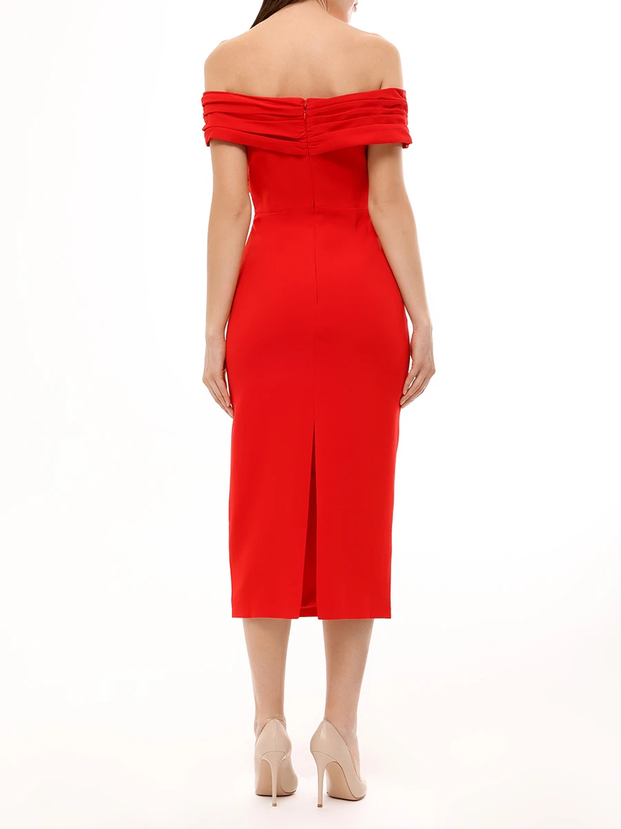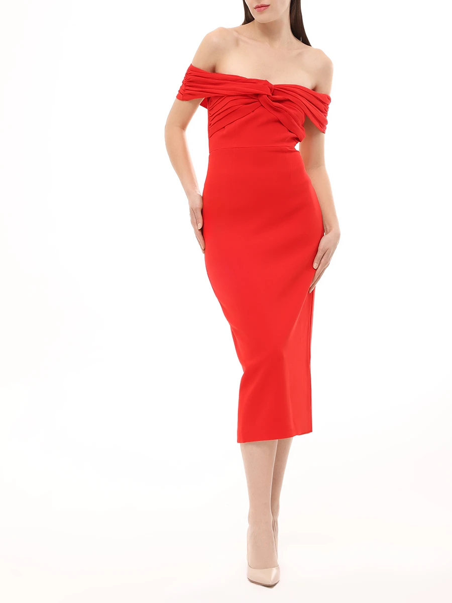 -Красное платье-миди купажированного состава от SELF-PORTRAIT. -Модель облегающего кроя с акцентом на талии и бедрах, открытой линией декольте и плечами, драпировками на груди, застежкой на потайную молнию. -Высокая шлица сзади обеспечивает комфортный шаг.