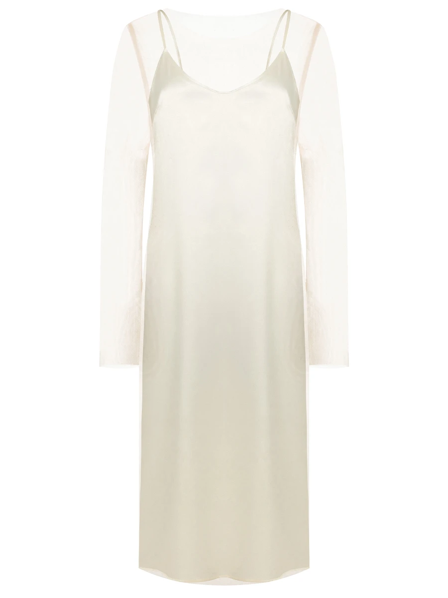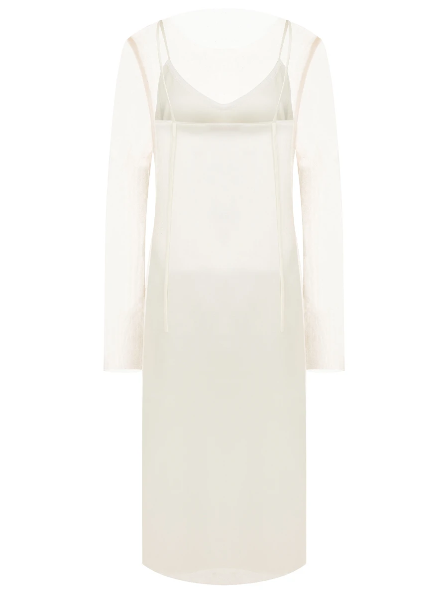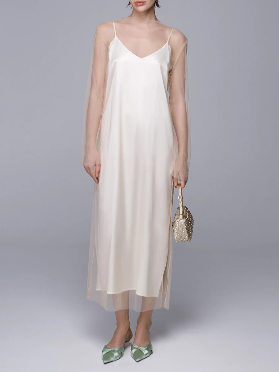 -Белое двойное платье с сеткой от FASHION REBELS. -Верхний слой из сетки сливается с цветом кожи и создает образ нежной и хрупкой девушки, а нижний слой — это комбинация из тонкого и нежного атласа с удлиненными декоративными бретелями и внутренней отделкой кружевом. -Минималистичное и утонченное платье создано для настоящей нимфы.