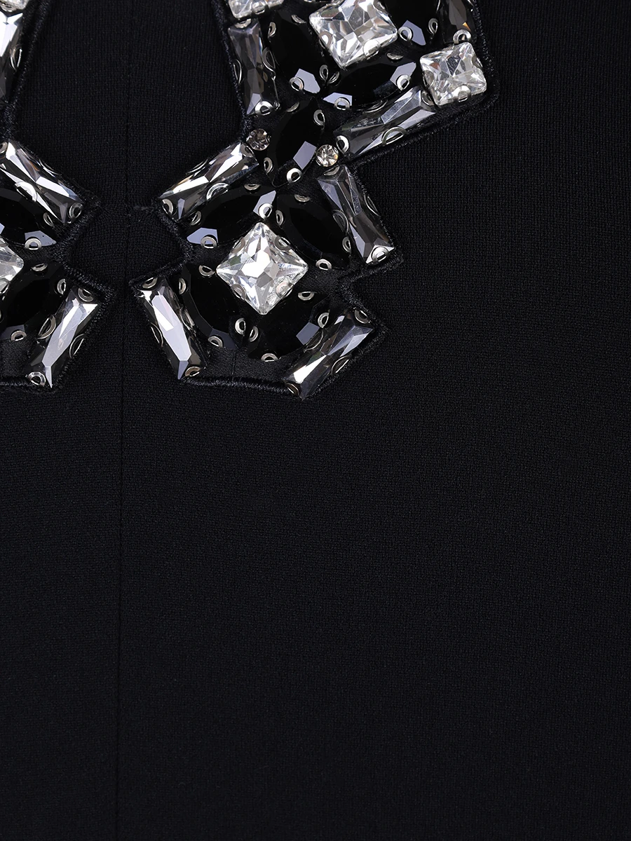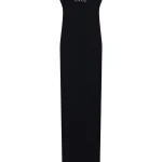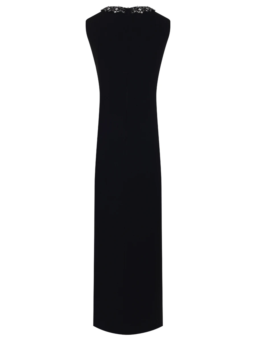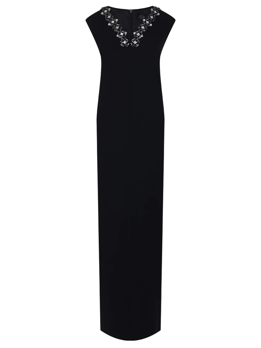 -Платье в черном цвете от MARINA RINALDI. -Модель полуприлегающего кроя без рукавов с V-образным вырезом горловины и застежкой на молнии. -В комплекте рукава, которые можно пришить по желанию. -Платье дополнит яркие вечерние образы с удобными туфлями.
