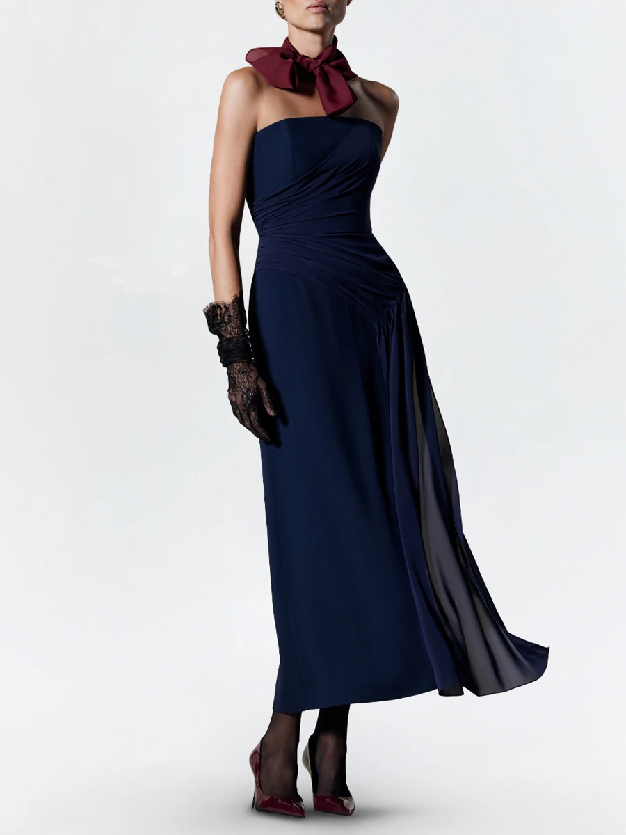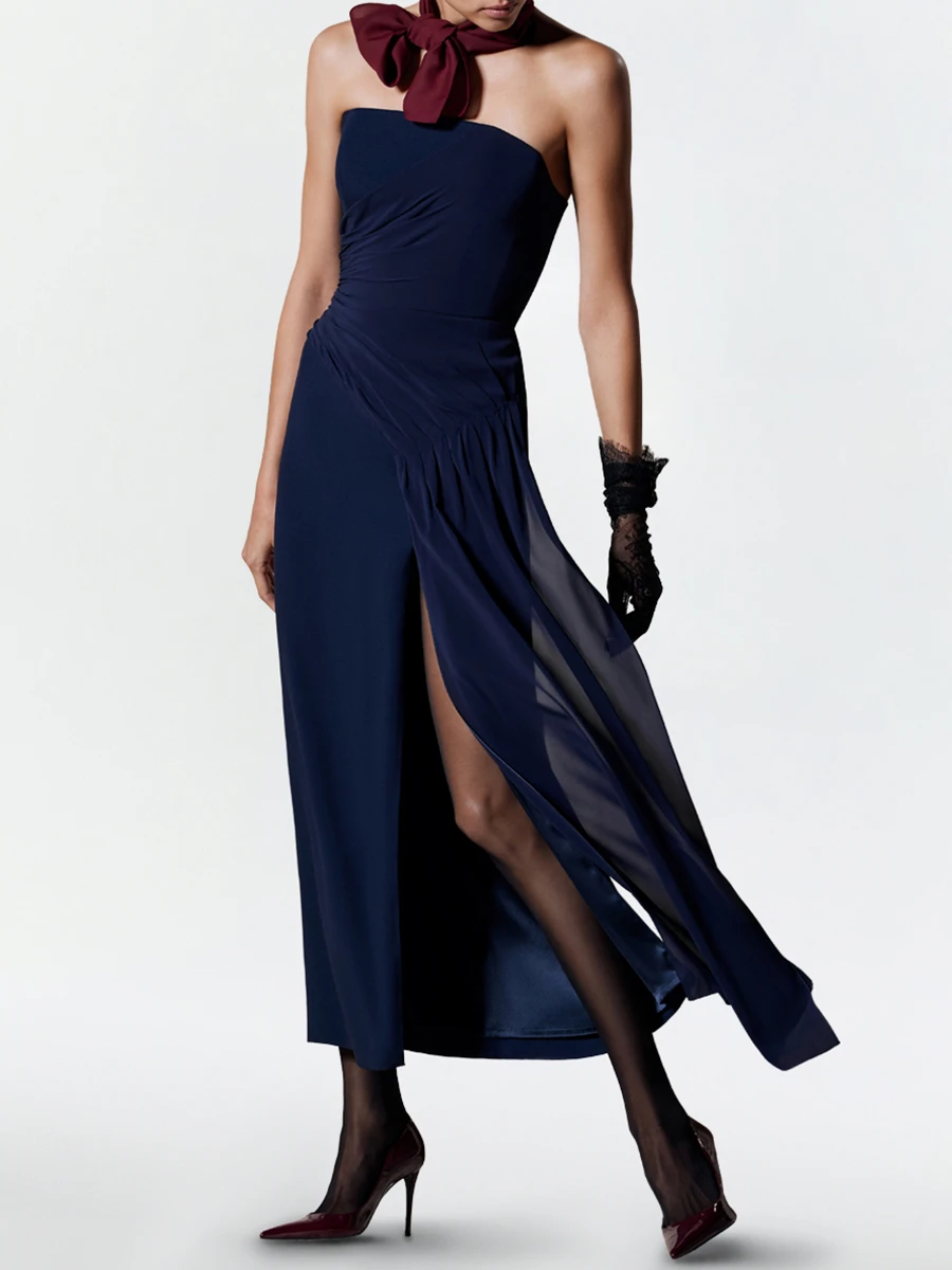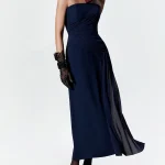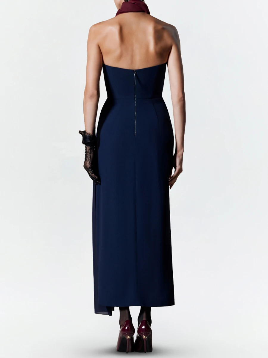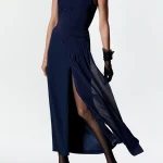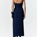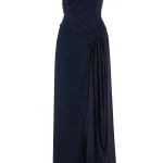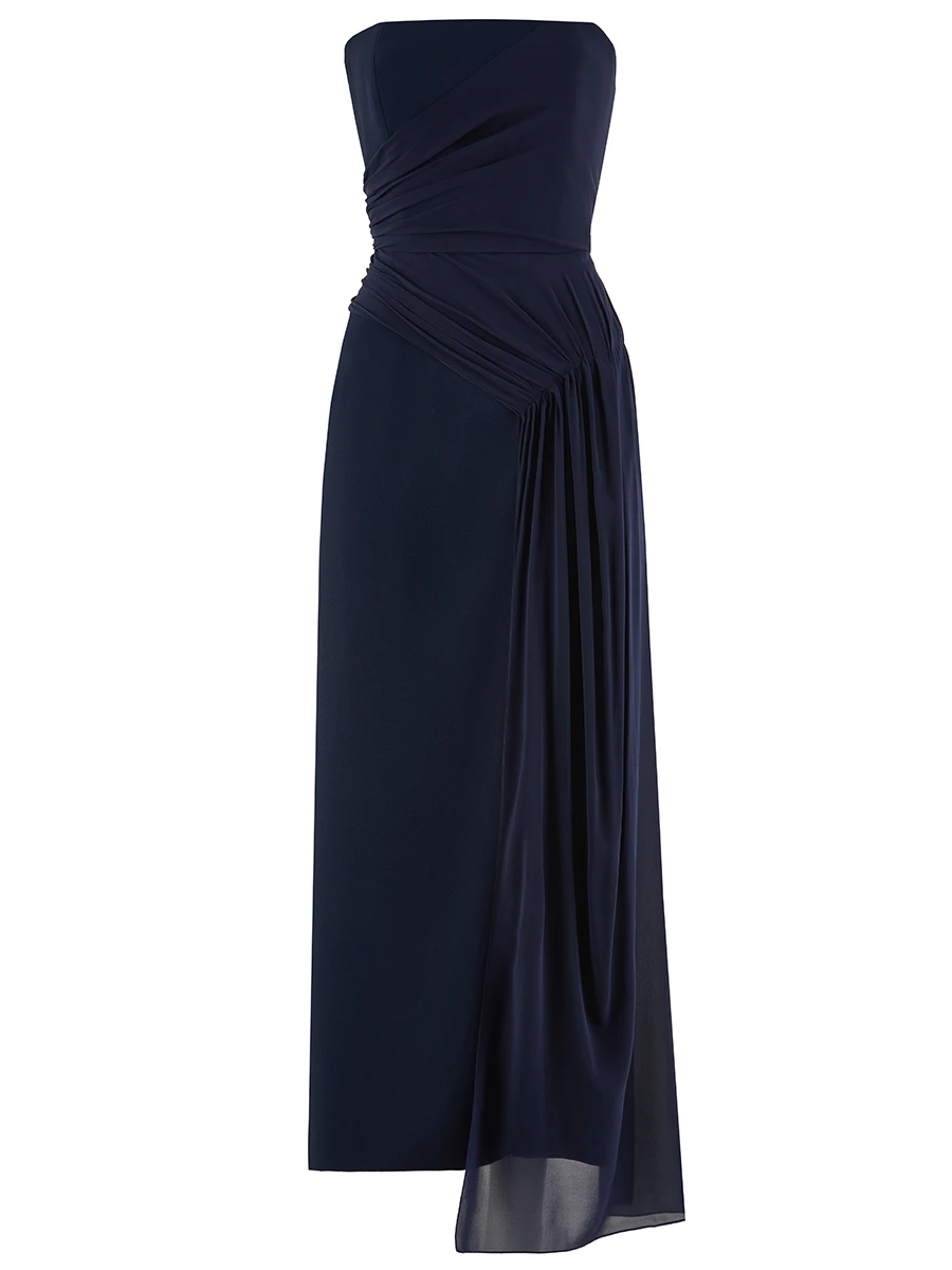 -Платье глубокого синего оттенка из ацетата от TAMI GEE. -Модель приталенного силуэта с открытой линией декольте и спинкой, шелковой вставкой с драпировкой, высоким боковым разрезом, изящно приоткрывающим ногу при каждом шаге и застежкой на молнию. -Классические линии кроя платья идеально обрисовывают женственный силуэт.
