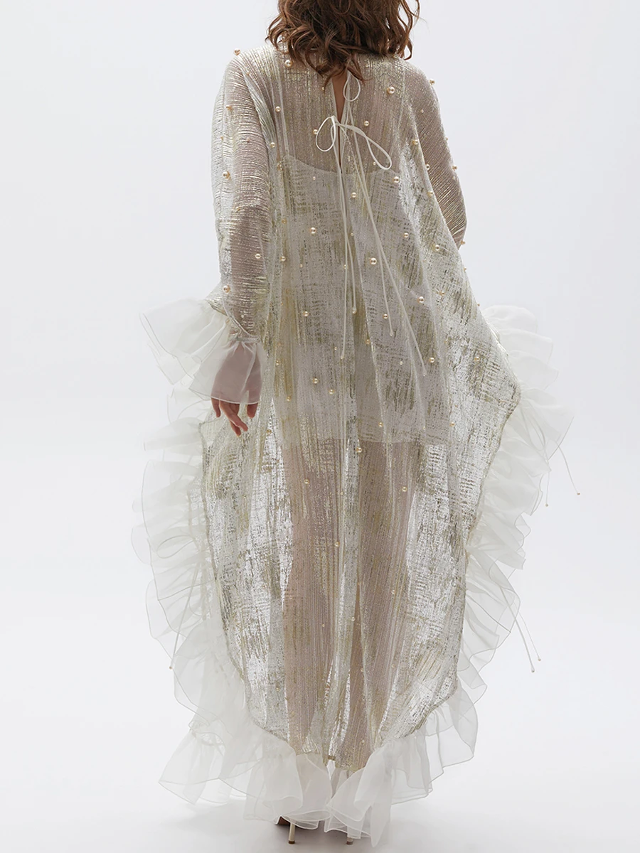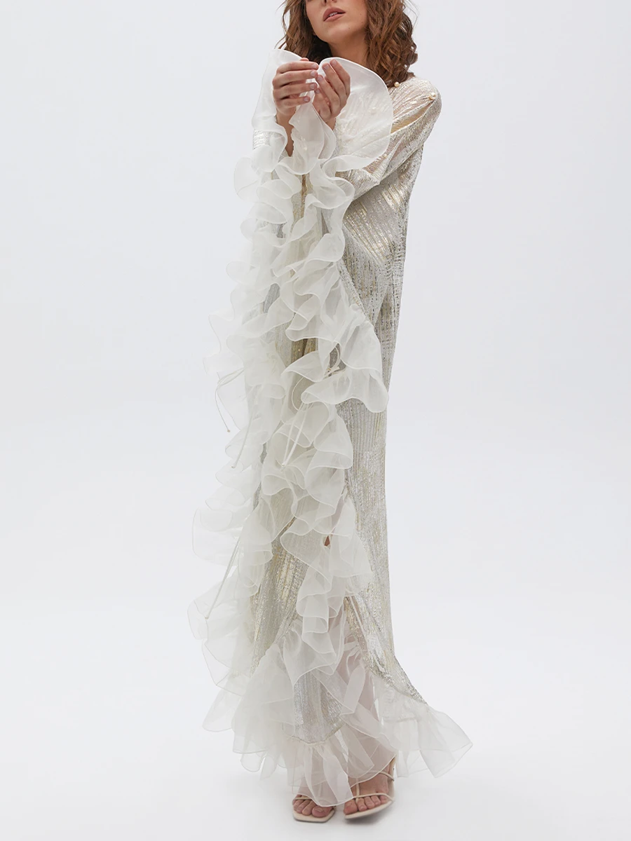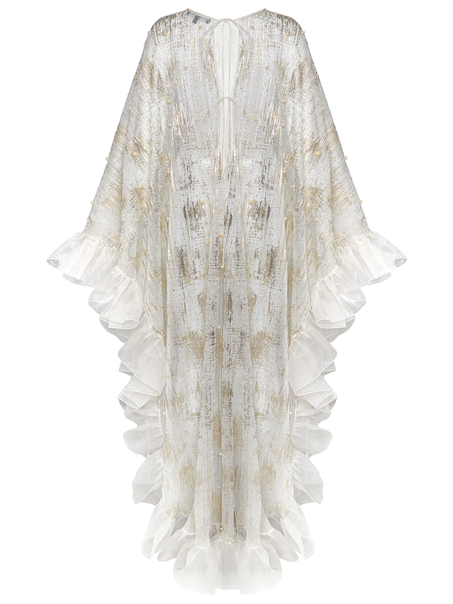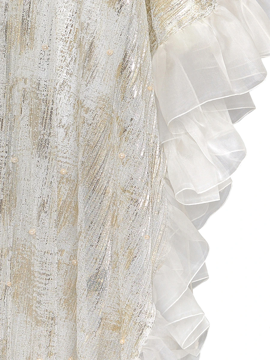 -Платье из белого плиссированного фатина с золотистым напылением от MAISON ESVE. -Объемная модель с широкими цельнокройными рукавами, оборкой из шелковой органзы, изящными завязками спереди и сзади. -Платье обильно украшено бусинами разного размера.