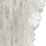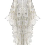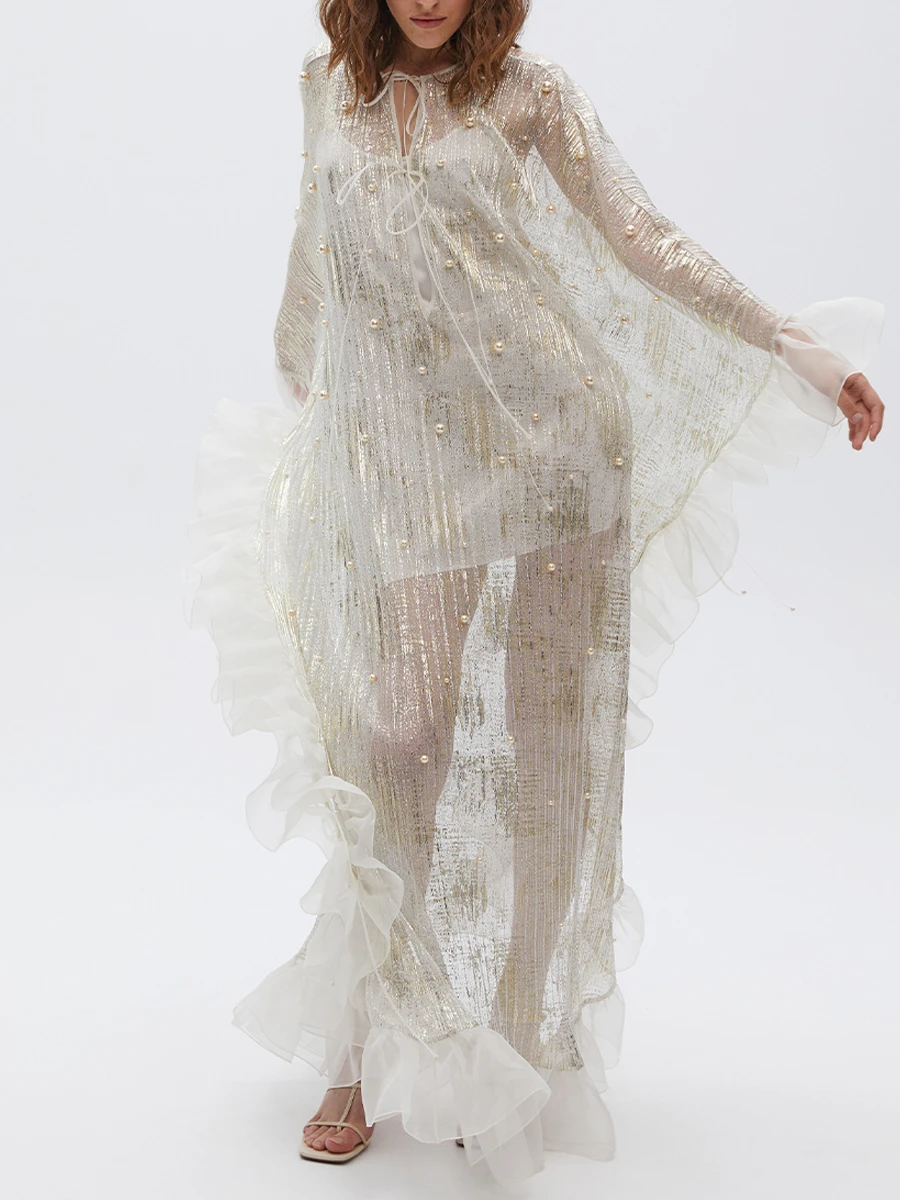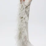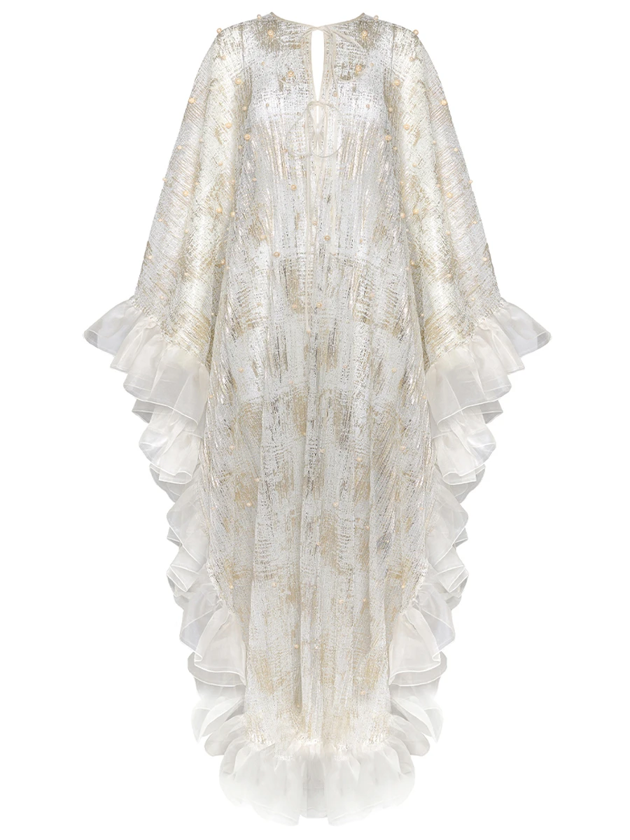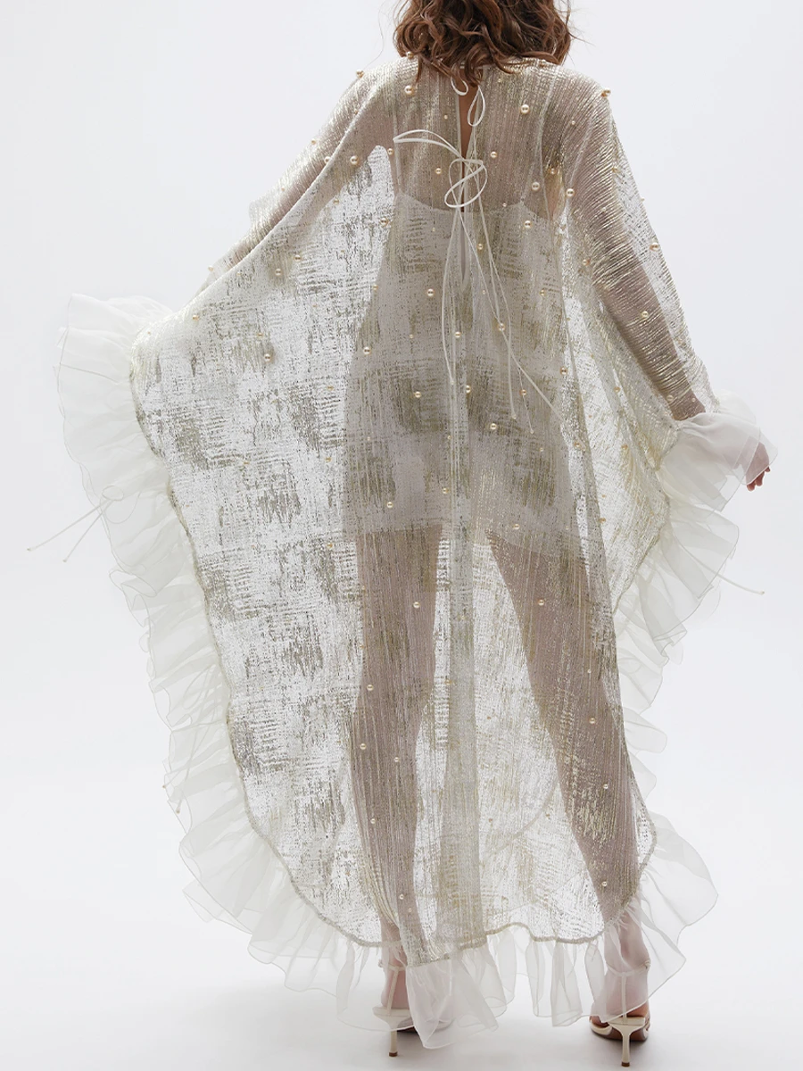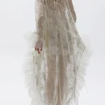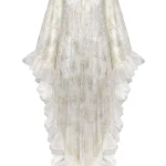 -Платье из белого плиссированного фатина с золотистым напылением от MAISON ESVE. -Объемная модель с широкими цельнокройными рукавами, оборкой из шелковой органзы, изящными завязками спереди и сзади. -Платье обильно украшено бусинами разного размера.