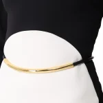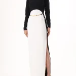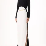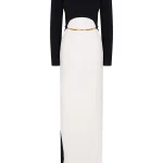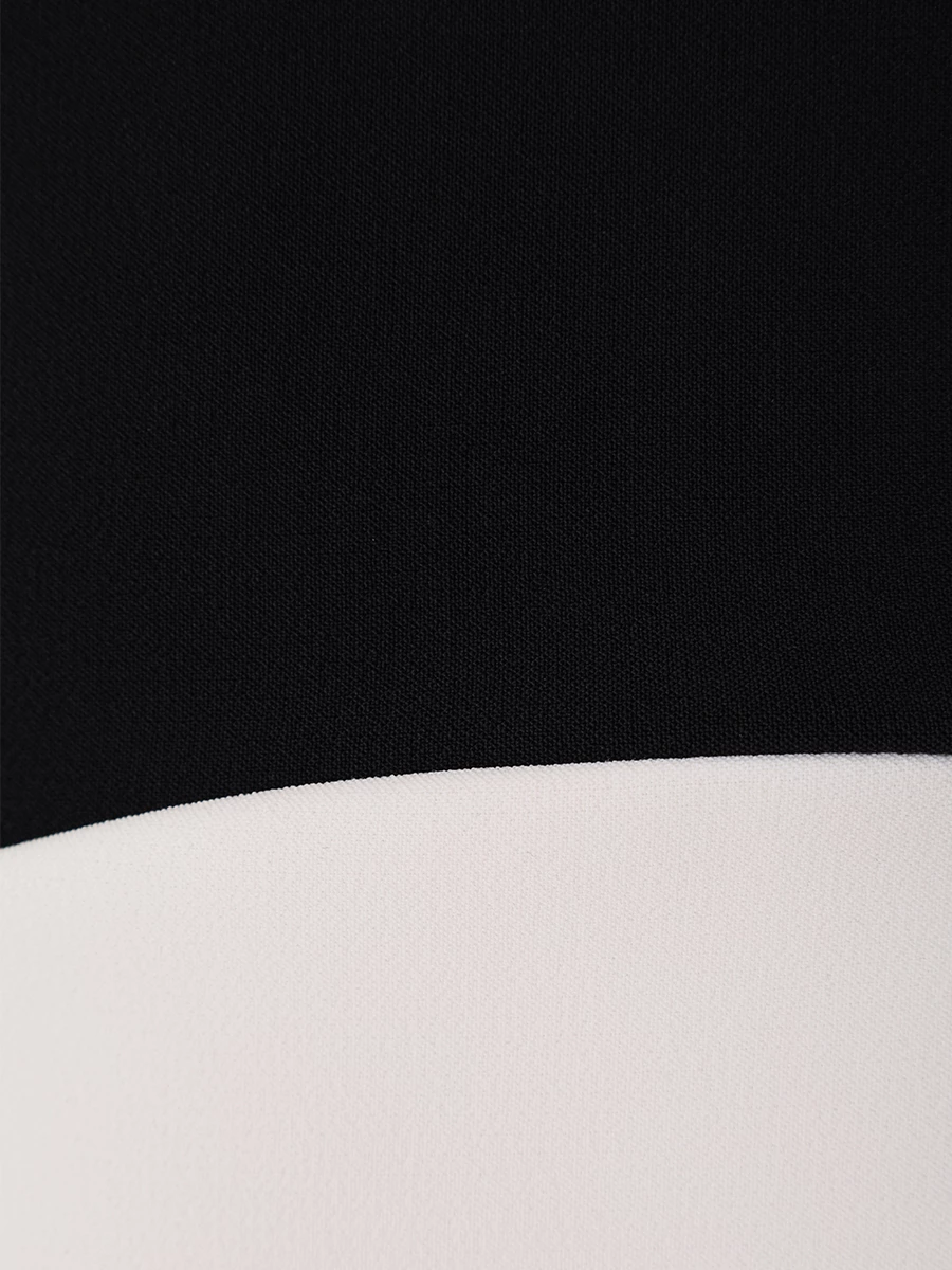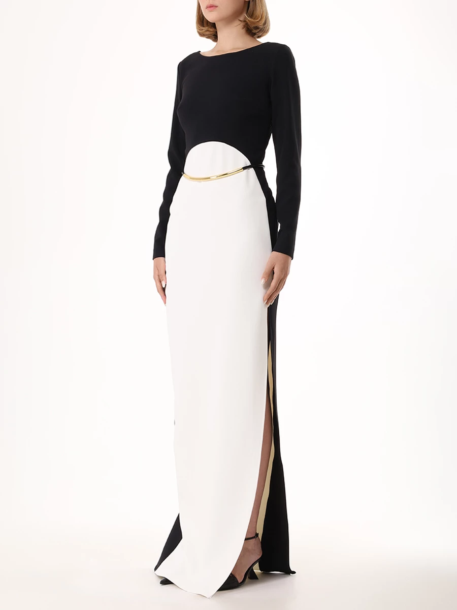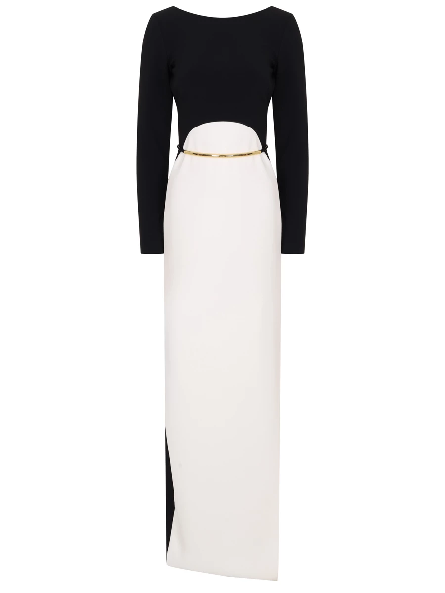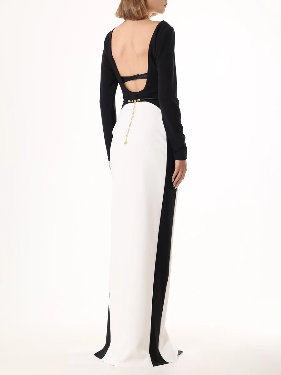 -Платье в стиле колор-блок из легкого крепа от ELISABETTA FRANCHI. -Модель оригинального кроя с длинными рукавами, вырезом на спинке и вертикально ниспадающей юбкой с высоким разрезом сбоку. -Линию талии подчёркивает трубчатый ремешок из золотистого металла.