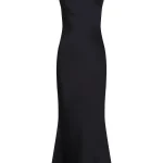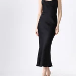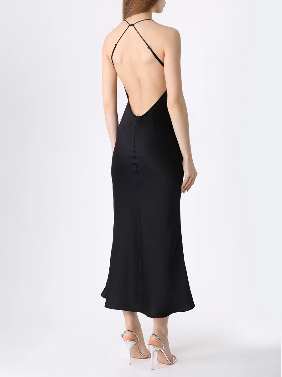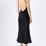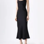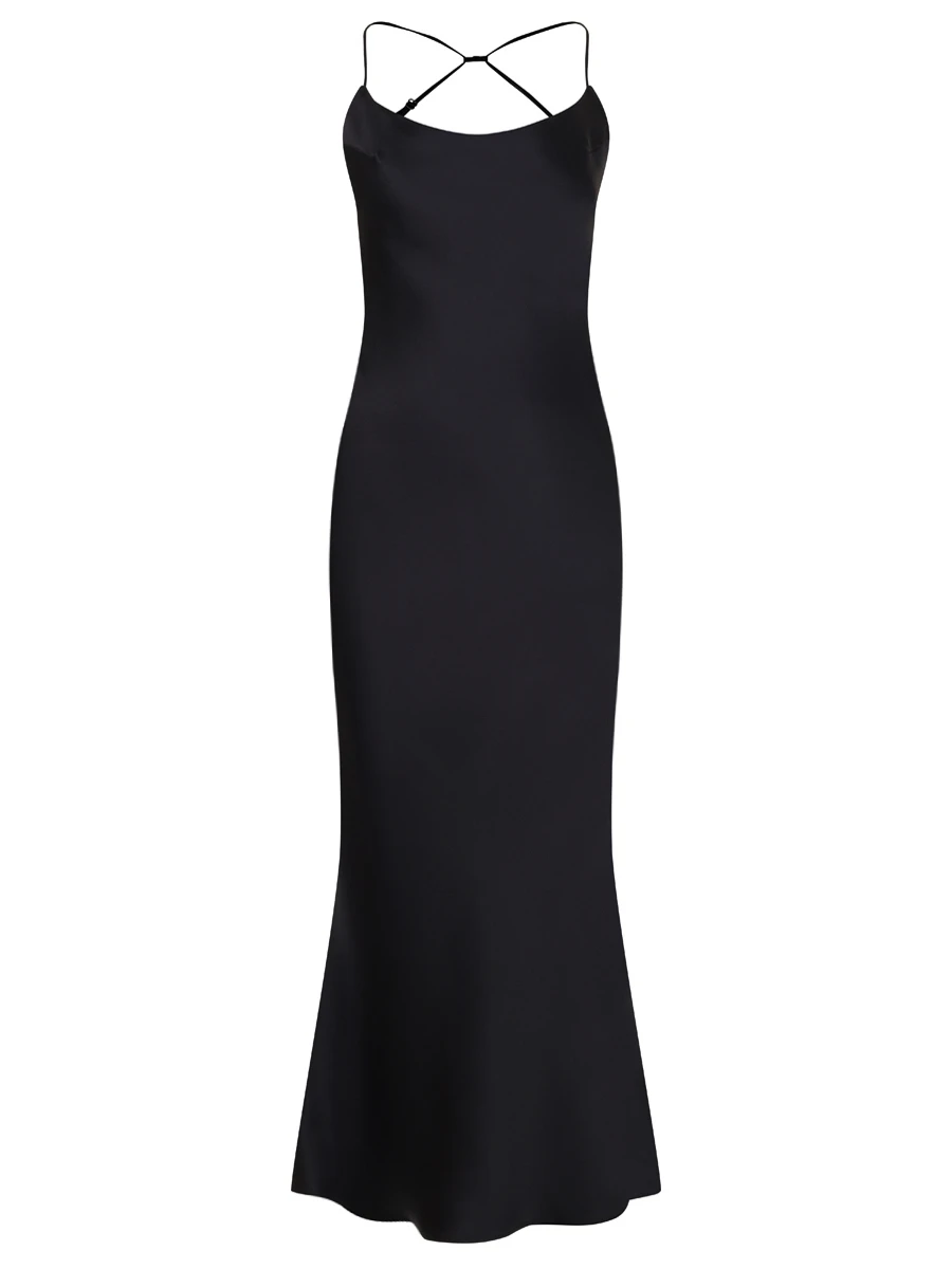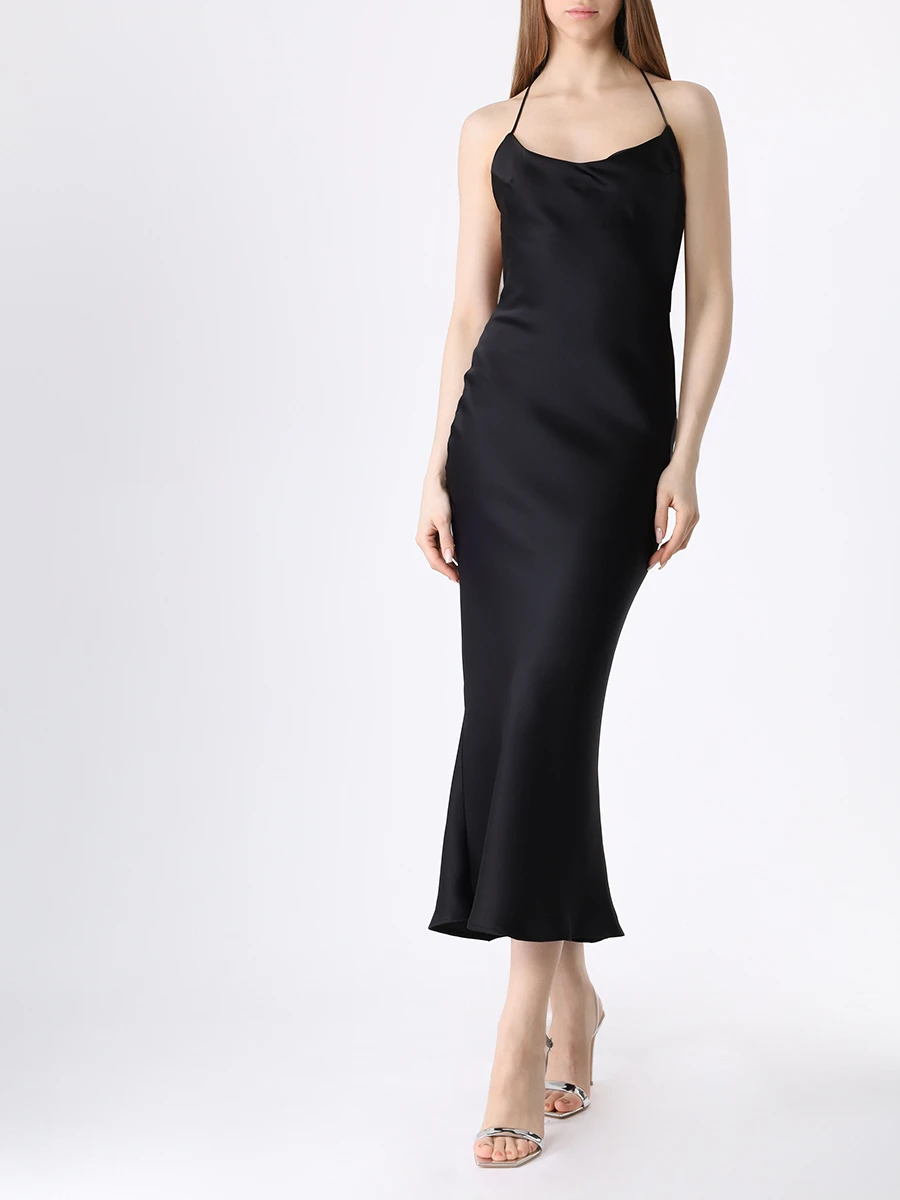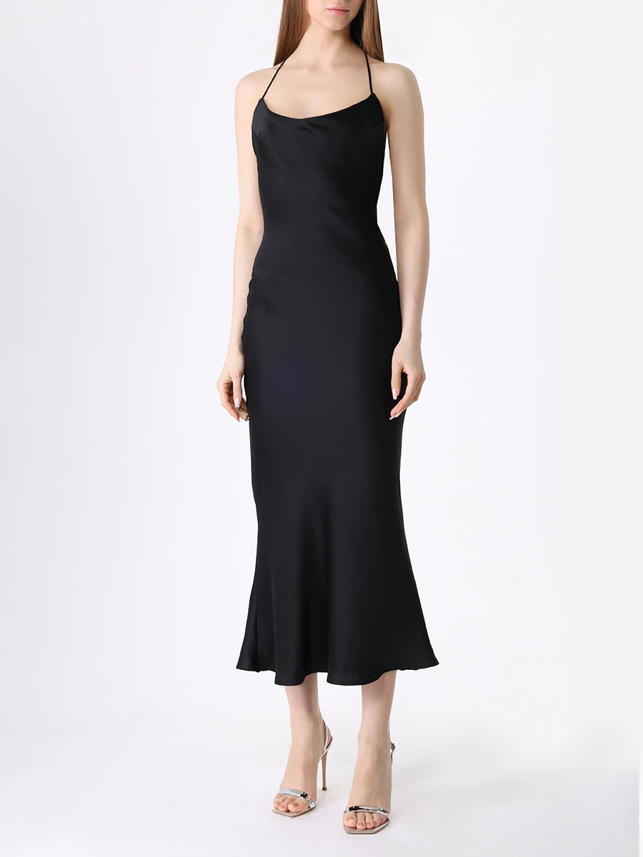 -Черное платье-миди из сатина от ROZIECORSETS. -Модель с облегающим бедра кроем, акцентом на талии, клешем к низу, глубоким вырезом на спине и узкими регулируемыми бретелями, которые обеспечивают индивидуальную комфортную посадку. -Юбка гармонично дополнит коктейльный образ с корсетом или топом и босоножками на высоких каблуках.