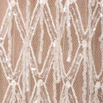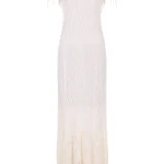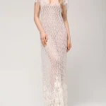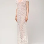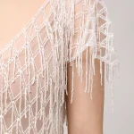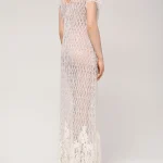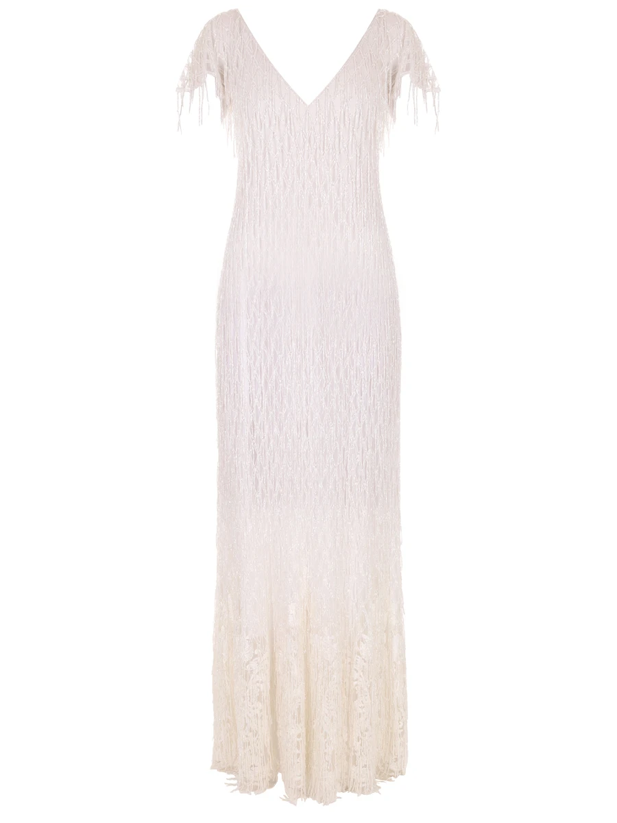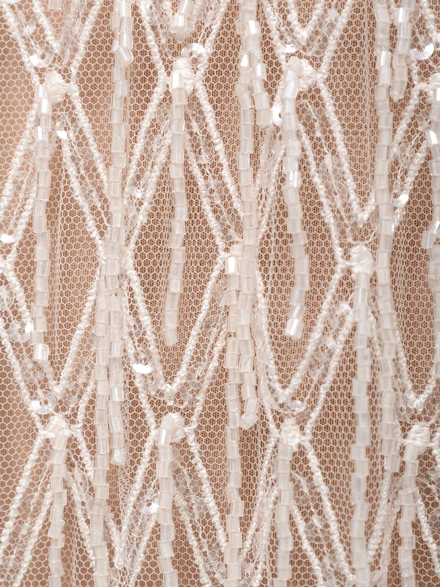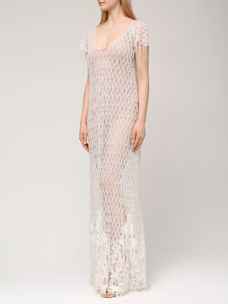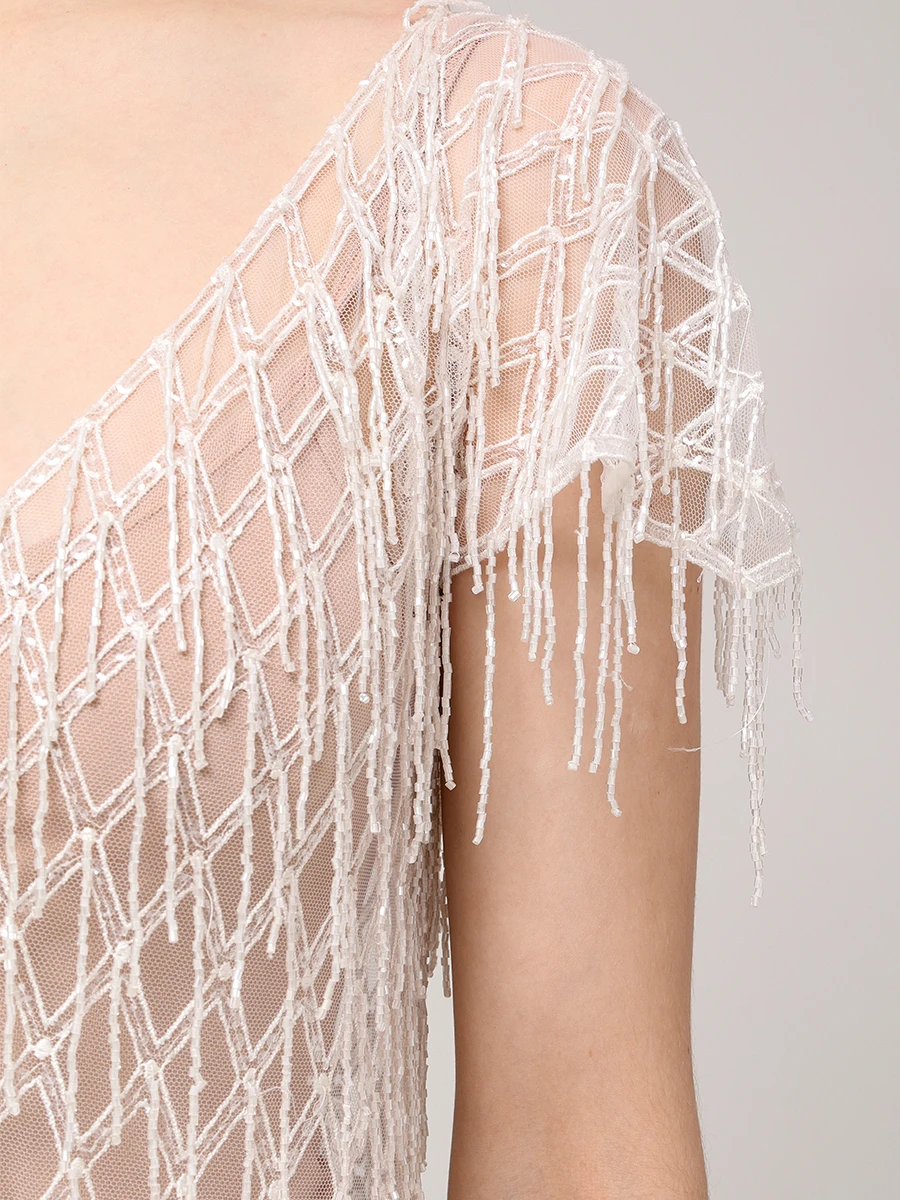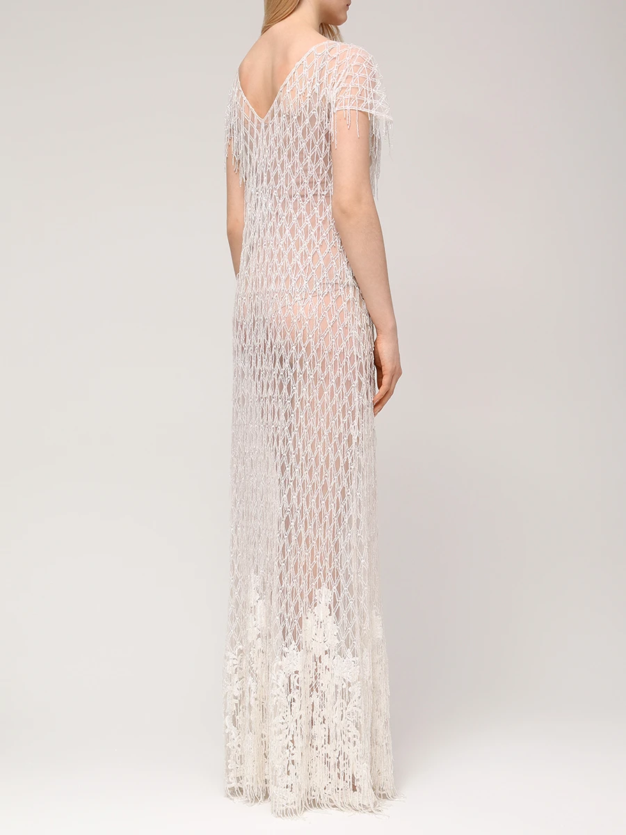 -Белое платье из сетки, расшитой стеклярусом и пайетками, от MASTERSUIT. -Полупрозрачная модель с короткими рукавами и V-образным вырезом горловины. -Изящная вышивка придает образу романтичность и легкость.
